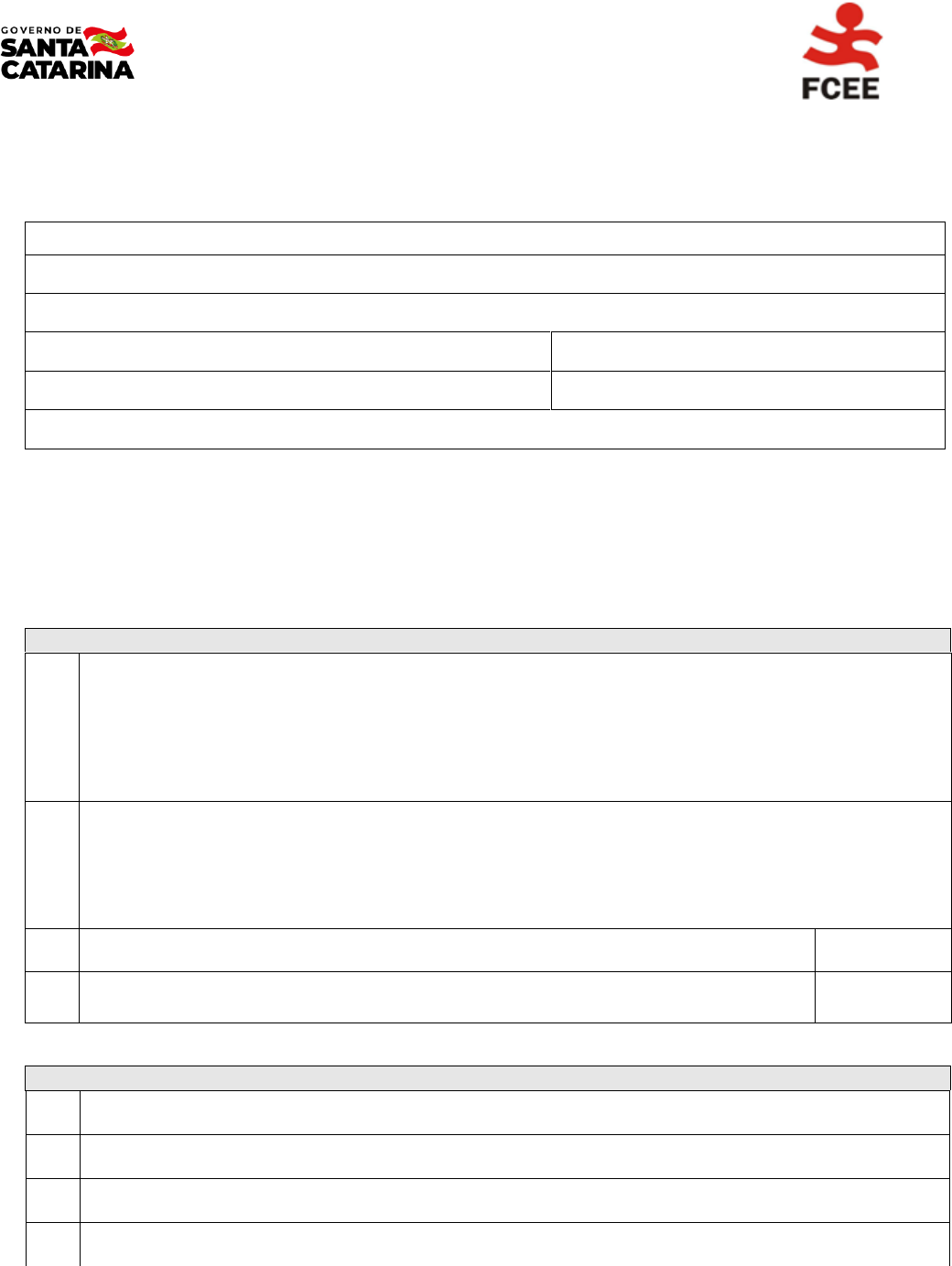 ESTADO DE SANTA CATARINA FUNDAÇÃO CATARINENSE DE EDUCAÇÃO ESPECIAL DIRETORIA DE ENSINO, PESQUISA E EXTENSÃO GERÊNCIA DE PESQUISA E CONHECIMENTOS APLICADOS CENTRO DE EDUCAÇÃO E VIVÊNCIA - CEVI FCEE - Construindo uma história de inclusão! Rua Paulino Pedro Hermes, nº 2.785 - Bairro Nossa Senhora do Rosário - São José/ SC - CEP 88108-900 Telefone: (48) 3664-4860 E-mail: fcee@fcee.sc.gov.br ORIENTAÇÃO DE PREENCHIMENTO DA AVALIAÇÃO MULTIDISCIPLINAR. AVALIAÇÃO MULTIDISCIPLINAR Data: Identificação Nome: Prontuário: Data de Nascimento: Idade: Diagnóstico: O perfil comunicativo e psicossocial deve ser elaborado todos os anos, visto a possibilidade de modificações no padrão do educando através das intervenções e relações estabelecidas, tal análise proporciona aos profissionais traçar habilidades/metas futuras, como também elaborar estratégias de atendimento e intervenções adequadas ao educando. PERFIL COMUNICATIVO 01 Linguagem Expressiva ( ) Pela fala ( ) Com gestos ( ) Expressões faciais ( ) Comunicação Alternativa ( fotos, figuras e ou pictogramas) ( ) Não apresenta intenção comunicativa Outros meios, quais? 02 Linguagem Receptiva ( compreender a palavra falada) Compreende solicitação simples ( ) Compreende duas ou mais solicitações ( ) Identifica fotos e ou figuras ( ) Identifica pictogramas ( ) Faz leitura ( ) 03 Transmite pequenos recados ( )Sim ( ) Não 04 Relata com coerência fatos e experiências ( )Sim ( ) Não PERFIL PSICOSSOCIAL 01 Solicita ajuda quando necessário?Como? 02 Interage com seus pares?Como? 03 Interage com pessoas de seu convívio social. Como? 04 Interage com pessoas estranhas?Como? ESTADO DE SANTA CATARINA FUNDAÇÃO CATARINENSE DE EDUCAÇÃO ESPECIAL DIRETORIA DE ENSINO, PESQUISA E EXTENSÃO GERÊNCIA DE PESQUISA E CONHECIMENTOS APLICADOS CENTRO DE EDUCAÇÃO E VIVÊNCIA - CEVI FCEE - Construindo uma história de inclusão! Rua Paulino Pedro Hermes, nº 2.785 - Bairro Nossa Senhora do Rosário - São José/ SC - CEP 88108-900 Telefone: (48) 3664-4860 E-mail: fcee@fcee.sc.gov.br 05 Faz contato visual ? Como? 06 Apresenta estabilidade de humor? Como? 07 Respeita regras estabelecidas? Como? 08 Participa das atividades propostas?Como? 09 Reage quando ocorre alguma mudança na rotina? Como? 10 Apresenta dificuldade de adaptação no grupo de referência? Como? 11 Estranha locais diferentes? Como? 12 Apresenta comportamento de isolamento? Como? 13 Expressa suas emoções? Como? 14 Demonstra intencionalidade em suas ações? Como? 15 Faz uso de tecnologia assistivas? Quais e como? A avaliação pedagógica deve analisar de que forma as habilidades elencadas durante o ano foram trabalhadas e os tipos de apoio que foram necessários para a aquisição da habilidade. é importante refletir sobre cada apoio: Apoio físico: acontece quando o profissional necessita conduzir fisicamente (trabalhar um mão sobre a outra) o educando na realização da atividade. Apoio Verbal: quando o profissional realiza um comando através da voz para conduzir o educando na realização da atividade. Apoio Visual: acontece quando educando ao olhar as fotos, pictogramas ou objetos transicionais realiza a atividade. AVALIAÇÃO PEDAGÓGICA ESCORE DEFINIÇÃO DOS APOIOS NECESSÁRIOS 0 Não Realiza 1 Apoio Físico 2 Apoio Verbal 3 Apoio Visual (figuras, objetos transicionais e gestos) 4 Realiza com Independência (estar ao lado em silêncio/supervisionar à distância) 5 Realiza com Autonomia (educando executa sozinho sem estímulos) As áreas aqui são as mesmas no PDI e as habilidades consequentemente são as elencadas no PDI também. Em relação aos Escores temos que o Escore Inicial irá mostrar como o educando estava antes da intervenção (no início do ano), já o Escore Final irá mostrar o quanto o educando avançou ou não depois das intervenções realizadas durante o período correspondente a avaliação. ESTADO DE SANTA CATARINA FUNDAÇÃO CATARINENSE DE EDUCAÇÃO ESPECIAL DIRETORIA DE ENSINO, PESQUISA E EXTENSÃO GERÊNCIA DE PESQUISA E CONHECIMENTOS APLICADOS CENTRO DE EDUCAÇÃO E VIVÊNCIA - CEVI FCEE - Construindo uma história de inclusão! Rua Paulino Pedro Hermes, nº 2.785 - Bairro Nossa Senhora do Rosário - São José/ SC - CEP 88108-900 Telefone: (48) 3664-4860 E-mail: fcee@fcee.sc.gov.br HABILIDADES ELENCADAS NO PLANO DE DESENVOLVIMENTO INDIVIDUAL ÁREA HABILIDADES ESCORE INICIAL ESCORE FINAL COGNIÇÃO PSICOMOTORA COMPORTAMENT O SOCIAL COMUNICAÇÃO INDEPENDÊNCIA PESSOAL RELATÓRIO DE INTERVENÇÃO PEDAGÓGICA: Realizar um texto sucinto que contemple as propostas pedagógicas utilizadas, as estratégias e como o educandos desenvolveram as atividades, sempre relacionando com as habilidades elencadas no PDI. Professor Mat.: Professora Mat.: Pedagoga Mat.: ESTADO DE SANTA CATARINA FUNDAÇÃO CATARINENSE DE EDUCAÇÃO ESPECIAL DIRETORIA DE ENSINO, PESQUISA E EXTENSÃO GERÊNCIA DE PESQUISA E CONHECIMENTOS APLICADOS CENTRO DE EDUCAÇÃO E VIVÊNCIA - CEVI FCEE - Construindo uma história de inclusão! Rua Paulino Pedro Hermes, nº 2.785 - Bairro Nossa Senhora do Rosário - São José/ SC - CEP 88108-900 Telefone: (48) 3664-4860 E-mail: fcee@fcee.sc.gov.br AVALIAÇÃO EQUIPE MULTIDISCIPLINAR Cada técnico da equipe multidisciplinar deverá realizar uma análise sucinta das intervenções realizadas em um determinado tempo, pontuando quais foram às estratégias foram utilizadas para proporcionar ao educando a aquisição das habilidades elencadas no PDI. INTERVENÇÃO DA FISIOTERAPIA NOME DO PROFISSIONAL CONSELHO PROFISSIONAL INTERVENÇÃO DA FONOAUDIOLOGIA NOME DO PROFISSIONAL CONSELHO PROFISSIONAL INTERVENÇÃO DA TERAPIA OCUPACIONAL NOME DO PROFISSIONAL CONSELHO PROFISSIONAL INTERVENÇÃO DA PSICOLOGIA NOME DO PROFISSIONAL CONSELHO PROFISSIONAL AVALIAÇÃO DE ARTES NOME DO PROFISSIONAL AVALIAÇÃO DE EDUCAÇÃO FÍSICA NOME DO PROFISSIONAL ESTADO DE SANTA CATARINA FUNDAÇÃO CATARINENSE DE EDUCAÇÃO ESPECIAL DIRETORIA DE ENSINO,
