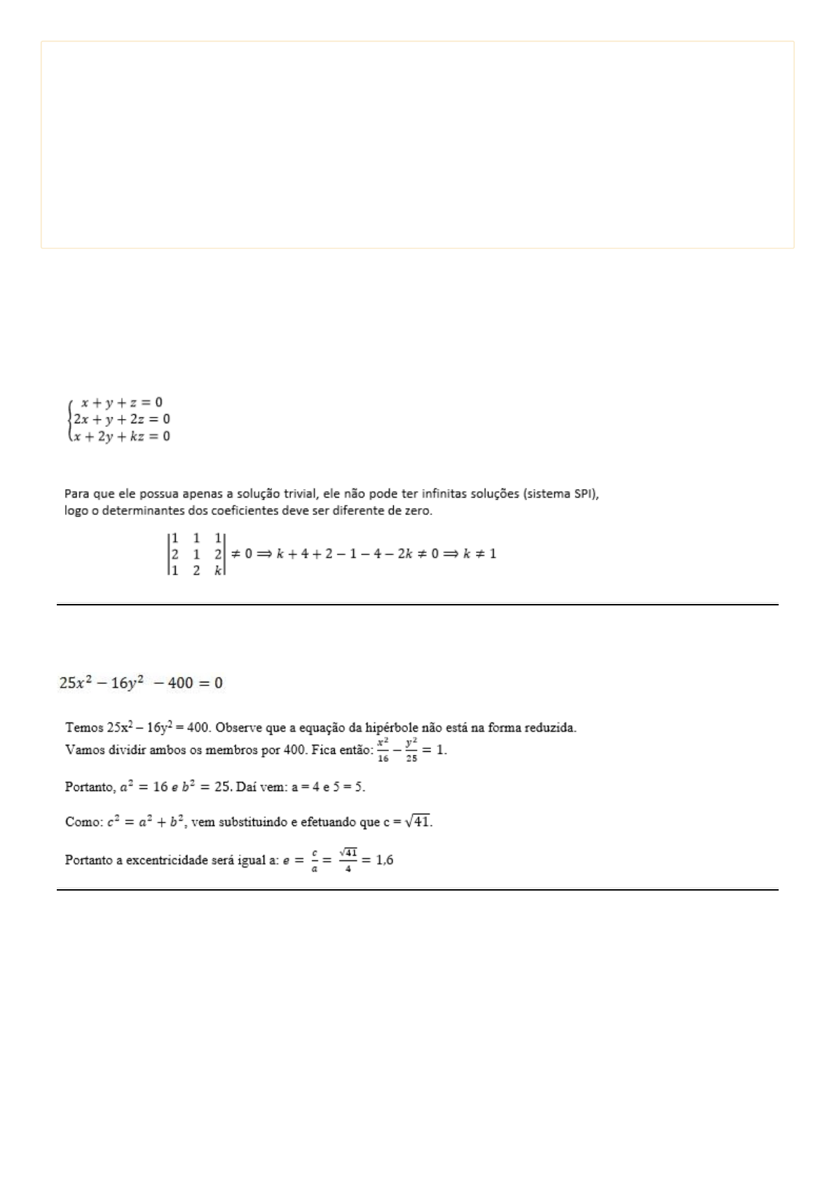 18/12/2020 UNIASSELVI - Centro Universitário Leonardo Da Vinci - Portal do Aluno - Portal do Aluno - Grupo UNIASSELVI https://portaldoalunoead.uniasselvi.com.br/ava/notas/request_gabarito_n2.php 1/1 Acadêmico: Edilaine Bortoluzzi (2783010) Disciplina: Geometria Analítica e Álgebra Vetorial (EMC02) Avaliação: Avaliação Final (Discursiva) - Individual Semipresencial ( Cod.:656382) (peso.:4,00) Prova: 26630005 Nota da Prova: 2,00 1. Em um sistema linear homogêneo seu conjunto solução (conjunto verdade) será sempre possível, ou seja, ao estudarmos um sistema homogêneo encontraremos sempre um sistema possível determinado ou possível indeterminado. O sistema linear será considerado possível, pois obterá pelo menos um conjunto solução o (0, 0, 0, ... , 0), esse conjunto é chamado de solução trivial, nula ou imprópria do sistema. Baseado nisso, determine o valor de k, para que o sistema homogênea seguir tenha apenas solução trivial. Resposta Esperada: . 2. A hipérbole é uma figura geométrica com algumas características no que se refere à simetria com relação ao ponto de excentricidade. Neste contexto, calcule o ponto de excentricidade da hipérbole de equação. Resposta Esperada: .