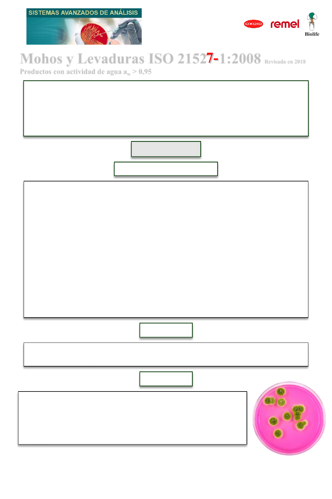 SISTEMAS AVANZADOS DE ANALISIS S.L. Cardenal Torquemada 24. 47010 VALLADOLID. Tno / Fax: 983 251143 Móvil: 637 596017 C.I.F.: B47700026 www.analisisavanzados.com 24012019 Mohos y Levaduras ISO 21527-1:2008 Revisada en 2018 Productos con actividad de agua aw > 0,95 In sc ri ta e l 3 1 o ct u b re d e 20 12 , e n e l R eg is tr o M er ca n ti l d e V al la d o lid , t o m o 1 42 9, f o lio 2 18 , i n sc ri p ci ó n 1 ª, h o ja V A -2 52 13 . Transferir a una placa de Agar DRBC, 0,1 mL de la muestra o 0,1 mL de la suspensión inicial en el caso de otros productos. Transferir a una segunda placas de Agar DRBC, 0,1 mL de la primera dilución decimal (10-1) en productos líquidos, o 0,1 mL de la dilución 10-2 en otros productos, En el caso de bajo número de hongos y levaduras, se pueden añadir volúmenes de muestra de hasta 0,3 mL de la dilución 10-1 en tres placas. Repetir estas operaciones con las correspondientes diluciones decimales. CM1149B Pre-supplemented Dichloran Rose-bengal Chloramphenicol (DRBC) (ISO) Agar (500 G) PO1227A Dichloran Rose Bengal Chloramphenicol (ISO) (20 placas) Procedimiento Siembra e Inoculación Se incuban las placas aeróbicamente boca arriba a 25ºC ± 1ºC durante 5 días Leer las placas entre los 2 y 5 días de incubación, seleccionando aquellas con menos de 150 colonias/propágulos/germinaciones. Si fuera necesario, contar las colonias de levaduras y de hongos por separado. Pueden ocurrir recuentos sin correlación con las diluciones, debido a efectos de fragmentación del micelio y otros. Incubación Recuento Preparación de las muestras y diluciones, dependiendo del tipo de muestra según ISO 6887-1,2,3,4:2004 ISO 7218 e ISO 8261 En Agua de Peptona 0,1 % ISO: BO0619M 0.1% PEPTONE WATER 10x100ML IN 125ML SIROP BO0619X 0.1% PEPTONE WATER 10x300ML IN 500ML SIROP