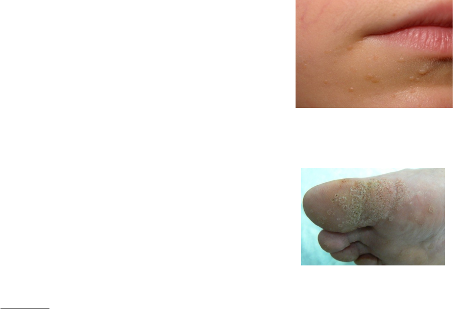 VERRUGAS Características Clínicas da Verruga Vulgaris (ou viral) · Hiperceratótica, exofítica (cresce para fora), nódulos ou pápulas em forma de cúpula. · Mais comuns: em dedos, dorso das mãos, joelhos ou cotovelos, mas podem ocorrer em qualquer lugar. · Pontos pretos representando capilares trombolisados. · Pode koebnerizar - se espalha com algum trauma na pele. · Assintomáticas. · Diagnóstico diferencial: se for calo as linhas da pele passa por cima. Epidemiologia: · Um dos três problemas de pele com maior incidência em crianças. · Verrugas cutâneas ocorrem em 20% dos escolares; também é comum em adultos jovens. · Homens e mulheres são igualmente afetados. HPV · Verrugas são causadas pelo HPV. · Infecta pele e mucosas epiteliais. · Pode causar diferentes morfologias das verrugas: · Verruca Vulgaris: verrugas comuns. · Verrucae planae: verrugas planas. · Verrugas palmoplantares. · Condyloma acuminata: verrugas genitais externas. · O tipo do HPV determina a morfologia da verruga. · Pode ser transmitido por contato pele-pele ou através de superfícies e objetos contaminados. · Pacientes podem espalhar a lesão para áreas não afetadas · Infecta os queratinócitos basais do epitélio cutâneos e de mucosas. Características Clínicas da Verrucae Planae (Verrugas Planas) · Cor de pele ou rosadas. · Superfície macia, levemente elevada, pápulas com topo plano. · Costas das mãos, braços, face (superfícies expostas). · Pápula ou nódulo exofítico (cresce para fora) e hiperqueratinócica. Tratamento para Verruga plana: · Primeira linha: · Crioterapia · Ácido salicílico · Tretinoína tópica (principalmente, se verruga em face). Características clínicas da Verruga Palmoplantar: · Áspera, pápulas endofíticas. · Podem ser dolorosas. · Depressão central. · Verrugas plantares podem ser dolorosas ao caminhar. · Verruga em mosaico: verrugas plantares coalescendo em placas maiores. Tratamento para Verruga Palmoplantar: · Primeira linha é a mesma das terapias comuns de verruga (geralmente com maior dose). · Podem ser usados agentes quimioterápicos · Crioterapia ou 5-fluorouracil tópico. Princípios gerais para tratamento de verrugas · A maioria das verrugas vão se resolver em 1-2 anos espontaneamente sem cicatrizes. · Logo, é importante escolher uma terapia com baixa toxicidade e pouco risco de desenvolver cicatrizes. · Não há terapia antiviral específica para se obter cura. · A maioria dos tratamentos é destrutiva ou estimula o sistema imunológico contra o HPV. · Altos índices de recorrência. Opções comuns para tratar verrugas: · Conduta expectante. · Crioterapia - nitrogênio líquido. · Ácido salicílico - com oclusão e remoção da pele morta (Verrux e duofilm calicidas) · Pacientes que não responderem a esses, encaminhar para dermatologista. Crioterapia · Efeitos colaterais incluem: · PIPA (Alteração da pigmentação pós-processo inflamatório) · Em indivíduos negros, hipopigmentação. · Cicatrizes · Dor · Bolhas · Distrofia de unhas Características clínicas das verrugas genitais externas · Pápulas sésseis, exofíticas. · Podem ter uma grande base ou serem formadas de grandes placas confluindo. · Principalmente: genitália externa, períneo, perianal, prega inguinal e mons pubis. · Diagnóstico diferencial: molusco contagioso (vírus do gênero Poxvírus), as características clínicas são bolhas peroladas, lisas, comum em crianças, em adultos nos genitais; sexualmente transmissível. Infecção por HPV: · A infecção genital do HPV é transmitida pelo contato sexual dos parceiros com infecção clínica ou subclínica. Clinical Presentation Frequently Associated HPV Type External genital warts High grade intraepithelial Neoplasia 6, 11 16, 18,31, 33-35, 40, 45 · É uma das DSTs mais comuns. · Fatores de risco: relações sexuais precoces, promiscuidade, exposição desprotegida. · Imunossupressão por HIV, transplante de órgãos podem levar pior quadro clínico, aumento da frequência da infecção pelo HPV; infecções persistentes; maior dificuldade no tratamento. · Para tratar Verrugas Genitais Externas: Laser, eletrocautério (usar máscara sempre!) e curetagem, desbridamento cirúrgico. · Iniquimod: baixo índice de cura, muitos meses de TTO; CARO. Iniquimod – usado em verrugas externas presentes nas regiões genital e perianal (condiloma acuminado), em pacientes com idade igual ou superior a 12 anos; potencializa a produção do interferon, que tem efeito antiviral, antiproliferativo e antiangiogênico.