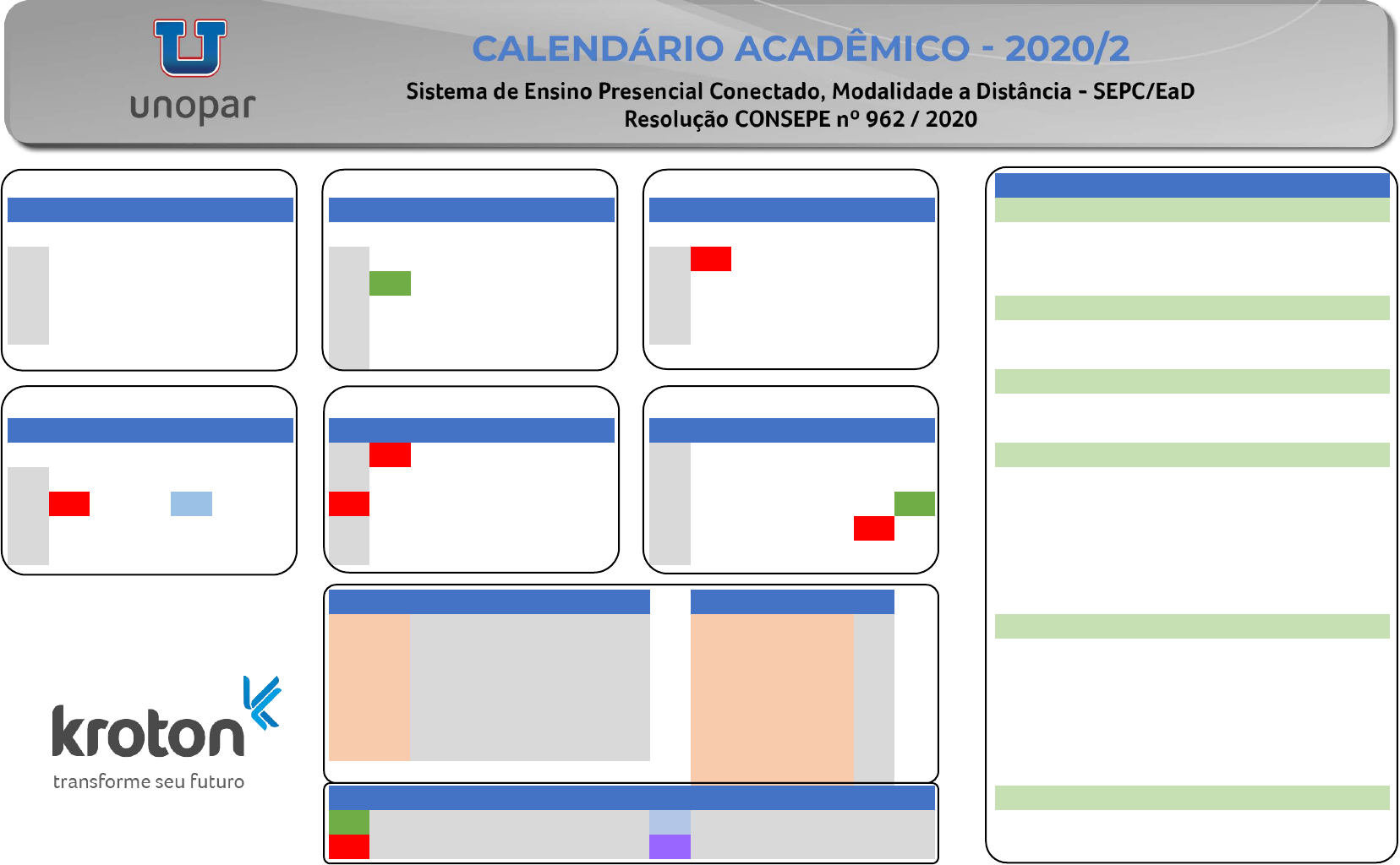 D S T Q Q S S D S T Q Q S S D S T Q Q S S Dias Letivos: 19 1 2 3 4 1 1 2 3 4 5 10 - Início do Período Letivo 2020.2 5 6 7 8 9 10 11 2 3 4 5 6 7 8 6 7 8 9 10 11 12 29 - Colação de Grau para Formandos 2020.1 12 13 14 15 16 17 18 9 10 11 12 13 14 15 13 14 15 16 17 18 19 19 20 21 22 23 24 25 16 17 18 19 20 21 22 20 21 22 23 24 25 26 SETEMBRO Dias Letivos: 25 26 27 28 29 30 31 23 24 25 26 27 28 29 27 28 29 30 14 a 19 - Semana de Prova para a 1ª disciplina 30 31 OUTUBRO Dias Letivos: 25 05 a 10 - Semana de Prova para a 2ª disciplina D S T Q Q S S D S T Q Q S S D S T Q Q S S 1 2 3 1 2 3 4 5 6 7 1 2 3 4 5 NOVEMBRO Dias Letivos: 24 4 5 6 7 8 9 10 8 9 10 11 12 13 14 6 7 8 9 10 11 12 09 a 14 - Semana de Prova para a 3ª disciplina 11 12 13 14 15 16 17 15 16 17 18 19 20 21 13 14 15 16 17 18 19 16 a 21 - Prova de 1ª Chamada - Proficiência 18 19 20 21 22 23 24 22 23 24 25 26 27 28 20 21 22 23 24 25 26 25 26 27 28 29 30 31 29 30 27 28 29 30 31 30 a 05 - Semana de Prova para 4ª disciplina 16 DEZEMBRO Dias Letivos: 17 07 - Independênciado Brasil 19 07 a 12 - 2ª chamada de Todas as Disciplinas 19 14 a 19 - Recuperação de Todas as Disciplinas 18 19 - Fim do Período Letivo 2020.2 NOVEMBRO 02 - Finados / 15 - República 19 19 - Último dia do Coletor 25 - Natal 19 110 Dias Letivos: 0 Início/Término do Período Letivo Recesso Escolar 09 - Fim do Período de Colegiado Feriado Nacional Feriado Municipal CRONOGRAMA AGOSTO OUTUBRO NOVEMBRO DEZEMBRO SETEMBRO Terças - Feiras JULHO AGOSTO SETEMBRO 23 a 28 - Prova de 1ª Chamada - Paralela Online/Adaptação e Dependência FERIADOS, RECESSOS E FÉRIAS DIAS LETIVOS AGOSTO Segundas - Feiras 23 - Divulgação do Boletim / Início do Período de ColegiadoTotal de dias letivos LEGENDA JANEIRO OUTUBRO 12 - Nossa Senhora da Aparecida / 15 - Dia do Professor Quartas - Ferias Quintas - Feiras Sextas - Ferias DEZEMBRO Sábados 2020.2 - UNOPAR