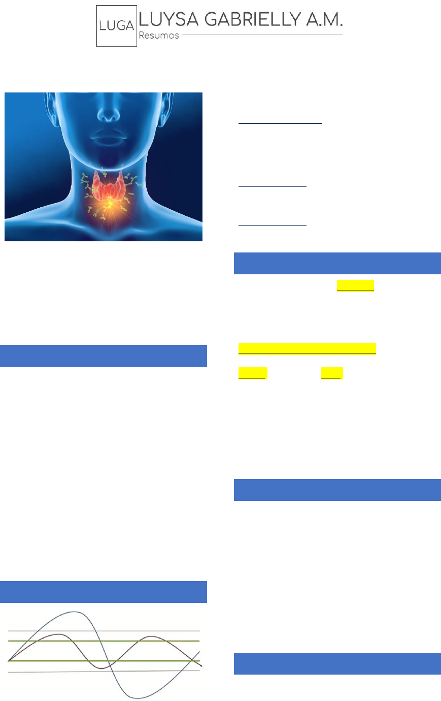 Luysa Gabrielly de Araujo Morais – Medicina - @lugaaraujo TIREOIDITES É um termo genérico para o acometimento inflamatório da glândula tireoide Pode ter como etiologia diversos fatores como: autoimune, infeccioso, traumático, drogas, radiação etc. TIPOS TIREOIDITE DE HASHIMOTO (TIREOIDITE CRONICA LINFOCÍTICA) TIREOIDITE SUBAGUDA LINFOCÍTICA TIREOIDITE SUBAGUDA GRANULOMATOSA TIREOIDITE PÓS PARTO TIREOIDITE INFECCIOSA TIREOIDITE MEDICAMENTOSA TIREOIDITE ACTÍNICA TIREOIDITE FIBROSANTE DE REIDEL TIREOIDITE SUBAGUDA LINFOCÍTICA Elevação dos hormônios tireoidianos na periferia sem que isso gere um quadro clínico de tireotoxicose. Mas com o passar do tempo pode gerar quadro de tireotoxicose e evolução para hipotireoidismo. Autolimitada; QUADRO INICIAL →laboratorial (achado) ou tireotoxicose Anti TPO e anti tg até 50% dos casos DIAGNÓSTICO → clínica + RAIU (pouco disponível) TRATAMENTO → reposição de L4T (se evoluir para hipotireoidismo) e beta bloqueador TIREOIDITE DE DE QUERVAIN Tireoidite subaguda dolorosa e tireoidite granulomatosa Dor na região cervical +/- tireotoxicose Quadro pós viral há 1-3 semanas Febre, leucocitose e VHS +/- corticoides Tratamento – AINE +/- corticoides 50% dos casos pode evoluir para Hashimoto DOR (apenas ela e infecciosa) + quadro viral como fator comum antecessor. TIREOIDITE PÓS PARTO Quadro agudo subaguda linfocítica 1 ano pós parto →2º-4º mês Anti TPO Recidiva alta 70% Variante TH Tratamento → beta bloqueador +/- L4T TIREOIDITE INFECCIOSA Dor + febre + sinais flogísticos presentes Aguda e piogênica Tuberculosa e fúngica Luysa Gabrielly de Araujo Morais – Medicina - @lugaaraujo Pode ter histórico de cirurgia (porta de entrada) TIREOIDITE MEDICAMENTOSA Amiodarona MEDCURSO 2018 DEFINIÇÃO: Acometimento inflamatório da tireoide que gera lesão inflamatória no parênquima tireóideo culminando com o extravasamento do conteúdo coloide dos folículos (T3/T4). Gerando quadros de tireotoxicose inicial, seguida de hipotireoidismo autolimitado, subagudo ou, em alguns casos, franco. TIREOIDITE DE HASHIMOTO TH ETIOPATOGENIA: Reação imune via celular e humoral (fator genético) + Fatores ambientais (infecções virais e consumo de iodo). Ocorre formação de imunocomplexos na membrana basal das células foliculares levando à infiltração linfocitária e hiperplasia folicular. Anti tireoperoxidase - TPO 95-100% dos casos. → Maior sensibilidade em tireoidites auto imunes; caso negativo solicitar o anti TG (tireoglobulina). Anti TG (tireoglobulina) + ANTI TPO → juntos tem sensibilidade de 95-100%. QUADRO CLÍNICO: 1. FASE: Hashitoxicose 2. FASE: Hipotireoidismo subclínico - elevação do TSH com T4 e T3 normal. 3. FASE: Hipotireoidismo clinicamente manifesto. TIREOIDITE ATRÓFICA - casos de evolução tardia da TH, com anticorpos positivos, sem bócio e com hipotireoidismo. Associação com outras doenças autoimunes em especial a doença celíaca. ENCEFALOPATIA DE HASHIMOTO: altos títulos de anti TPO; tem boa resposta a glicocorticoides; manifestações semelhantes as manifestações de AVC, convulsões, psicose, aumento de proteínas no líquor e alterações no eletroencefalograma. DIAGNÓSTICO: Bócio + hipotireoidismo + Anti TPO aumentado Presença de hipotireoidismo não é obrigatória para o diagnóstico. HISTOPATOLÓGICO→ Infiltrado linfocítico podendo gerar centros germinativos linfoides. Células de Askanazy são patognomônicas e representam estágio avançado da lesão de células foliculares. USG→ glândula aumentada, hipoecogênica ou nódulos mal definidos. PAAF (CRITÉRIOS) → dor Local; crescimento rápido; presença de nódulos TRATAMENTO Reposição adequada de hormônio Glicocortidoides caso dor tireoidiana importante ou bócio de crescimento rápido com sintomas compressivos. TIREOIDITE SUBAGUDA LINFOCÍTICA Indolor; Tireotoxicose seguida de hipotireoidismo autolimitado; Anti TPO positivo em títulos mais baixos que TH. Luysa Gabrielly de Araujo Morais – Medicina - @lugaaraujo HISTOPATOLÓGICO→Infiltrado linfocítico difuso em menor intensidade e não associado a lesões degenerativas e fibróticas importantes. Quadro clínico 1. FASE: Tiretoxicose clinicamente manifesta. Diferenciar de Graves porque é autolimitada e normalmente não tem oftalmopatia. ➔ Dura 2-8 semanas. 2. FASE: Hipotireoidismo subclínico 3. FASE: Hipotireoidismo manifesto (RARA DE ACONTECER) 4. FASE: Eutireoideo em até 2-4 meses. DIAGNÓSTICO → Tireotoxicose e RAIU <5% (Graves >40%) TRATAMENTO→ Beta bloqueador para os sintomas cardiovasculares e neuromusculares; NÃO usar tionamidas; reposição hormonal. TIREOIDITE DE QUERVAIN ETIOPATOGENIA → reativação pós viral por reação imunológica mimética. Reação inflamatória do tipo granulomatosa, rica em macrófagos ativados, células gigantes de Langerhans e linfócitos CD4 em seu entorno. QUADRO CLÍNICO → 1. FASE: Quadro gripal 2. FASE: sd álgica tireoidiana - região cervical, garganta ou ouvidos (tubas auditivas); pode ser muito intensa e a tireoide se encontrar aumentada e dolorosa dificultando o exame físico. 3. FASE: 50% apresentam tireotoxicose 4. FASE: hipotireoidismo subclínico 5. FASE: eutireoidismo após 1-3 meses. VHS quase sempre >50mm/h e às vezes >100mm/h; TRATAMENTO → AINE ou aspirina e se não melhorar em 24-48 horas usar corticoide. TIREOIDITE PÓS PARTO Tireoidite autoimune indolor e subaguda manifestada dentro do primeiro ano após o parto. Normalmente apresenta quadro tireotóxico seguido de hipotireoidismo e eutireoidismo em até 1-4 meses. TRATAMENTO com beta bloqueadores no caso de sintomas de tireotoxicose e reposição hormonal no caso de hipotireoidismo. TIREOIDITE INFECCIOSA TIREOIDITE AGUDA PIOGÊNICA → quadro álgico agudo, geralmente unilobular, associado a febre alta, calafrios e a presença de sinais de flogose e supuração do lobo afetado. Aureus, pyogenes, pneumoniae e H. influenzae. DIAG →punção asp