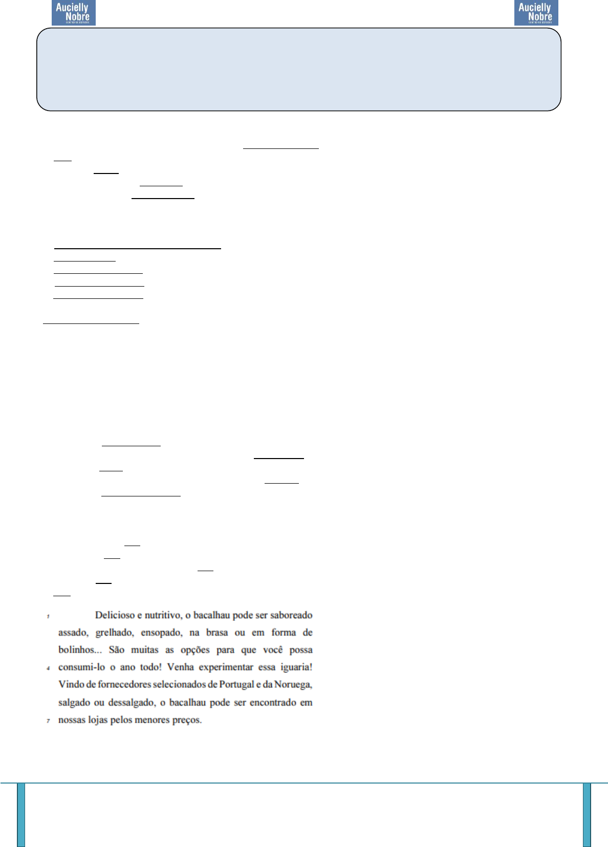 “Educação gera conhecimento. Conhecimento liberta.” 1 Língua Portuguesa para Concursos Professora Aucielly Nobre Período Simples e Período Composto (2) Questões de Concurso 01. (FCC-2019) O termo sublinhado exerce a função de sujeito na seguinte frase: A) temíamos a passagem por nossa pracinha de uma caminhonete oficial do município B) esta certamente ficara escondida no porão de algum castelo de monstros C) confiscar a bola de moleques teimosos D) valem também pela impressão que causam E) muitas só ganham intentensidade na boca dos meninos 02. (FCC-2019) Em Você não entende de segurança, Charlie Brown, o elemento sublinhado corresponde ao vocativo, por meio do qual se invoca o interlocutor do discurso. Do mesmo modo, o vocativo está sublinhado na seguinte frase: A) Participantes do programa de fidelidade terão um desconto de 50% na compra do ingresso. B) Ambientalistas, hoje, irão ao parlamento para dialogar com os representantes do governo. C) Alunos do último ano, tradicionalmente, fazem uma viagem antes da festa de formatura. D) Senhores passageiros, não se esqueçam de afivelar seus cintos de segurança. E) Gestantes e lactantes, por precaução, foram desaconselhadas a tomar a vacina. Como não o convenceu, trouxe uma porca, a única que possuía, e, na presença dele, colocou-a à venda. 03. (FCC – 2019) Em relação ao trecho que o sucede, o trecho sublinhado tem sentido de A) causa. B) consequência. C) comparação. D) oposição. E) condição. Expressão expletiva ou de realce: é uma expressão que não exerce função sintática. (Adaptado de: BECHARA, Evanildo. Moderna gramática portuguesa, 2009) 04. (FCC – 2019) Constitui uma expressão expletiva a expressão sublinhada em: A) Conheço-o desde menino, e sempre esteve para morrer (5º parágrafo) B) Espantei-me que o atingisse a morte de alguém tão distante de nossa convivência (3º parágrafo) C) Esta cólica é que é o diabo, se eu fosse mulher ainda estava explicado (6º parágrafo) D) Foi operado de apendicite quando ainda criança e até hoje se vangloria (9º parágrafo) E) consta que de uns dias para cá está de namoro sério com uma jovem (14º parágrafo) 05. (FCC – 2019) No poema, o vocábulo que tem função pronominal, retomando expressões nominais, assim como ocorre com o sublinhado em: A) Os adolescentes que namoram geralmente se casam mais cedo. B) João queria que Teresa se casasse com ele. C) Joaquim insistiu tanto com Teresa que ela acabou se afastando dele. D) Contanto que Lili ame muito seu marido, ela será feliz. E) Que vocês tenham um bom casamento! “Educação gera conhecimento. Conhecimento liberta.” 2 06. (CESPE / CEBRASPE – 2019) O trecho “assado, grelhado, ensopado, na brasa ou em forma de bolinhos” (l. 2 e 3) funciona como aposto de “bacalhau” (l.1). ( ) Certo ( ) Errado 07. (Instituto UniFil – 2019) Analise: “Se você está com esta ‘Ressaca’ do Consumo Excessivo, aqui vão algumas dicas que podem lhe ajudar.” E assinale a alternativa que apresenta a classificação dessa oração. A) Oração Subordinada Adverbial Condicional. B) Oração Coordenada Sindética Alternativa. C) Oração Subordinada Substantiva Objetiva Direta. D) Oração Subordinada Adjetiva Explicativa. 08. (Instituto Consulplan – 2020) De acordo com as funções sintáticas que os termos exercem no interior das orações, identifique o termo que apresenta função distinta dos demais considerando o destacado em cada alternativa. A) “[...] usando recursos da psicologia [...]” (6º§) B) “Não é à toa que cada pessoa tira o celular do bolso [...]” (6º§) C) “[...] as gigantes da tecnologia fazem um esforço consciente [...]” (6º§) D) “Como dizem o editor Bruno Garattoni e o repórter Eduardo Szklarz [...]”(6º§) 09. (Instituto Consulplan – 2020) O período “O trabalho exige destreza, e o aprendizado começa na infância.” (1º§) corresponde a uma oração coordenada sindética aditiva. Esse tipo de oração também é identificado em: A) Não encontrou nada, então foi embora. B) Ele não só nada, mas também corre muito. C) Não comeu nada, todavia não está com fome. D) Treinava muito, contudo não foi bem na competição. 10. (Instituto Consulplan – 2020) Os predicados das orações “uma força-tarefa do Ministério do Trabalho em conjunto com o Ministério Público do Trabalho, Defensoria Pública da União e Polícia Rodoviária Federal resgatou 18 trabalhadores em condições análogas à escravidão (...)” (7º§) e “Fiscalizações do tipo, infelizmente, são raras.” (7º§) são classificados, respectivamente, como: A) Verbal e nominal. B) Nominal e verbal. C) Verbal e verbo-nominal. D) Nominal e verbo-nominal. Em “Eu não quis detê-lo para explicar que estava falando com um colega, ainda que menos importante.” (Linhas 16-17). 11. (CPCON-2019) Nos enunciados acima, a relação semântica entre a oração introduzida pelos conectivos destacados e a oração imediatamente anterior é, respectivamente, de A) Finalidade e concessão. B) Proporção e adição. C) Condição e finalidade. D) Finalidade e condição. E) Concessão e oposição. 12. (CPCON-2019) Escreva V ou F, conforme sejam Verdadeiras ou Falsas as proposições sobre alguns aspectos linguísticos do texto. ( ) “Levanto cedo, faço minhas abluções...” (linha 1). A palavra destacada pode ser substituída, sem prejuízo de sentido, por “orações”. ( ) No excerto “[...] o jornal ainda quentinho da máquina, como pão saído do forno.” (Linhas 19-20), “como” é uma conjunção coordenativa. ( ) Em: “[...] eu era rapaz naquele tempo!” (Linha 21), a palavra destacada exerce a função sintática de predicativo. ( ) “Então você não é ninguém? Ele abriu um sorriso largo. Explicou que aprendera aquilo de ouvido.” (Linhas 11-12).Para esclarecer a forma como aprendera a expressão “não é ninguém!”, o autor empregou uma