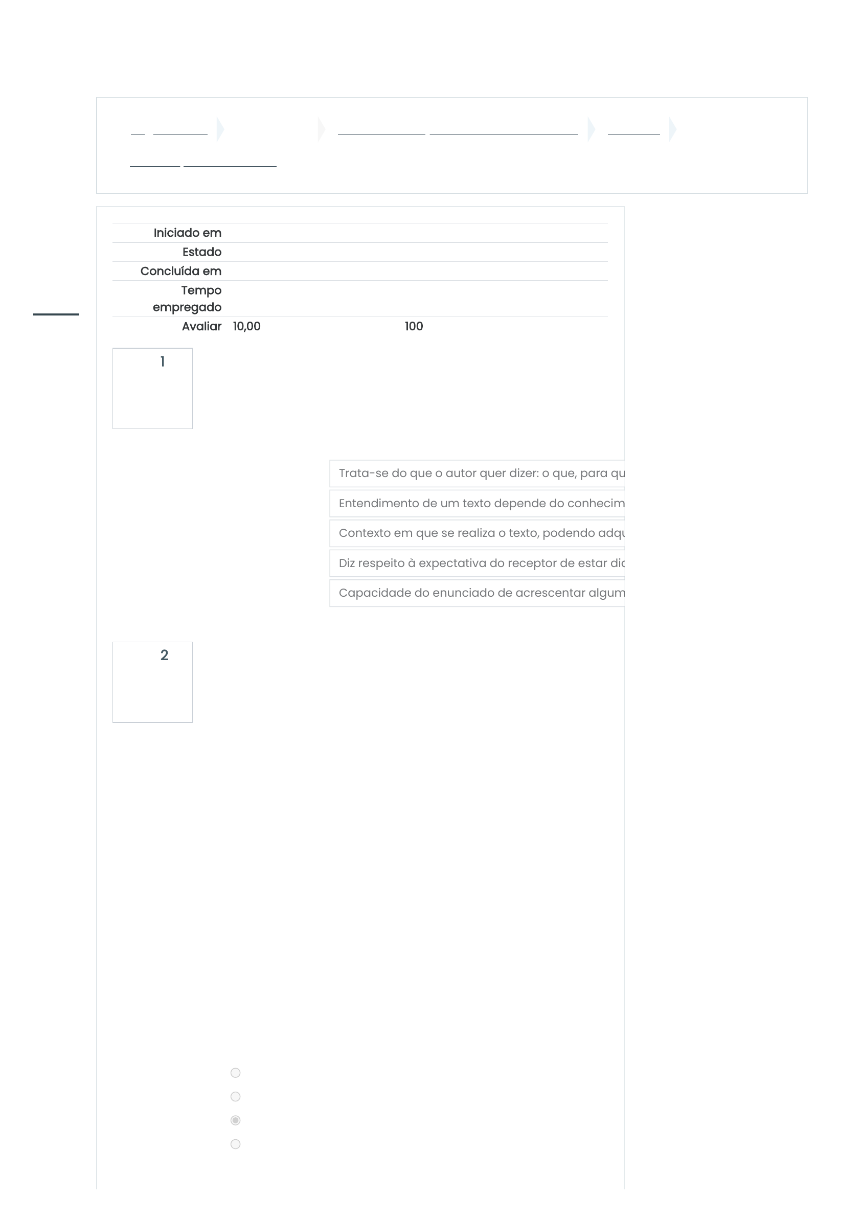 07/01/2021 Prova objetiva - Módulo 2: Revisão da tentativa https://avaacademico.ufrb.edu.br/mod/quiz/review.php?attempt=346776&cmid=2508 1/5 Página inicial Meus cursos Leitura e Produção de Textos Acadêmicos Módulo 2 Prova objetiva - Módulo 2 Questão 1 Completo Atingiu 1,00 de 1,00 Questão 2 Completo Atingiu 1,00 de 1,00 Iniciado em quinta, 7 jan 2021, 11:15 Estado Finalizada Concluída em quinta, 7 jan 2021, 11:24 Tempo empregado 8 minutos 40 segundos Avaliar 10,00 de um máximo de 10,00(100%) Os fatores pragmáticos de textualidade estão relacionados com o processo sociocomunicativo do texto, constituindo-se da intencionalidade, a aceitabilidade, a situacionalidade, o nível de informatividade e a intertextualidade. Relacione abaixo cada um dos fatores com sua explicação correspondente. Intencionalidade Intertextualidade Situacionalidade Aceitabilidade Informatividade Trata-se do que o autor quer dizer: o que, para qu Entendimento de um texto depende do conhecim Contexto em que se realiza o texto, podendo adqu Diz respeito à expectativa do receptor de estar dia Capacidade do enunciado de acrescentar algum Os fatores de textualidade são aqueles capazes de promover a interação entre o emissor e o receptor e são divididos em dois grupos, isto é, fatores pragmáticos, ou seja, aqueles relacionados com o processo sociocomunicativo do texto e os fatores centrados no texto em si, como a coerência e coesão. Analise as afirmativas abaixo, atribuindo-lhes V (verdadeiro) ou F (Falso) e depois selecione a alternativa que apresente a sequência correta. a) Coerência relaciona-se com o todo de significado que o texto apresenta b) Coesão refere-se às formas pelas quais as palavras se ligam no texto c) Coerência evoca nos texto os seus componentes gramaticais d) Coesão ou articulação interna do texto é conseguida tanto pela retomada como pela sequencialidade. Escolha uma opção: a. F, V, F, F b. V, V, V, V c. V, V, F, V d. V, F, F, F https://avaacademico.ufrb.edu.br/ https://avaacademico.ufrb.edu.br/course/view.php?id=192 https://avaacademico.ufrb.edu.br/course/view.php?id=192§ion=3 https://avaacademico.ufrb.edu.br/mod/quiz/view.php?id=2508 javascript:void(0); https://avaacademico.ufrb.edu.br/user/index.php?id=192 https://avaacademico.ufrb.edu.br/badges/view.php?type=2&id=192 https://avaacademico.ufrb.edu.br/theme/moove/certificates.php?id=192 https://avaacademico.ufrb.edu.br/admin/tool/lp/coursecompetencies.php?courseid=192 https://avaacademico.ufrb.edu.br/grade/report/index.php?id=192 https://avaacademico.ufrb.edu.br/ https://avaacademico.ufrb.edu.br/my/ https://avaacademico.ufrb.edu.br/calendar/view.php?view=month&course=192 javascript:void(0); https://avaacademico.ufrb.edu.br/user/files.php 07/01/2021 Prova objetiva - Módulo 2: Revisão da tentativa https://avaacademico.ufrb.edu.br/mod/quiz/review.php?attempt=346776&cmid=2508 2/5 Questão 3 Completo Atingiu 1,00 de 1,00 Questão 4 Completo Atingiu 1,00 de 1,00 Questão 5 Completo Atingiu 1,00 de 1,00 Furtei uma flor daquele jardim. O porteiro do edifício cochilava e eu furtei a flor. Trouxe-a para casa e coloquei-a no copo com água. Logo senti que ela não estava feliz. [...] O copo destina-se a beber, e flor não é para ser bebida. Passei-a para o vaso, e notei que ela me agradecia, revelando melhor sua delicada composição. Quantas novidades há numa flor, se a contemplarmos bem. [...] O trecho do poema acima intitulado "História de Flor” de Carlos Drummond de Andrade trata-se de um exemplo de como pode ocorrer a coesão de retomada por substituição gramatical. Esta afirmação é (selecione a alternativa abaixo): Escolha uma opção: Verdadeiro Falso Uma boa forma de mantermos a coesão do texto é utilizarmos a coesão por retomada ou substituição lexical, isto é, a substituição de uma palavra por sinônimos ou hiperônimos por outra visando evitar repetir os mesmos termos utilizados. Com isso em mente, associe abaixo o significado destas duas estratégias de retomada do significado de uma palavra no texto: Sinônimo Hiperônimo Palavras com sentido semelhantes Palavras com um sentido mais geral A coesão por retomada pode ser conseguida pela repetição, isto é, um processo mediante o qual uma palavra referida aparece novamente no texto e relembra o leitor acerca do tema do qual está se falando, conforme exemplificado no texto a seguir: "Saia de bolinhas, colete preto e cabelos presos, Madonna estava mais para a santa Evita que para a demoníaca material girl quando desembarcou em Buenos Aires, no sábado. [...] Madonna foi logo dizendo que estava em missão de paz.” Considerando-se os dois parágrafos acima podemos afirmar que: Escolha uma opção: a. Tanto a conceituação quanto o exemplo estão equivocados. b. A conceituação está correta, contudo o exemplo é equivocado c. A conceituação está equivocada, todavia o exemplo está correto. d. A conceituação e a exemplificação estão corretas javascript:void(0); https://avaacademico.ufrb.edu.br/user/index.php?id=192 https://avaacademico.ufrb.edu.br/badges/view.php?type=2&id=192 https://avaacademico.ufrb.edu.br/theme/moove/certificates.php?id=192 https://avaacademico.ufrb.edu.br/admin/tool/lp/coursecompetencies.php?courseid=192 https://avaacademico.ufrb.edu.br/grade/report/index.php?id=192 https://avaacademico.ufrb.edu.br/ https://avaacademico.ufrb.edu.br/my/ https://avaacademico.ufrb.edu.br/calendar/view.php?view=month&course=192 javascript:void(0); https://avaacademico.ufrb.edu.br/user/files.php 07/01/2021 Prova objetiva - Módulo 2: Revisão da tentativa https://avaacademico.ufrb.edu.br/mod/quiz/review.php?attempt=346776&cmid=2508 3/5 Questão 6 Completo Atingiu 1,00 de 1,00 Questão 7 Completo Atingiu 1,00 de 1,00 "Graças a Deus eu não experimentei a força e eficiência do air bag, pois nunca fui vítima de um acidente. Mas sou totalmente a favor do equipamento. Jamais soube de casos em que pessoas que dirigiam um carro com ess