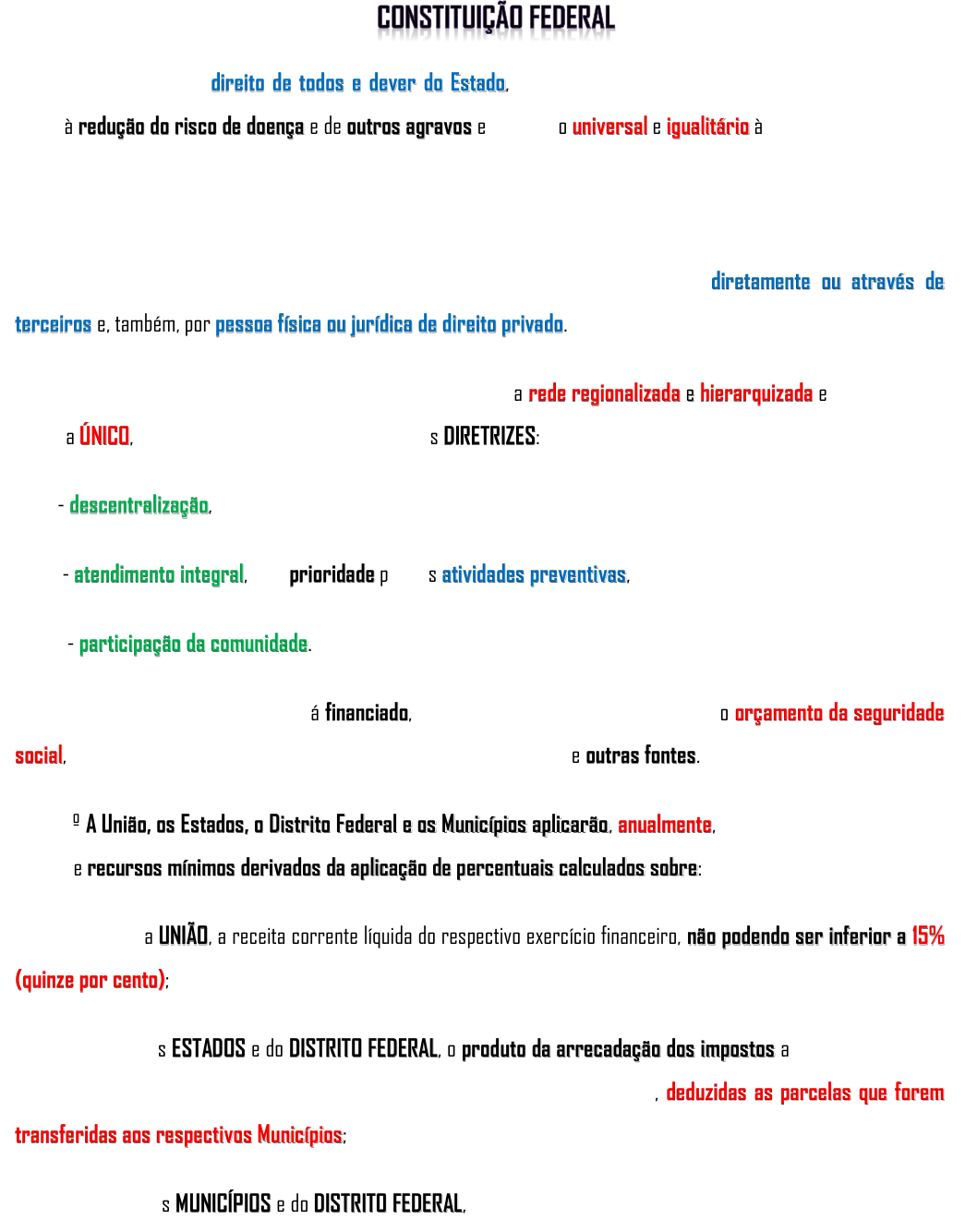 Art. 196. A saúde é , garantido mediante políticas sociais e econômicas que direito de todos e dever do Estado visem à e de e ao acesso redução do risco de doença outros agravos e às ações e serviços para universal igualitário sua promoção, proteção e recuperação. Art. 197. São de relevância pública as ações e serviços de saúde, cabendo ao Poder Público dispor, nos termos da lei, sobre sua regulamentação, fiscalização e controle, devendo sua execução ser feita diretamente ou através de e, também, por . terceiros pessoa física ou jurídica de direito privado Art. 198. As ações e serviços públicos de saúde integram uma rede regionalizada e e constituem um hierarquizada sistema , organizado de acordo com as seguintes ÚNICO : DIRETRIZES I - , com direção única em cada esfera de governo; descentralização II - , com atendimento integral para as prioridade , sem prejuízo dos serviços assistenciais; atividades preventivas III - . participação da comunidade § 1º. O sistema único de saúde será , nos termos do art. 195, com recursos do financiado orçamento da seguridade , da União, dos Estados, do Distrito Federal e dos Municípios, além de social . outras fontes § 2º , A União, os Estados, o Distrito Federal e os Municípios aplicarão , em ações e serviços públicos anualmente de saúde : recursos mínimos derivados da aplicação de percentuais calculados sobre I - no caso da , a receita corrente líquida do respectivo exercício financeiro, UNIÃO não podendo ser inferior a 15% ; (quinze por cento) II - no caso dos e do , o a que se refere o art. ESTADOS DISTRITO FEDERAL produto da arrecadação dos impostos 155 e dos recursos de que tratam os arts. 157 e 159, inciso I, alínea a, e inciso II, deduzidas as parcelas que forem ; transferidas aos respectivos Municípios III - no caso dos e do , o produto da arrecadação dos impostos a que se refere o art. MUNICÍPIOS DISTRITO FEDERAL 156 e dos recursos de que tratam os arts. 158 e 159, inciso I, alínea b e § 3º. § 3º Lei complementar, que será reavaliada pelo menos , estabelecerá: a cada cinco anos I - os percentuais de que tratam os incisos II e III do § 2º; II - os critérios de rateio dos recursos da União vinculados à saúde destinados aos Estados, ao Distrito Federal e aos Municípios, e dos Estados destinados a seus respectivos Municípios, objetivando a progressiva redução das disparidades regionais; III - as normas de fiscalização, avaliação e controle das despesas com saúde nas esferas federal, estadual, distrital e municipal; IV - (revogado) . (Redação dada pela Emenda Constitucional nº 86, de 2015) § 4º Os gestores locais do sistema único de saúde poderão admitir agentes comunitários de saúde e agentes de combate às endemias por meio de processo seletivo público, de acordo com a natureza e complexidade de suas atribuições e requisitos específicos para sua atuação. § 5º Lei federal disporá sobre o regime jurídico, o piso salarial profissional nacional, as diretrizes para os Planos de Carreira e a regulamentação das atividades de agente comunitário de saúde e agente de combate às endemias, competindo à União, nos termos da lei, prestar assistência financeira complementar aos Estados, ao Distrito Federal e aos Municípios, para o cumprimento do referido piso salarial. § 6º Além das hipóteses previstas no § 1º do art. 41 e no § 4º do art. 169 da Constituição Federal, o servidor que exerça funções equivalentes às de agente comunitário de saúde ou de agente de combate às endemias poderá perder o cargo em caso de descumprimento dos requisitos específicos, fixados em lei, para o seu exercício. Art. 199. A assistência à saúde . é livre à iniciativa privada § 1º - As instituições privadas poderão participar de forma do sistema único de saúde, segundo COMPLEMENTAR diretrizes deste, , tendo mediante contrato de direito público ou convênio as preferência e entidades filantrópicas as sem . fins lucrativos § 2º É a vedada destinação de recursos públicos para auxílios ou subvenções às instituições privadas com fins lucrativos. http://www.planalto.gov.br/ccivil_03/constituicao/Emendas/Emc/emc86.htm#art5 http://www.planalto.gov.br/ccivil_03/constituicao/Emendas/Emc/emc86.htm#art1 § 3º É a participação direta ou indireta de vedada empresas ou na assistência à saúde no capitais estrangeiros País, nos casos previstos em lei. salvo § 4º A lei disporá sobre as condições e os requisitos que facilitem a remoção de órgãos, tecidos e substâncias humanas para fins de transplante, pesquisa e tratamento, bem como a coleta, processamento e transfusão de sangue e seus derivados, sendo vedado . todo tipo de comercialização Art. 200. , além de outras atribuições, nos termos da lei: AO SISTEMA ÚNICO DE SAÚDE COMPETE I - controlar e fiscalizar procedimentos, produtos e substâncias de interesse para a saúde e participar da produção de medicamentos, equipamentos, imunobiológicos, hemoderivados e outros insumos; II - executar as ações de vigilância sanitária e epidemiológica, bem como as de saúde do trabalhador; III - ordenar a formação de recursos humanos na área de saúde; IV - participar da formulação da política e da execução das ações de saneamento básico; V - incrementar, em sua área de atuação, o desenvolvimento científico e tecnológico e a inovação; VI - fiscalizar e inspecionar alimentos, compreendido o controle de seu teor nutricional, bem como bebidas e águas para consumo humano; VII - participar do controle e fiscalização da produção, transporte, guarda e utilização de substâncias e produtos psicoativos, tóxicos e radioativos; VIII - colaborar na proteção do meio ambiente, nele compreendido o do trabalho. Dispõe sobre as condições para a e promoção, proteção da saúde, a e o recuperação organização funcionamento dos serviços c