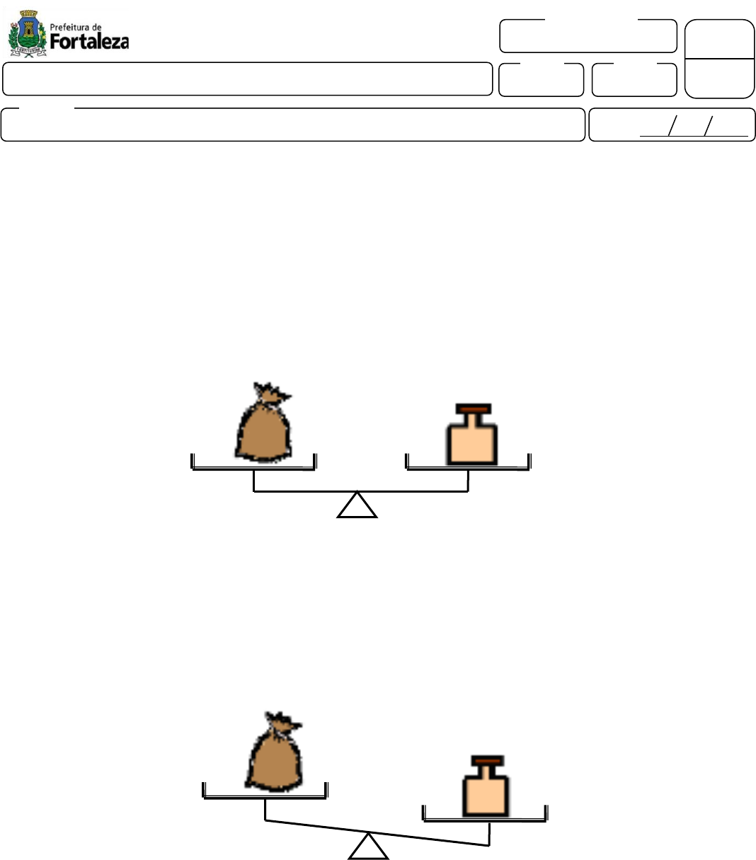 As balanças 1. A Rita e o Rui foram comprar gomas. Na loja existe uma balança com pesos e cada um dos dois amigos pesou o seu saco de gomas. 1.1. A Rita colocou o saco de gomas num dos pratos da balança e um peso no outro prato e a balança ficou logo em equilíbrio, como podes ver na figura: a) Escrevam uma frase que traduza a situação da balança em equilíbrio. b) Quanto pesa o saco de gomas da Rita? 1.2. O Rui também colocou o seu saco de gomas num dos pratos mas a balança não ficou logo em equilíbrio. a) O que podem dizer acerca do peso do saco de gomas do Rui? b) Para tentar equilibrar a balança o Rui decidiu colocar mais pesos na balança. Escrevam uma frase que traduza a situação da balança em equilíbrio. 100 g Gomas 100 g Gomas REVISÃO DE MATEMÁTICA ALUNO (A) NOTA DATA Prof.LOPES ESCOLA CRISTO REDENTOR TURMA 7°BCD TURNO A situação da balança também se pode representar de uma forma simbólica. c) Utilizem a letra x para representar o peso do saco de gomas. Escrevam uma expressão que traduza a situação representada na balança. A expressão que escreveram chama-se equação e a letra x chama-se incógnita. Uma equação é uma igualdade onde aparece pelo menos uma incógnita. À expressão correspondente ao primeiro prato da balança chamamos 1º membro da equação e à expressão relativa ao segundo prato da balança chamamos 2º membro da equação. d) Neste caso temos: 1º membro: ___________________ 2º membro: ___________________ Numa equação cada membro é constituído por vários termos. e) Completem: Os termos do 1º membro da equação são: _______________ Os termos do 2º membro da equação são: _______________ f) A balança mantém-se em equilíbrio se juntarmos ou retirarmos objectos equivalentes dos dois pratos da balança. Também quando somamos ou subtraímos o mesmo número a ambos os membros de uma equação ficamos com uma equação equivalente. Resolvam a equação e digam qual o peso do saco de gomas do Rui. 3.3. Como estas não eram as quantidades desejadas, os dois amigos decidiram colocar mais gomas nos sacos de modo a ficarem ambos com o mesmo peso. 100 g Gomas 20 g 1º Princípio de Equivalência g) Escrevam uma frase que traduza a situação da balança em equilíbrio. h) Escrevam uma equação que traduzam a situação representada na balança. De seguida simplifiquem ambos os membros da equação. i) Se multiplicarmos ou dividirmos ambos os membros de uma equação pelo mesmo número diferente de zero, obtemos uma equação equivalente. Determinem quanto pesa cada um dos sacos de gomas? j) Se 100 g de gomas custarem 2 €, quanto paga cada um dos amigos? 2. De seguida é apresentada uma outra balança em que os dois frascos de compota têm o mesmo peso: a) Descrevam o que podem fazer para determinar o peso de cada um dos frascos de compota. b) Traduzam a situação da balança por meio de uma equação. c) Aplicando os princípios de equivalência resolvam a equação e determinem o peso de cada uma dos frascos de compota. Gomas 100 g 100 g Gomas 20 g 300 g 500 g 1kg 2º Princípio de Equivalência 3. Na balança seguinte, todas as embalagens de farinha têm o mesmo peso: a) Descrevam o que podem fazer para determinar o peso de cada embalagem de farinha. b) Traduzam a situação da balança por meio de uma equação. c) Aplicando os princípios de equivalência resolvam a equação e determinem o peso de cada embalagem de farinha. 4. A senhora Amélia foi à mercearia comprar fruta. Colocou num saco a quantidade de fruta que julgava necessária para obter 2 kg de fruta. De acordo com a situação apresentada a senhora Amélia tem a quantidade desejada? Justifiquem. 4 kg 1 kg 5 kg 3 kg 2 kg 5 kg