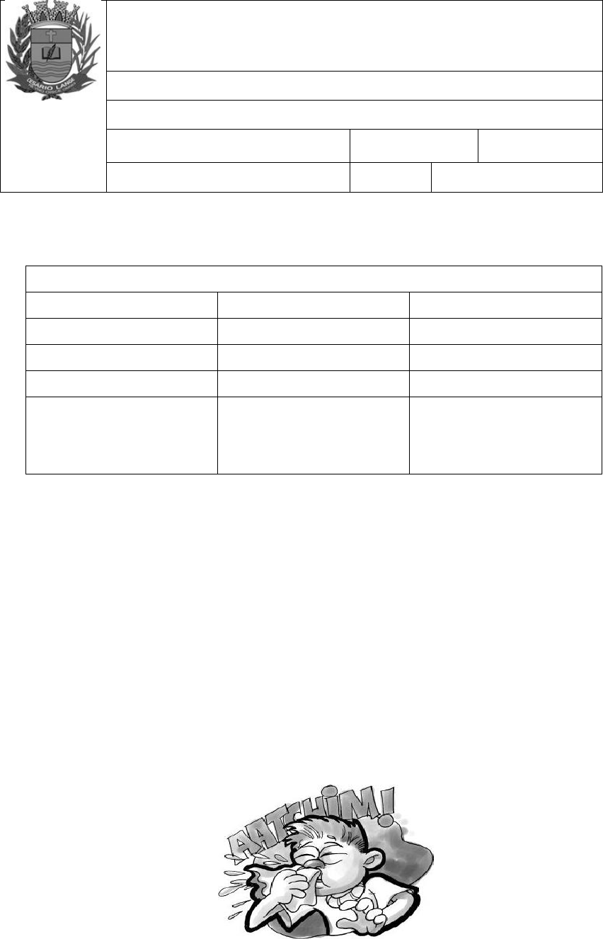 1- Analise os dados da tabela “Composição do ar inspirado e expirado” e responda às questões a seguir: Composição do ar inspirado e expirado Gases no ar Ar inspirado Ar expirado Nitrogênio (N2) 78% 78% Oxigênio (O2) 21% 16% Gás carbônico (CO2) 0,03% 4% Outros gases inclusive vapor de água 1% 2% a- Que gás da atmosfera não participa da respiração? _________________________________________________________ . b- Pelos dados obtidos das quantidades de O2 e CO2 inspirados e expirados no ar, qual é o gás consumido e qual é o produzido? __________________________________________________________ _________________________________________________________ . 2- O espirro consiste na rápida saída de ar pelas vias respiratórias, pode acontecer quando algum objeto estranho encosta nos pequenos pelos internos do nariz. Qual deve ser a utilidade do espirro para o sistema respiratório? REDE MUNICIPAL DE ENSINO DE CESÁRIO LANGE ESCOLA: AVALIAÇÃO PROFESSOR (ª): William de Assis CIÊNCIAS DATA: __/__/__ ALUNO (ª): Nº: SÉRIE/TURMA: https://www.google.com.br/url?sa=i&rct=j&q=&esrc=s&source=images&cd=&cad=rja&uact=8&ved=0ahUKEwisjtOGoOzWAhUFmJAKHeInBfYQjRwIBw&url=http://portodaspipas.blogs.sapo.pt/64309.html&psig=AOvVaw0D_N7WLopI25Asb1LIcqXp&ust=1507937683925644 https://www.google.com.br/url?sa=i&rct=j&q=&esrc=s&source=images&cd=&cad=rja&uact=8&ved=0ahUKEwiyiP7K8OHWAhVPmJAKHZiFBfEQjRwIBw&url=https://pt.wikipedia.org/wiki/Ficheiro:Bras%C3%A3o_de_Ces%C3%A1rio_Lange.png&psig=AOvVaw0mN3rZxOBFIcclBrjaQC_x&ust=1507581405411715 _______________________________________________________ _______________________________________________________ ______________________________________________________ . 3- Assinale, alternativa que indica o comportamento da caixa torácica, dos músculos intercostais e do diafragma durante a expiração humana. Caixa torácica Músculos intercostais Diafragma a) aumenta de volume contraem-se abaixa b) aumenta de volume contraem-se levanta c) diminui de volume contraem-se levanta d) diminui de volume relaxam-se levanta e) diminui de volume relaxam-se abaixa 4- Complete as lacunas com as opções disponíveis entre parênteses: a- Hematose é a troca gasosa que ocorre nos .............................................. (brônquios/ alvéolos pulmonares). b- O sistema .............................. (circulatório/ respiratório) tem como função promover as trocas gasosas entre o corpo e o ar atmosférico. c- As hemácias sanguínea são produzidas em locais especiais do organismo, chamados .......................................... (medula óssea/ fígado). d- Já é sabido que o cigarro, embora pequeno, é uma mistura de ingredientes que resultam em cerca de 4 500 substâncias tóxicas. As pessoas que fazem uso do cigarro são chamadas de fumantes ........................ (ativos/ passivos). 5- Assinale a alternativa que contém os males causados pelo cigarro. Podemos citar ......................................... e ........................................ . a- Enfisema pulmonar/ câncer de boca. b- Enfisema pulmonar/ diabetes. c- Diabetes/ câncer de boca. d- Hipertensão/ diabetes. e- Infarto/ diabetes. 6- Preencha a cruzadinha de acordo com as instruções a seguir: Boa Prova, queridos!!! http://1.bp.blogspot.com/-VfTW4U-Ig7A/TpXqVyf92oI/AAAAAAAABCc/tcy-ad8pb2c/s1600/img553.jpg