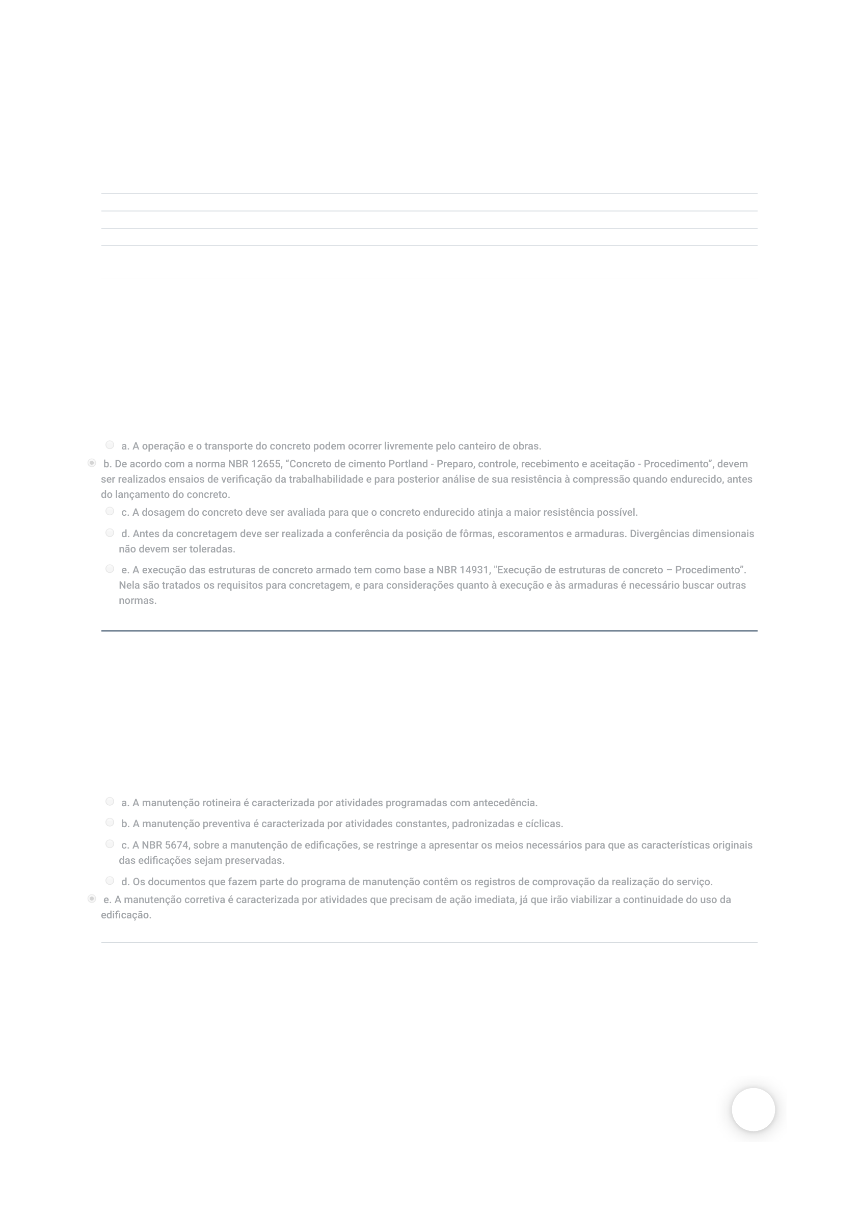 16/03/2020 Unidade 2 - Exercícios de fixação: avaliação da tentativa https://portalacademico.eniac.edu.br/mod/quiz/review.php?attempt=174275&cmid=121632 1/4 Página inicial / Meus Cursos / ENIAC_20201E_841 / Materiais de Estudo / Unidade 2 - Exercícios de �xação Iniciado em segunda, 16 mar 2020, 18:22 Estado Finalizada Concluída em segunda, 16 mar 2020, 19:08 Tempo empregado 45 minutos 44 segundos Avaliar 10,00 de um máximo de 10,00(100%) Questão 1 Correto Atingiu 1,00 de 1,00 Questão 2 Correto Atingiu 1,00 de 1,00 Com relação ao controle de qualidade durante a execução da estrutura, assinale a alternativa correta. Escolha uma: a. A operação e o transporte do concreto podem ocorrer livremente pelo canteiro de obras. b. De acordo com a norma NBR 12655, “Concreto de cimento Portland - Preparo, controle, recebimento e aceitação - Procedimento”, devem ser realizados ensaios de veri�cação da trabalhabilidade e para posterior análise de sua resistência à compressão quando endurecido, antes do lançamento do concreto. c. A dosagem do concreto deve ser avaliada para que o concreto endurecido atinja a maior resistência possível. d. Antes da concretagem deve ser realizada a conferência da posição de fôrmas, escoramentos e armaduras. Divergências dimensionais não devem ser toleradas. e. A execução das estruturas de concreto armado tem como base a NBR 14931, "Execução de estruturas de concreto – Procedimento”. Nela são tratados os requisitos para concretagem, e para considerações quanto à execução e às armaduras é necessário buscar outras normas. Com relação aos requisitos para a gestão do sistema de manutenção de edi�cações, assinale a alternativa correta. Escolha uma: a. A manutenção rotineira é caracterizada por atividades programadas com antecedência. b. A manutenção preventiva é caracterizada por atividades constantes, padronizadas e cíclicas. c. A NBR 5674, sobre a manutenção de edi�cações, se restringe a apresentar os meios necessários para que as características originais das edi�cações sejam preservadas. d. Os documentos que fazem parte do programa de manutenção contêm os registros de comprovação da realização do serviço. e. A manutenção corretiva é caracterizada por atividades que precisam de ação imediata, já que irão viabilizar a continuidade do uso da edi�cação. https://portalacademico.eniac.edu.br/ https://portalacademico.eniac.edu.br/course/view.php?id=4516 https://portalacademico.eniac.edu.br/course/view.php?id=4516#section-1 https://portalacademico.eniac.edu.br/mod/quiz/view.php?id=121632 16/03/2020 Unidade 2 - Exercícios de fixação: avaliação da tentativa https://portalacademico.eniac.edu.br/mod/quiz/review.php?attempt=174275&cmid=121632 2/4 Questão 3 Correto Atingiu 1,00 de 1,00 Questão 4 Correto Atingiu 1,00 de 1,00 Questão 5 Correto Atingiu 1,00 de 1,00 Com relação às hipóteses básicas de dimensionamento no estado limite último, assinale a resposta correta. Escolha uma: a. λx. Por ser idealizado, os valores no diagrama tensão-deformação não variam conforme a resistência do concreto. b. Assume-se que as deformações nas barras de armadura serão idênticas às deformações do concreto que as envolve. c. Na hipótese de seções planas, assume-se que as seções transversais permanecem planas após as deformações e estas não são proporcionais a sua distância até a linha neutra. d. Utiliza-se o diagrama tensão-deformação simpli�cado para aços com ou sem patamar de escoamento. Neste diagrama, depois de atingida a tensão de início de escoamento, os valores da tensão na armadura aumentam proporcionalmente ao aumento das deformações. e. Assume-se que a ocorrência da ruína de uma seção transversal não ocorrerá quando a distribuição das deformações ao longo da altura da seção se enquadrar em algum dos domínios de deformação. f. Adota-se o diagrama parábola-retângulo idealizado para o concreto comprimido, que pode ser substituído por um diagrama retangular, com profundidade de y Segundo os domínios de deformação do estado limite último e sua caracterização pela NBR 6118, assinale a a�rmação correta. Escolha uma: a. O domínio 1 é caracterizado por tração não uniforme (�exo-tração), com baixas tensões de compressão na seção transversal do elemento. b. Os domínios 4 e 4a são caracterizados pela ruptura do concreto à compressão, sendo que no domínio 4 as armaduras estão tracionadas e escoando e no domínio 4a as armaduras estão comprimidas. c. O domínio 2 é caracterizado pela ruptura do concreto à compressão e pelo máximo alongamento permitido para as armaduras de aço. d. O domínio 5 é caracterizado pela compressão não uniforme, sua seção transversal está inteiramente comprimida, sem tensões de tração. e. O domínio 3 é caracterizado pela ruptura do concreto à compressão e pelo escoamento do aço. Somente é utilizado para o dimensionamento à �exão simples. Com relação aos requisitos de qualidade da estrutura, assinale a alternativa correta. Escolha uma: a. Os requisitos de qualidade de desempenho em serviço e durabilidade de estruturas de concreto não colocam a estrutura em risco, pois não abrangem sua ruptura. Por isso, a NBR 6118 especi�ca tais requisitos de forma indicativa, não sendo essencial o cumprimento de todos os aspectos nela citados. b. As exigências de durabilidade da NBR 6118 visam conservar a estrutura, protegendo-a e evitando desgastes e deteriorações que possam comprometer sua utilização e sua segurança. c. Os requisitos de desempenho em serviço visam, entre outras exigências, limitar deslocamentos excessivos da estrutura que gerem desconforto ao usuário e até mesmo ruptura instantânea do concreto, quando são atingidos os estados limites de serviço. d. Para garantir a qualidade de uma edi�cação, todas as indicações da NBR 6118 devem se