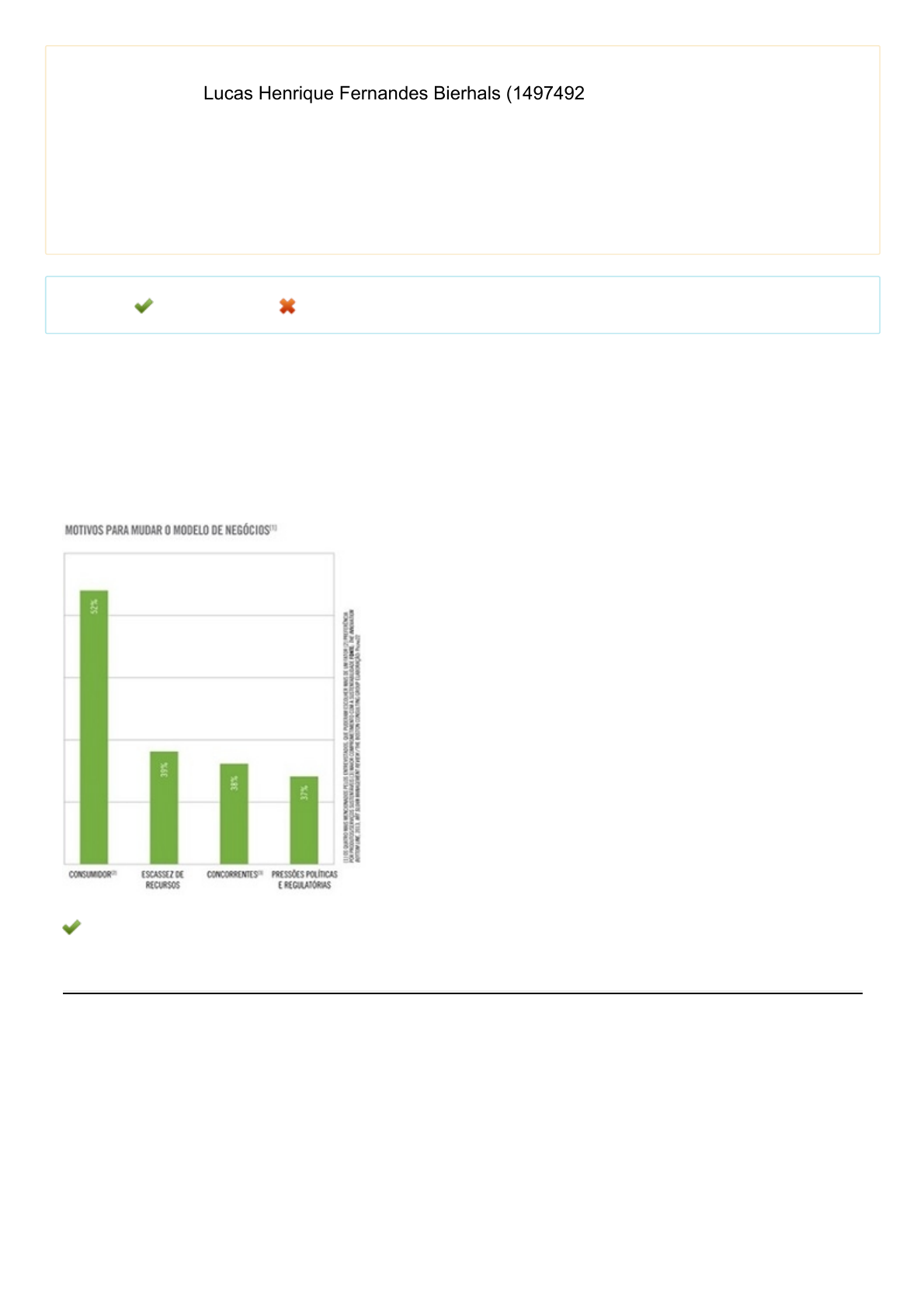 26/01/2021 UNIASSELVI - Centro Universitário Leonardo Da Vinci - Portal do Aluno - Portal do Aluno - Grupo UNIASSELVI https://portaldoalunoead.uniasselvi.com.br/ava/notas/request_gabarito_n2.php 1/4 Acadêmico: Lucas Henrique Fernandes Bierhals (1497492) Disciplina: Estudo Transversal I (17579) Avaliação: Avaliação disciplina on-line ( Cod.:648693) ( peso.:10,00) Prova: 23629036 Nota da Prova: 10,00 Legenda: Resposta Certa Sua Resposta Errada 1. Uma pesquisa com mais de 2.631 executivos, gerentes e formadores de opinião de todo o mundo e de uma gama variada de indústrias revelou que a reformulação no modelo de negócio das empresas se dá conforme os resultados apresentados na figura a seguir. Com base no texto e na figura, quem mais influencia as empresas a implantarem estratégias de sustentabilidade? FONTE: http://pagina22.com.br/2013/04/08/mais-empresas-lucram-com-sustentabilidade/. Acesso em: 25 jul. 2019 (adaptado). a) Recursos naturais escassos. b) Consumidores. c) Pressões políticas e regulatórias. d) Concorrentes. 2. Se 20% da população mundial, que habita principalmente os países do hemisfério norte, consome 80% dos recursos naturais e energia do planeta e produz mais de 80% da poluição e degradação dos ecossistemas; e 80% da população mundial, que habita principalmente os países pobres do hemisfério sul, possuem apenas 20% dos recursos naturais, assinale a alternativa CORRETA: FONTE: http://www. mma.gov.br/estruturas/educamb/_arquivos/consumo_sustentavel.pdf. Acesso em: 12 set. 2019 (adaptado). a) Quando a riqueza supera a ética ambiental e o consumo domina os desejos humanos, a consequência será a sustentabilidade. b) Se os países do sul alcançarem os mesmos padrões de consumo dos países do norte está garantida a sustentabilidade do planeta. 26/01/2021 UNIASSELVI - Centro Universitário Leonardo Da Vinci - Portal do Aluno - Portal do Aluno - Grupo UNIASSELVI https://portaldoalunoead.uniasselvi.com.br/ava/notas/request_gabarito_n2.php 2/4 c) A desigualdade apresentada entre os países do hemisfério sul e norte com relação ao consumo refletem a necessidade de união de esforços em prol da sustentabilidade planetária. d) Os países pobres do hemisfério sul são os principais responsáveis pela poluição mundial e os países ricos do hemisfério norte tornam o mundo mais sustentável. 3. Conforme dados do Instituto Brasileiro de Geografia e Estatística - IBGE, atualmente cerca de 85% da população brasileira reside nas cidades. Neste ambiente, as facilidades para o consumo de bens e serviços são diversas e as propagandas contribuem para o aumento do consumo. Considerando as informações apresentadas, assinale a alternativa CORRETA: FONTE: https://www.ibge.gov.br/apps/populacao/projecao/. Acesso em: 12 set. 2019. a) O aumento do consumo nas cidades é provocado pelo excesso de propagandas que geram o consumo do desnecessário e favorecem a sustentabilidade. b) A presença predominante da população brasileira nas cidades é reflexo do êxodo rural e como consequência reduz o consumo de bens e serviços. c) A inclusão de propagandas que estimulem a sustentabilidade pode favorecer o consumo do desnecessário e gerar ainda riquezas à população rural. d) A adoção de critérios éticos sobre o ato de consumir é fundamental para não se deixar influenciar pelas propagandas e consumir o desnecessário. 4. O conceito de sustentabilidade abrange diversos ramos da sociedade. Atualmente, essa ideia está presente na Missão, Visão e Valores de diversas empresas no Brasil e no mundo, pois leva em consideração três dimensões fundamentais para o desenvolvimento sustentável. Sobre essas dimensões, assinale a alternativa CORRETA: a) Financeira, Econômica e Lucrativa. b) Econômica, Social e Ambiental. c) Cultural, Energética e Aquática. d) Social, Justa e Democrática. 5. Materiais como plástico, papel, metal e vidro são facilmente reconhecidos como potencialmente recicláveis, contudo, é possível constatar que boa parte da população não sabe onde destinar corretamente os resíduos eletrônicos como pilhas, baterias, aparelhos celulares, etc. Como é denominado o conjunto de ações que reintegra esses resíduos na cadeia produtiva? a) Logística permanente. b) Logística contemplativa. c) Logística reversa. d) Logística contínua. 6. O consumo dos descartáveis tem sido apontado como o principal problema na geração de resíduos sólidos no mundo, especialmente em relação aos resíduos plásticos. Uma pesquisa recente divulgada pela Revista Pesquisa FAPESP (2019) aponta que uma das raízes do problema é a alta demanda da sociedade por plástico. Em 2016, a produção atingiu 396 milhões de toneladas; em 1950, foram colocados no mercado 2 milhões de toneladas. A fabricação de plástico virgem no século XXI (em apenas 16 anos) equivale ao volume produzido nos 50 anos anteriores. E as projeções indicam que, se o ritmo de crescimento não for contido, o mundo terá que acomodar cerca de 550 milhões de toneladas do material em 2030. Neste contexto, os fatores que contribuem para impulsionar a poluição plástica no mundo estão relacionados: FONTE: https://revistapesquisa.fapesp.br/2019/07/08/planeta-plastico/. Acesso em: 12 set. 2019 (adaptado). a) Ao comprometimento do mercado, com preços elevados do plástico e incentivo ao uso de retornáveis, os quais levam mais tempo para se decompor e podem ser reciclados. b) A falhas no sistema, onde o preço baixo dos plásticos resulta na predominância de uso de descartáveis, além dos baixos índices de coleta e reciclagem desses resíduos. 26/01/2021 UNIASSELVI - Centro Universitário Leonardo Da Vinci - Portal do Aluno - Portal do Aluno - Grupo UNIASSELVI https://portaldoalunoead.uniasselvi.com.br/ava/notas/request_gabarito_n2.php 3/4 c) A precariedade da coleta seletiva nas grandes cidades brasileiras e ao insucesso do uso dos plásticos ao redor do mundo, com predom