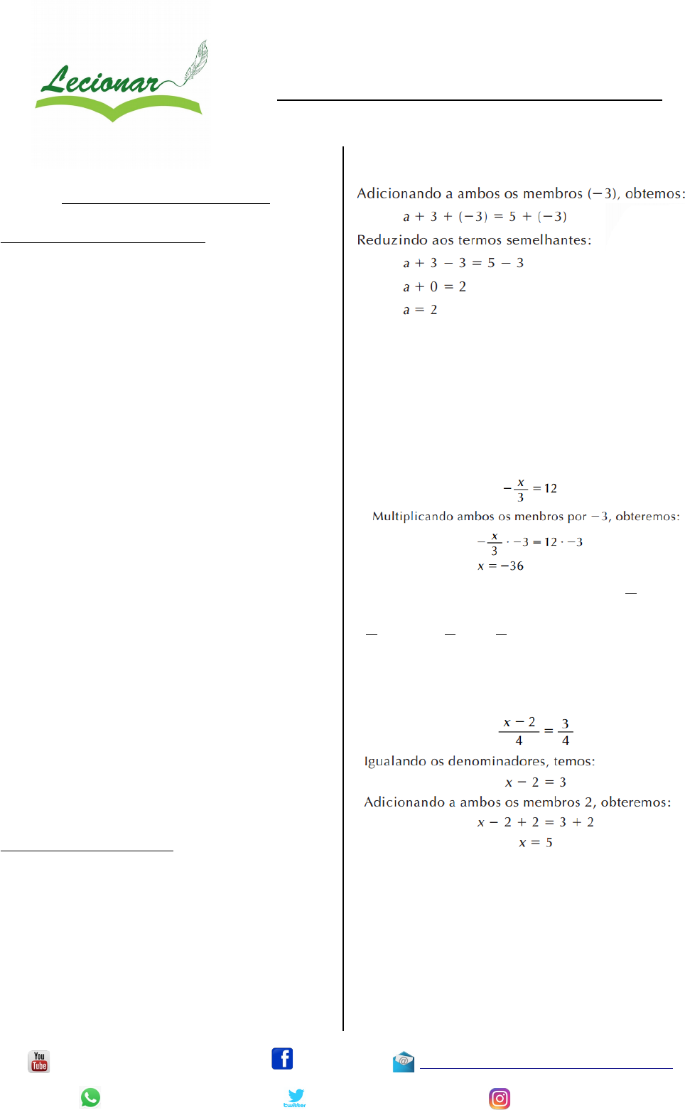 Preparatório FUZILEIRO NAVAL Prof. Netto Leal EQUAÇÕES DO 1º GRAU Problemas do quotidiano João trabalha no centro de uma grande metrópole, mas mora em uma cidade do interior. Para ir ao trabalho todos os dias ele toma duas conduções: um trem e um ônibus e caminha mais 3 km a pé. Sabendo-se que a distância entre sua casa e o trabalho é de 36 km e que a distância que ele percorre de trem é duas vezes maior que a distância que ele percorre de ônibus, quanto ele percorre em cada uma dessas conduções? distância de ônibus: x distância de trem: 2x distância a pé: 3 km Total 36 km Assim: x + 2x + 3 = 36 ou x = 11 Dessa maneira ele percorre 11 km de ônibus e 22 km de trem. Como pudemos verificar em nosso exemplo, uma equação que pode ser escrita na forma ax + b= 0, onde a e b são nú- meros racionais e a≠0 , e sendo que x assume valores racionais é chamada de equação de 1º grau a uma incógnita. Equações do 1º grau Para resolvermos qualquer tipo de equacão do 1º grau é necessário que conheçamos as propriedades fundamentais da igualdade. São elas: 1ª) Princípio aditivo da igualdade Se adicionarmos ou subtrairmos um mesmo número dos dois lados de uma igualdade, obteremos uma nova igualdade. Exemplo: 2ª) Princípio multiplicativo da igualdade Se multiplicarmos ou dividirmos por um mesmo número, diferente de zero, os dois lados de uma igualdade, obteremos uma nova igualdade. Exemplo: 3ª) Sejam dois números racionais a b e c b e se a b = c b então a = c. Exemplo 1: Exemplo 2: /LecionarConcursos /Lecionar lecionarconcursos@gmail.com (21) 97624-7224 @CanalLecionar @nettoleal84 mailto:lecionarconcursos@gmail.com Preparatório FUZILEIRO NAVAL Prof. Netto Leal Como os denominadores são iguais: Utilizando o princípio aditivo da igualdade: e agora, o princípio multiplicativo da igualdade, multiplicando ambos os membros por - 1 5 , obtemos: RESOLVENDO PROBLEMAS COM UMA VARIÁVEL Vejamos como resolver alguns problemas que envolvem equações do 1º grau. Exemplo: Se do dobro de um número subtrairmos 3, obteremos 7. Qual é esse número? Seja “x” o número procurado, então “2x” representará o dobro dele. Logo: Exemplo 2: A soma de nossas idades atualmente é 45. Calcule-as, sabendo que sou mais velho do que você 7 anos. Seja: x → minha idade atual e x 7 → sua idade atual Logo: Então sua idade será: x - 7 = 26 -7 = 19 anos. Exercícios: 1. Resolva as seguintes equações do primeiro grau utilizando as propriedades fundamentais das igualdades: /LecionarConcursos /Lecionar lecionarconcursos@gmail.com (21) 97624-7224 @CanalLecionar @nettoleal84 mailto:lecionarconcursos@gmail.com Preparatório FUZILEIRO NAVAL Prof. Netto Leal 2. Carlos comprou três televisores por R$ 2.700,00. Quanto custou cada um? 3. Se da metade de um número subtrairmos 7, obteremos 2. Qual é o número? 4. Se ao triplo do número de canetas que eu possuo atualmente somarmos 2, obteremos 23. Quantas canetas eu tenho? 5. Se ao dobro do número pensado por mim somarmos 3, obteremos 13. Qual foi o número pensado? 6. Se da metade da sua idade tirarmos a terça parte dela, obteremos 6. Qual é a sua idade? 7. Pensei em um número e adicionei 6. O resultado assim obtido multipliquei por 3,obtendo 60. Qual foi o número pensado? 8. Se da terça parte de um número tirarmos 1, obteremos 5. Qual é esse número? 9. Se à quinta parte do número de bonés que eu possuo adicionássemos 2, obteríamos 6. Quantos bonés eu possuo? 10. A quarta parte do número de blusas que eu possuo é 3. Quantas blusas eu tenho? 11. Se do dobro do número de gravatas que possuo tirarmos 3, obteremos 11. Quantas gravatas possuo? 12. Enigma Sobre o túmulo de Diofanto havia sua história, e quem conseguisse decifrá-la descobriria sua idade. Vamos tentar desvendar esse mistério? 1º) Deus concedeu-lhe passar a sexta parte de sua vida na juventude; 2º) um duodécimo na adolescência; 3º) um sétimo no casamento, sem ter filhos; 4º) depois de cinco anos, nasceu seu primeiro filho; 5º) esse filho, ao atingir a metade da idade de seu pai, morreu; 6º) após quatro anos da morte de seu filho, morreu Diofanto. Quantos anos viveu Diofanto? 13. Um terço do que ganho é reservado ao pagamento do aluguel e dois quintos são gastos em alimentação. Se do que sobra, coloco metade na poupança, ficando com R$ 150,00 para gastos gerais, qual é o meu salário? Gabarito 1. 2. R$ 900,00 3. 18 4. 7 canetas 5. 5 6. 36 anos 7. 14 8. 18 9. 20 bonés 10. 12 blusas /LecionarConcursos /Lecionar lecionarconcursos@gmail.com (21) 97624-7224 @CanalLecionar @nettoleal84 mailto:lecionarconcursos@gmail.com Preparatório FUZILEIRO NAVAL Prof. Netto Leal 11. 7 gravatas 12. 84 anos 13. R$ 1.125,00 /LecionarConcursos /Lecionar lecionarconcursos@gmail.com (21) 97624-7224 @CanalLecionar @nettoleal84 mailto:lecionarconcursos@gmail.com