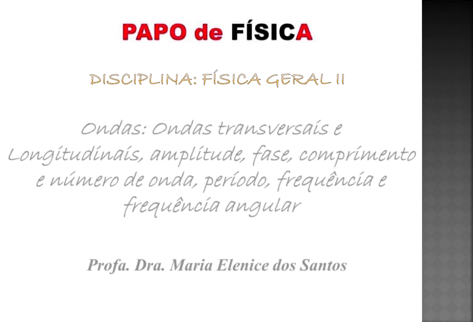 Ondas: Ondas transversais e Longitudinais, amplitude, fase, comprimento e número de onda, período, frequência e frequência angular Profa. Dra. Maria Elenice dos Santos 2 ONDAS ESTACIONÁRIAS (Exercício proposto 01) Uma onda que se propaga em uma corda é descrita pela equação: (a) Qual é a amplitude da onda? (b) Quais são o comprimento de onda, o período e a frequência da onda? (c) Qual é a velocidade da onda? (d) Qual é o deslocamento y para x = 22,5 cm e t = 18,9 s? ][)72,21,72(00327,0),( SItxsentxy 3 ONDAS ESTACIONÁRIAS 4 ONDAS ESTACIONÁRIAS 5 ONDAS ESTACIONÁRIAS (Exercício proposto 02) Uma onda senoidal transversal se propaga em uma corda no sentido positivo de um eixo x com uma velocidade de 80,0 m / s. No instante t = 0, uma partícula da corda situada em x = 0 possui um deslocamento transversal de 4,0 cm em relação à posição de equilíbrio e não está se movendo. A velocidade transversal máxima da partícula situada em x = 0 é 16,0 m / s. (a) Qual é a frequência da onda? (b) Qual é o comprimento de onda? Se a equação de onda é da forma Determine (c) a amplitude da onda, o número de onda, a frequência angular e dê a função da onda. ][)(),( SIwtkxsenytxy m 6 ONDAS ESTACIONÁRIAS 7 ONDAS ESTACIONÁRIAS 8 ONDAS ESTACIONÁRIAS 9 ONDAS ESTACIONÁRIAS 10 ONDAS ESTACIONÁRIAS (Exercício proposto 03) Uma das extremidades de uma corda de náilon está presa a um suporte fixo no topo de um poço vertical de uma mina com profundidade igual a 80,0 m. A corda fica esticada pela ação do peso de uma caixa de minérios com massa igual a 20,0 kg. Um geólogo no fundo da mina, balançando a corda (de massa de 2,0 kg) lateralmente, envia um sinal para seu colega que está no topo da mina. A) Qual é a velocidade da onda transversal que se propaga na corda? B) Sabendo que um ponto da corda executa um MHS com frequência igual a 2,0 Hz, qual é o comprimento de onda da onda? 11 ONDAS ESTACIONÁRIAS 12 ONDAS ESTACIONÁRIAS