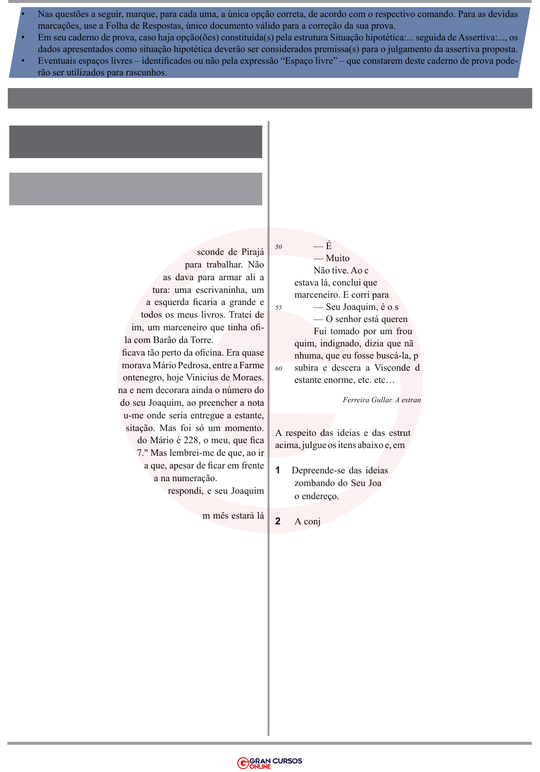 SIMULADO TJ/AM SIMULADO TJ/AM – ASSISTENTE JUDICIÁRIO • Nas questões a seguir, marque, para cada uma, a única opção correta, de acordo com o respectivo comando. Para as devidas marcações, use a Folha de Respostas, único documento válido para a correção da sua prova. • Em seu caderno de prova, caso haja opção(ões) constituída(s) pela estrutura Situação hipotética:... seguida de Assertiva:..., os dados apresentados como situação hipotética deverão ser considerados premissa(s) para o julgamento da assertiva proposta. • Eventuais espaços livres – identificados ou não pela expressão “Espaço livre” – que constarem deste caderno de prova pode- rão ser utilizados para rascunhos. � Baseado no formato de prova � aplicado pela banca Cespe CONHECIMENTOS BÁSICOS LÍNGUA PORTUGUESA (LUCAS GONÇALVES) TEXTO I 1 Naquele novo apartamento da rua Visconde de Pirajá pela primeira vez teria um escritório para trabalhar. Não era um cômodo muito grande, mas dava para armar ali a minha tenda de reflexões e leitura: uma escrivaninha, um 5 sofá e os livros. Na parede da esquerda ficaria a grande e sonhada estante que caberia todos os meus livros. Tratei de encomendá-la a seu Joaquim, um marceneiro que tinha ofi- cina na rua Garcia D’Avila com Barão da Torre. � O apartamento não ficava tão perto da oficina. Era quase 10 em frente ao prédio onde morava Mário Pedrosa, entre a Farme de Amoedo e a antiga Montenegro, hoje Vinicius de Moraes. Estava ali há uma semana e nem decorara ainda o número do prédio. Tanto que, quando seu Joaquim, ao preencher a nota da encomenda, perguntou-me onde seria entregue a estante, 15 tive um momento de hesitação. Mas foi só um momento. Pensei rápido: "Se o prédio do Mário é 228, o meu, que fica quase em frente, deve ser 227." Mas lembrei-me de que, ao ir ali pela primeira vez, observara que, apesar de ficar em frente ao do Mário, havia uma diferença na numeração. 20 — Visconde de Pirajá 127 — respondi, e seu Joaquim desenhou o endereço na nota. � — Tudo bem, seu Ferreira. Dentro de um mês estará lá sua estante. � — Um mês, seu Joaquim! Tudo isso? Veja se reduz esse 25 prazo. � — A estante é grande, dá muito trabalho… Digamos, três semanas. � Contei as semanas. Não via chegar o momento de ter no escritório a estante sonhada, onde enfim poderia 30 arrumar os livros por assunto e autores. E, mais que isso, sentir-me um escritor de verdade, um profissional, cer- cado de livros por todos os lados. No dia da entrega, voltei do trabalho apressado para ver minha estante. � — Como é, veio? — perguntei ao entrar. 35 — Veio o quê? � — Como o quê? A estante! � Não viera. Seu Joaquim não cumprira com a palavra empenhada, ah português filho de… Telefonei para ele sem dissimular, no tom da voz, minha irritação. E ele: 40 — Como não cumpri? Andei com dois homens de cima para baixo da rua e não encontrei o tal número que o senhor me indicou. Não existe na rua Visconde de Pirajá o número 127, senhor Ferreira. � Fiquei sem ação. Dera a ele o número errado. 45 — Diga-me o número certo e sua estante estará em sua casa amanhã mesmo. � Fiquei sem palavra. Se não era 127, qual número seria? Não era 227, disso tinha certeza… E o Joaquim ao telefone: � — Qual o número, seu Ferreira? 50 — É 217, seu Joaquim… É isso, 217. � — Muito bem, 217. Já anotei. Amanhã terá sua estante. � Não tive. Ao chegar em casa e verificar que a estante não estava lá, conclui que havia dado de novo o número errado ao marceneiro. E corri para o telefone a fim de me desculpar. 55 — Seu Joaquim, é o senhor Ferreira… da estante. � — O senhor está querendo brincar comigo? � Fui tomado por um frouxo de riso, enquanto seu Joa- quim, indignado, dizia que não ia mais entregar estante ne- nhuma, que eu fosse buscá-la, pois já era a segunda vez que 60 subira e descera a Visconde de Pirajá, carregando aquela estante enorme, etc. etc… Ferreira Gullar. A estranha vida banal. Rio de Janeiro: José Olympio, 1989. A respeito das ideias e das estruturas morfossintáticas do texto acima, julgue os itens abaixo e, em seguida, assinale a opção correta. 1 Depreende-se das ideias do texto que o Seu Ferreira estava zombando do Seu Joaquim ao não informar adequadamente o endereço. 2 A conjunção “mas” (l. 3) pode ser substituída, sem prejuízo gramatical ou para o sentido do texto, por qualquer dos se- guintes: porém, contudo, todavia e conquanto. 3 A substituição de “que”, no trecho “(…) observara que, ape- sar de ficar em frente ao do Mário, havia uma diferença na numeração” (l. 18 e 19), por o qual preserva a coerência e a correção gramatical do texto. 4 A construção “Mas lembrei-me de que” (l. 17) está adequa- da do ponto de vista da regência verbal, pois a forma verbal “lembrei-me” exige o uso da preposição “de”; sendo, portan- to, um verbo transitivo indireto. 5 O sujeito da oração iniciada pela forma verbal “teria” (l. 2) é indeterminado. SIMULADO TJ/AM – ASSISTENTE JUDICIÁRIO TEXTO II GIRAFA 1 LEIO que, no Jardim Zoológico, há uma girafa, macho e triste, chamada Santoro, que matou a companheira e, por sua vez, está morrendo de tristeza. Ao lado da notícia, uma foto do animal: o pescoço infinito ergue contra as nuvens do 5 céu uma cabeça de fábula. É a própria imagem da solidão. � Todo homem solitário é uma girafa. Perdoem se de- liro, mas é. Como veem, discordo de Kafka, que trans- formou um homem solitário em inseto. Há os que vi- ram inseto, admito, mas há os que atravessam as ruas 10 vertiginosamente sós, com a cabeça nas nuvens. Se ser solitá- rio é ser girafa, o que não será uma girafa solitária? � Consulto o fascinante livro Mamíferos, editado pelo MEC, aprendo que, nas horas de aflição, as girafas gemem baixinho — é a sua fala. E, para confirmar minha intuiç