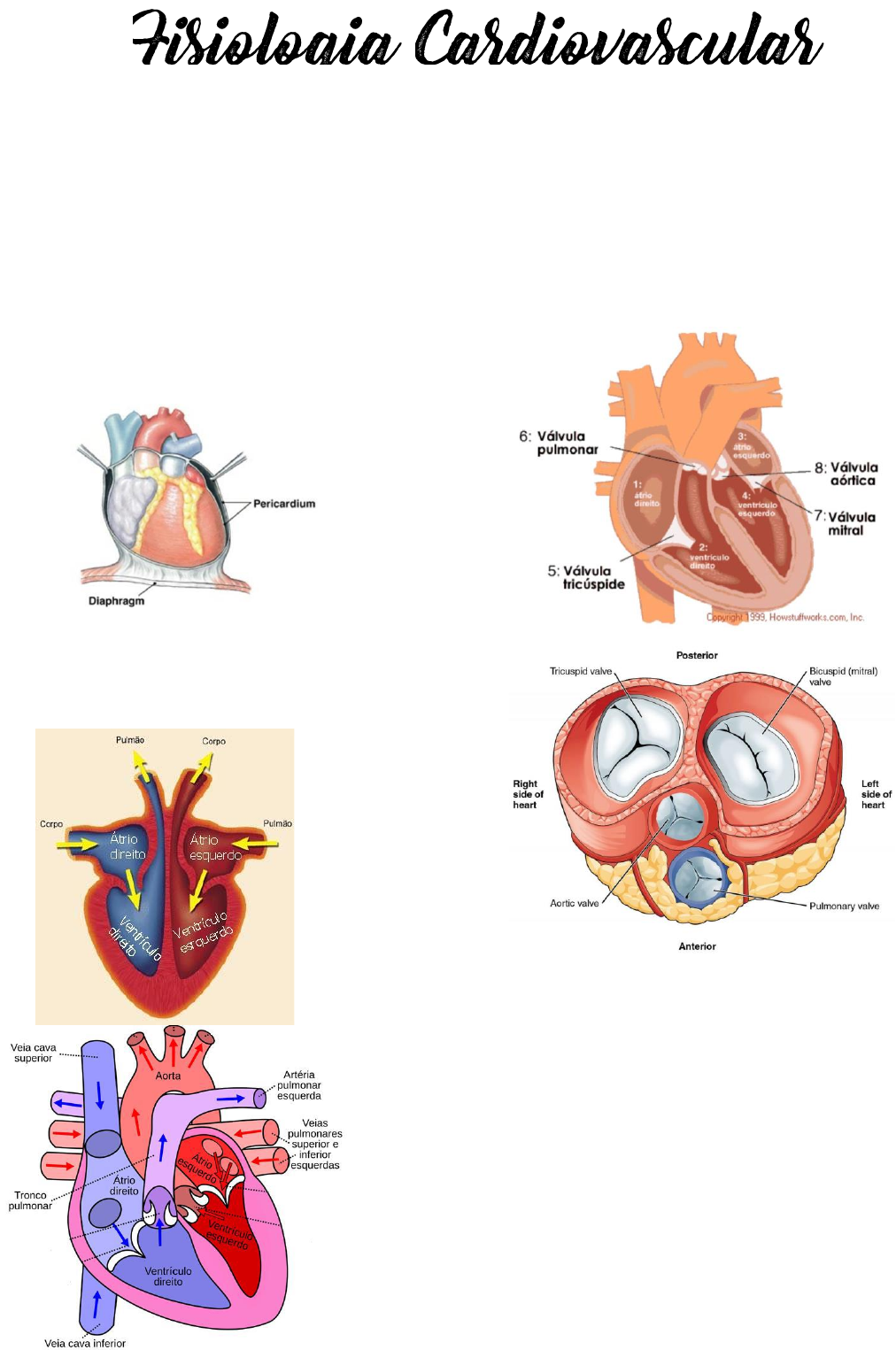 CORAÇÃO: - Localizado na cavidade torácica – sob o osso esterno – entre os pulmões. - Região conhecida como mediastino médio. - Pericárdio → é um saco fibrosseroso de parede dupla que envolve o coração, o fluido pericárdico e as raízes dos grandes vasos. Sua função é a de lubrificar as superfícies móveis do coração. - Possui vasos conectados à base. CAVIDADES CARDÍACAS E PRINCIPAIS VASOS DO CORAÇÃO: VALVAS CARDÍACAS: - Valvas tricúspide e mitral (atrioventriculares) → impedem o refluxo de sangue dos ventrículos para os átrios. - Valvas aórtica e pulmonar (semilunares) → impedem o refluxo de sangue de volta para os ventrículos no relaxamento ventricular. BULHAS CARDÍACAS: - É o som do batimento cardíaco caracterizado por uma vibração gerada pelas valvas cardíacas ao se fecharem. - 1ª BULHA CARDÍACA: barulho do fechamento das valvas atrioventriculares (mitral e tricúspide) ao iniciar a contração ventricular. - 2ª BULHA CARDÍACA: barulho do fechamento das valvas semilunares (aórtica e pulmonar) após a contração ventricular, ou seja, no relaxamento ventricular. TIPOS DE CÉLULAS: - São células miocárdicas, também denominadas células funcionais. Compõem as paredes dos átrios e ventrículos, sendo responsáveis pela contração e geração de força. - Células miocárdicas – quando estimuladas eletricamente são capazes de se contrair - As junções GAP permitem a passagem de informação de uma célula para outra → o potencial de ação é transmitido de uma fibra a outra através dessas junções. Assim, todas as fibras se contraem ao mesmo tempo. - Contração em sincício → contração sincronizada. - Cálcio extracelular. - Tempo de despolarização maior. ✓ Prolonga a contração ✓ Evita a tetanização ✓ Para que ocorra de forma rítmica → maior período refratário para não ocorrer 2 potenciais de ação juntos - Responsáveis pela contração e geração de força. - Quando estimuladas pelas células marcapasso, elas contraem. - Células especializadas que geram e conduzem potenciais de ação para que as células contráteis sejam capazes de gerar contração. - Especializadas → geram descargas elétricas rítmicas. - São células automáticas, ou seja, não dependem do sistema nervoso central para geração de estímulo. - O sistema nervoso influencia na frequência cardíaca, mas não determina o funcionamento dessas células. - São condutoras, pois geram o potencial em um lugar e ele é transmitido por toda extensão das células contráteis. GERAÇÃO DO BATIMENTO CARDÍACO – ATIVIDADE ELÉTRICA DO CORAÇÃO: - O coração tem um sistema próprio que promove a contração → marcapasso próprio. - O marca-passo inicial é o nó sinoatrial, localizado no átrio direito. - A segunda parte do sistema condutor é o nó atrioventricular, que se estende para o ventrículo, com o feixe de His que se ramifica em fibras de Purkinje. - Caminho do potencial de ação: nó sino-atrial (gera estímulos elétricos) → nó átrio-ventricular (recebe o estímulo através das vias intermodais) → feixe de His → ramos direito e esquerdo do feixe de His → fibras de Purkinje. - É a primeira parte do sistema condutor que promove a atividade elétrica do coração. - Gera potencial de ação (autoexcitável) e atua como marcapasso inicial da contração. - Localizado na parede posterior do átrio direito. - Controla a sequência de potenciais por minuto → gera mais ou menos 70 bpm (quantidade de batimentos cardíacos por minuto). - É o marcapasso mais importante, onde começa o 1 º potencial de ação (átrio D). - Ele que faz a marcação dos 70bpm, a frequência do coração. - Se tem aumento da frequência cardíaca, tem influência do sistema nervoso autônomo simpático em cima do nó sinoatrial. Se tem uma diminuição da frequência cardíaca, tem atuação do sistema nervoso autônomo parassimpático. - O parassimpático atua pelo nervo vago e o simpático atua pelo tronco simpático com neurotransmissores específicos para realizar suas respectivas funções. - O potencial de ação é conduzido e distribuído para os átrios direito e esquerdo e para o nó átrio- ventricular por meio das vias intermodais, que são estruturas condutoras entre os nós. - Via intermodal para o átrio esquerdo → Fascículo de Bachmann → leva o potencial gerado pelo nó sinusal (localizado no átrio direito) para o átrio esquerdo. - Segunda estrutura do sistema condutor. - Possui menor velocidade de condução do impulso nervoso. - Retarda temporariamente a passagem do potencial (“freia” o PA), para que o átrio contraia antes do ventrículo, garantindo o enchimento ventricular. - 80% do volume do ventrículo é por diferença de pressão e ação da gravidade, chamado de enchimento rápido (passivo). - Quando o átrio contrai, os 20% restantes do volume sanguíneo passa para o ventrículo por enchimento lento (passivo). - O nó átrio-ventricular não diminui o valor do potencial em si, apenas sua velocidade de propagação. - As células dessa região são mais densas, organizadas para realizar essa função de realizar esse retardo do potencial de ação. - Sistema especializado de condução existente nos ventrículos. - Sua conformação garante uma contração do ápice para a base, favorecendo a saída do sangue dos ventrículos para as artérias aorta e pulmonar. - As fibras de Purkinje entram nas fibras musculares cardíacas, para promover a contração eficiente do ventrículo. - A contração dos ventrículos é um pouco mais forte que a dos átrios, porque o sangue vai ser ejetado contra a gravidade pelos ventrículos. - Garantem a contração do ápice para a base. OBS: o Feixe de His também é chamado de fascículo atrioventricular. OBS2: o nó sinusal se localiza na parede posterior do AD e controla a sequência de potenciais por minuto → depois, os tratos ou vias internodais transmitem ess