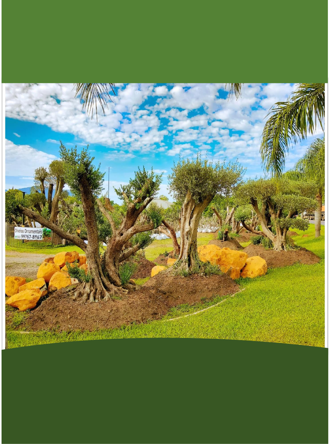 VALE DAS OLIVEIRAS Contato: 51 9 9999-9447 e-mail: vendas@oliveirasdovale1.com.br Endereço: Rodovia RS 129 – KM 68, n1245 Trevo de acesso a Roca Sales Bairro Lajeadinho – Encantado-RS Site: www.valedasoliveiras1.com.br Oliveira centenária (Cod. 0100) Com aproximadamente 170 anos esse exemplar de Oliveira é uma árvore única, majestosa e imponente. Cada Oliveira é uma obra de arte ímpar. Essa por exemplo, tem um tronco com 2 metros de circunferência e altura de 3,5 metros. Na foto, a brotação ainda é nova, tem cerca de 6 meses e com os devidos cuidadas a copa dessa árvore deve chegar aos 5 metros de altura em 2 anos. É realmente incrível a resiliência e vigor de uma Oliveira. Essa árvore é ideal para jardins, frente de restaurantes, lojas e condôminos. QUEM SOMOS: A Vale das Oliveiras é uma empresa de Paisagismo que oferece aos seus clientes árvores de grande porte, principalmente Oliveiras Centenárias, mas também trabalhamos com outras plantas como: Palmeiras, Plátanos e Nogueiras por exemplo, dispomos de árvores em vários estágios de crescimento e brotação. Com mais de 30 anos de experiência em remoção, plantio e cuidados com árvores de grande porte, temos conhecimento e técnicas para ajudar nossos clientes em todo o processo de aquisição destes exemplares. Oliveira centenária (Cod. 010) Com aproximadamente 100 anos esse exemplar de Oliveira é uma árvore única, com formação diferenciada, são 4 troncos robustos unidos na brase da planta. Sua altura podada é de 3,2 metros e sua copa pode chega a 5 metros em dois anos com os devidos cuidados. Essa árvore é ideal para jardins, frente de restaurantes, lojas e condôminos. Nossa missão: Entregar a nossos clientes árvores com excelente sanidade e porte diferenciado. Buscando a integração entre paisagismo de alto nível, beleza cênica e respeito ao meio ambiente. Nossos valores: Acreditamos na resiliência, na honestidade, no valor das pessoas e na importância da natureza. Dessa maneira, valorizamos as relações entre o ser humano e o meio ambiente. Proporcionando aos nossos clientes a satisfação e o privilégio de poder desfrutar de uma árvore centenária em seu jardim. Afinal, quanto vale o tempo? Oliveiras centenárias (Cod. 0102) Àrvores de grande porte e formação diferênciada excelente sanidade e resistência. Ideal para casas, jardins, condomínios, lojas e restaurantes. (Cod. 0103) Conhecida como a árvore da vida, a oliveira faz jus ao título pois pode viver por milhares de anos e tem uma capacidade única de regeneração e cura. A mais antiga do mundo ainda viva tem 4 mil anos e está na sardenha, no sul da itália. A origem destas árvores remete a localizações como o sul do mar cáspio, a região norte do irã e a parcela oriental do mar mediterrâneo e seu nome científico é olea europaea l.