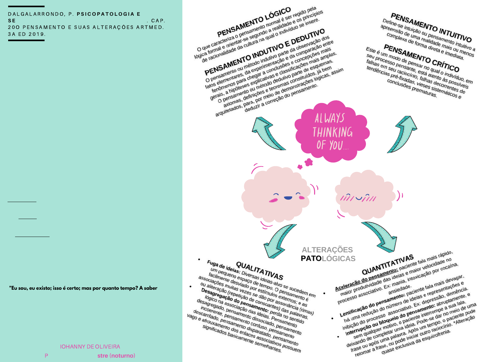 O pensar está relacionado à antecipação de acontecimentos, à construção de modelos da realidade e simulação do seu funcionamento. As atividades fundamentais do pensamento são: a elaboração de conceitos, a formação de juízos e o raciocínio. Conceito: identifica os atributos mais gerais e essenciais de um objeto. Ex: céu e azul são dois conceitos. Juízo: estabelece uma relação entre dois ou mais conceitos. Ex: céu é azul! Raciocínio: operação mental que relaciona juízos, levando a formação de novos juízos ou conclusões. Ex: “Todo homem é mortal”, “João é um homem”, portanto, João é mortal. ALTERAÇÕESALTERAÇÕES PATOLÓGICASPATOLÓGICAS O pensamento e suas alterações DA LG A L A R RONDO , P . P S I C O P A T O L O G I A E S E M I O L O G I A D O S T R A N S T O R N O S M E N T A I S . CA P . 2 0 O P E N S AMEN TO E S U A S A L T E R A ÇÕ E S A R TM ED . 3 A E D 2 0 1 9 . IOHANNY DE OLIVEIRA Psicologia VII semestre (noturno) "Eu sou, eu existo; isso é certo; mas por quanto tempo? A saber, por todo o tempo em que eu penso; pois poderia ocorrer que, se eu deixasse de pensar, eu deixaria ao mesmo tempo de ser ou de existir. Agora eu nada admito que não seja necessariamente verdadeiro: portanto, eu não sou, precisamente falando, senão uma coisa que pensa [...]" Descartes