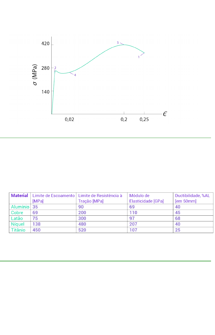UA-5 1)Do gráfico tensão por deformação, consegue-se determinar as tensões que orientam o engenheiro na escolha do material adequado para a construção de um equipamento mecânico ou de uma edificação. Identifique os números que correspondem às tensões listadas e escolha a opção correta. e)2 – 3 – 1 RESPOSTA CORRETA 2 é a tensão de escoamento, 3 é a tensão máxima e 1 é a tensão de ruptura. 2)Um engenheiro tem a sua disposição 5 materiais abaixo com os seguintes dados extraídos do gráfico tensão – deformação. Qual o material vai apresentar a maior variação no seu comprimento? , c)Latão RESPOSTA CORRETA Dos materiais listados, o latão é o que apresenta a maior capacidade de se deformar (antes do seu rompimento). 3)Um engenheiro tem à disposição 5 materiais abaixo com os seguintes dados extraídos do gráfico tensão – deformação. Qual o material é o que apresenta a maior rigidez? d)Níquel RESPOSTA CORRETA Das propriedades listadas, o módulo de elasticidade (E) indica a rigidez de um componente fabricado com um material. Dos materiais listados, o que apresenta o maior valor de módulo de elasticidade (E) é o níquel. 4) Um engenheiro tem à disposição 5 materiais abaixo com os seguintes dados extraídos do gráfico tensão – deformação. Qual apresenta a maior resistência? e)Titânio RESPOSTA CORRETA Os dados que devem ser observados são o limite de escoamento e o limite de resistência à tração. Dos materiais que foram listados, o que apresenta os maiores valores dessas características é o titânio. 5)Das afirmações a respeito do diagrama tensão-deformação abaixo, qual é a falsa? c)Os materiais apresentam módulo de elasticidade diferentes. RESPOSTA CORRETA O módulo de elasticidade é a correlação entre a tensão e a deformação, no regime elástico. Todos os diagramas apresentam uma fase elástica igual, representada pela reta inicial do gráfico, que tem a mesma inclinação.