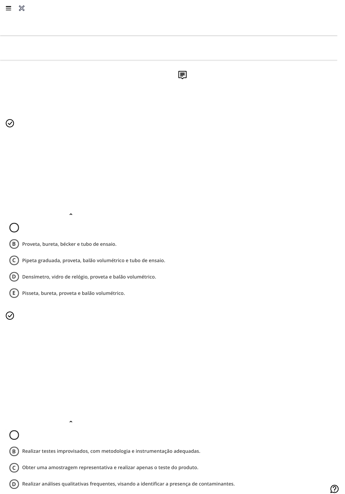 Avaliação On-Line 2 (AOL 2) - Questionário Ocultar opções de resposta Ocultar opções de resposta Avaliação On-Line 2 (AOL 2) - Questionário Fredyana Karla Medeiros de Araujo Oliveira Pergunta 1 1 /1 SANCHES, C. A importância da pipetagem nos processos analíticos. Lab network, 24 mai. 2016. Disponível em: https://www.labnetwork.com.br/especiais/a-importancia-da-pipetagem-nos-processos-analiticos/. Acesso em: 09 fev. 2020. “Os instrumentos de medição são fundamentais em laboratórios que necessitem de aferições exatas de volumes, o que garante a qualidade dos resultados das análises. Dentre os mais utilizados, têm destaque as pipetas, que têm por função a transferência de volumes de um recipiente para outro. A pipeta é um instrumento de uso diário nos laboratórios. Sem ela seria inviável realizar os processos de análise devido aos volumes de reagentes e de amostra envolvidos. Na área de biologia molecular a pipeta é utilizada desde a extração do ácido nucleico (DNA ou RNA) até a pipetagem da amostra e dos reagentes necessários para a realização da reação em cadeia da polimerase (PCR). Ela é necessária na transferência dos volumes exatos de líquidos, tanto amostra quanto reagente”. Em concordância com o texto, assinale a alternativa que apresenta apenas instrumentos utilizados para medir volumes em laboratórios. A Resposta corretaProveta, pipeta graduada, bureta e balão volumétrico. B Proveta, bureta, bécker e tubo de ensaio. C Pipeta graduada, proveta, balão volumétrico e tubo de ensaio. D Densímetro, vidro de relógio, proveta e balão volumétrico. E Pisseta, bureta, proveta e balão volumétrico. Pergunta 2 1 /1 LACERDA, C. D. Controle de qualidade de medicamentos manipulados. Portal educação, 16 abr. 2014. Disponível em: https://siteantigo.portaleducacao.com.br/conteudo/artigos/enem/controle-de-qualidade-de-medicamentos-manipulados/55623. Acesso em: 09 jan. 2020. “O setor de manipulação de medicamento em farmácia vem aumentando atualmente, devido principalmente à possibilidade de personalizar a terapia medicamentosa. Porém muitos desconfiam da qualidade do medicamento do manipulado e deixam utilizá-los por este motivo. Mas como todos os medicamentos eles só podem ser dispensados se estiveram com a qualidade garantida. Apesar de existir algumas dificuldades para realização dos ensaios de qualidade, é possível que eles sejam realizados. Informando aos usuários de medicamento e prescritores sobre a exigência legal destes ensaios e comprovando que eles realmente são realizados e confirmam a qualidade destes medicamentos é possível tirar o setor da situação de descrédito em que se encontra”. Considerando as informações presentes no texto, assinale a opção que apresenta as medidas adotadas para garantir o controle de qualidade de medicamentos. A Resposta corretaProceder com cumprimento de um conjunto de normas e procedimentos nas etapas de fabricação. B Realizar testes improvisados, com metodologia e instrumentação adequadas. C Obter uma amostragem representativa e realizar apenas o teste do produto. D Realizar análises qualitativas frequentes, visando a identificar a presença de contaminantes. 10/10 Nota final Enviado: 16/08/20 14:50 (BRT) ××