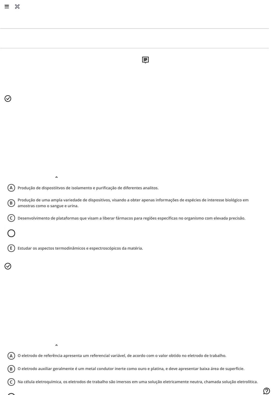 Avaliação On-Line 4 (AOL 4) - Questionário Ocultar opções de resposta Ocultar opções de resposta Avaliação On-Line 4 (AOL 4) - Questionário Fredyana Karla Medeiros de Araujo Oliveira Pergunta 1 1 /1 PACHECO, W. F. et al. Voltametrias: Uma breve revisão sobre os conceitos. Revista virtual de química, v. 5, n. 4, p. 516-537, 2013. “Os métodos eletroanalíticos fazem uso de propriedades elétricas mensuráveis a partir de fenômenos nos quais uma espécie redox interage física e quimicamente com demais componentes do meio, ou mesmo com interfaces. Uma gama variada de técnicas eletroanalíticas tem sido utilizada para várias aplicações, entre elas o monitoramento ambiental, o controle de qualidade de produtos e processos industriais e as análises biomédicas. Os métodos eletroanalíticos oferecem uma série de vantagens tais como (i) seletividade e especificidade das determinações - resultante da oxirredução das espécies analíticas de interesse em um potencial aplicado específico; (ii) seletividade - decorrente dos processos de oxirredução do analito em eletrodo de trabalho feito com material específico (material de eletrodo); (iii) grande sensibilidade e baixos limites de detecção - resultante tanto das técnicas de pré-concentração quanto de modos de aquisição de sinal que proporcionam baixo sinal de fundo, entre outras” (PACHECO et al., p. 518, 2013). Marque a alternativa que apresenta corretamente as aplicações de técnicas eletroanalíticas: A Produção de dispostiitvos de isolamento e purificação de diferentes analitos. B Produção de uma ampla variedade de dispositivos, visando a obter apenas informações de espécies de interesse biológico em amostras como o sangue e urina. C Desenvolvimento de plataformas que visam a liberar fármacos para regiões específicas no organismo com elevada precisão. D Resposta correta Investigar as propriedades redox e sobre o destino metabólico de fármacos e de outras substâncias eletricamente ativas. E Estudar os aspectos termodinâmicos e espectroscópicos da matéria. Pergunta 2 1 /1 SOUZA, A. K. P. Desenvolvimento de potenciostatos para caracterização de células eletroquímicas. 2016. 81f. Dissertação (Mestrado em Engenharia Elétrica) – Universidade Federal do Amazonas, Manaus. Dispositivos eletrônicos voltados para aplicações na área de instrumentação eletrônica no ramo de pesquisas em química analítica possuem grande interesse de desenvolvimento, nos campos de pesquisas relacionados ao meio acadêmico, assim como, no ambiente industrial. Com o objetivo de extrair informações e dados relevantes de compostos químicos, tanto do ponto de vista qualitativo, bem como do ponto de vista quantitativo, faz-se necessário em análises eletroquímicas, à presença de sensores eletroquímicos específicos conectados a circuitos eletrônicos, formando desta maneira sistemas eletroquímicos. Os sistemas eletroquímicos de análise normalmente envolvem um conjunto formado por uma célula eletroquímica de três eletrodos, um potenciostato e um analito a ser analisado (SOUZA, 2016). De acordo com as informações no texto, assinale a alternativa que descreve corretamente as funções de cada componente de uma célula eletroquímica utilizada em técnicas eletroanalíticas. A O eletrodo de referência apresenta um referencial variável, de acordo com o valor obtido no eletrodo de trabalho. B O eletrodo auxiliar geralmente é um metal condutor inerte como ouro e platina, e deve apresentar baixa área de superfície. C Na célula eletroquímica, os eletrodos de trabalho são imersos em uma solução eletricamente neutra, chamada solução eletrolítica. O eletrodo de referência apresenta um potencial de redução conhecido e constante servindo como referência ao 9/10 Nota final Enviado: 16/08/20 15:15 (BRT) ××