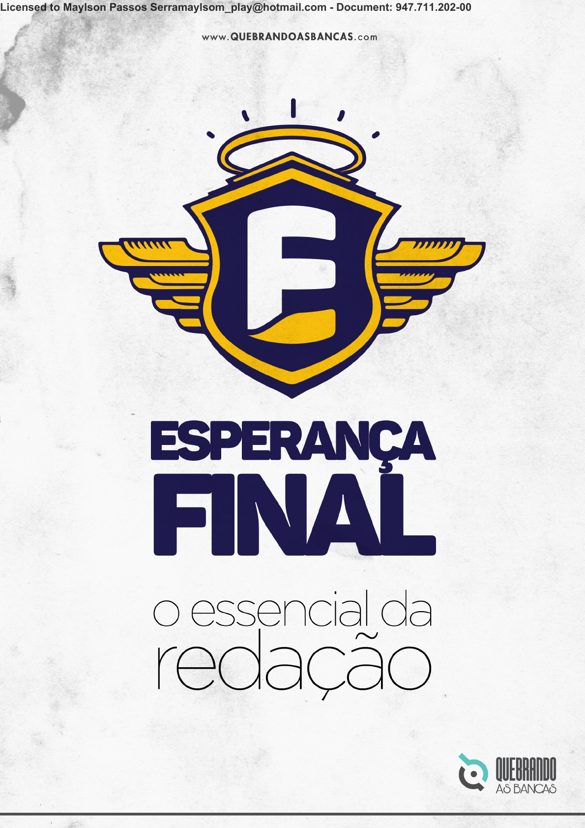 Licensed to Maylson Passos Serramaylsom_play@hotmail.com - Document: 947.711.202-00 1 O ESSENCIAL PARA ESCREVER UMA REDAÇÃO NO PADRÃO CESPE Olá, futuros colegas! Quem escreve por aqui é o Luís. Sou concurseiro de longa data, já acostumado com provas de redação. Fui aprovado em três concursos em que houve a exigência de prova discursiva: PRF (2013/CESPE), Analista do MPU (2013/CESPE) e Capitão da PM-RS (2011). Na PRF, atingi a média de 18,86 pontos de um total de 20. Essas minhas vitórias não vieram da noite para o dia. Levou bastante tempo e envolveu dezenas de horas de estudo voltado ao objetivo de escrever melhor. Para sua sorte, você não precisará passar por tudo o que passei, pois eu pretendo lhe ensinar o caminho das pedras, o que encurtará muito sua jornada, fazendo com que você tenha sucesso mais rapidamente. Aqui vou te passar aquilo que precisa saber para estruturar corretamente sua redação, conforme o padrão CESPE. Por isso, você deve, neste momento, deixar de lado aqueles conceitos sobre redação que aprendeu na escola. A redação de concurso público clama por objetividade, clareza e simplicidade. Esqueça aquela ideia de se mostrar a pessoa mais culta do universo. Não utilize palavras rebuscadas e difíceis. Dê preferência ao simples e não ao complexo. Combinado? Então vamos lá! Licensed to Maylson Passos Serramaylsom_play@hotmail.com - Document: 947.711.202-00 2 COMO É O ESTILO DE REDAÇÃO DO CESPE Dois são os tipos mais clássicos de redação de concurso. O estilo de redação por tópicos (CESPE), o mesmo cobrado na prova da PRF em 2013, e o estilo ENEM, que vou explicar em breve (com muuuuuito baixa probabilidade de aparecer na prova): Como se verifica na imagem, o primeiro estilo, que chamamos de redação por tópicos, não exige introdução, desenvolvimento e conclusão. Já o segundo estilo, tema aberto, sem tópicos, exige-se. Licensed to Maylson Passos Serramaylsom_play@hotmail.com - Document: 947.711.202-00 3 No concurso de 2013, o tema de redação foi o seguinte: No estilo CESPE de redação por tópicos, tal como no exemplo acima, o examinador nos apresenta um cenário em relação ao qual deveremos desenvolver nossa redação. Na sequência, o examinador apresenta alguns questionamentos em relação aos quais vamos dissertar. É a modalidade favorita em concursos públicos, sendo comumente adotada pela PRF, PF, MPU e tantos outros órgãos. Vamos a um exemplo de proposta envolvendo estudo de caso: O estilo de redação do CESPE é MUITO SIMPLES! Pode parecer complicado, mas não é. O maior problema da redação é o conteúdo. Você deve ter conhecimento para escrever sobre os aspectos propostos. Para sanar a pane de problemas com o conteúdo, vamos disponibilizar uma pancada de possíveis temas de redação com o espelho de correção. Cuidados que você deve ter: v Escrever de forma impessoal: significa que você não deve usar a primeira pessoa jamais - "penso que... etc". v Você deve utilizar as margens do texto (esquerda e direita) próximas da linha, evitando espaços em branco. (Agente da PRF – 2013) Nas regiões brasileiras de fronteira, o crime de contrabando, tipificado no art. 334 do Código Penal, no capítulo referente aos crimes praticados por particular contra a administração geral, ao lado do tráfico de entorpecentes e drogas afins, é o que mais importuna a atividade dos poderes públicos, tanto de prevenção e fiscalização quanto de repressão ou apuração das responsabilidades penais. O Brasil tem uma peculiaridade em relação a esse crime, devido ao fato de possuir milhares de quilômetros de fronteira seca, muito difíceis de fiscalizar. Considerando que o fragmento de texto acima tem caráter unicamente motivador, redija um texto dissertativo que atenda, necessariamente, ao que se pede a seguir: - defina o crime de contrabando e indique, em linhas gerais, as circunstâncias que integram esse tipo penal; [valor: 4,00 pontos] - comente acerca das principais mercadorias e cargas contrabandeadas no território brasileiro; [valor: 3,00 pontos] - explane a respeito dos problemas decorrentes do contrabando de mercadorias e cargas para a economia nacional e para a saúde pública; [valor: 6,00 pontos] - sugira medidas e ações efetivas das forças públicas para o combate ao contrabando de mercadorias e cargas no país. [valor: 6,00 pontos] Licensed to Maylson Passos Serramaylsom_play@hotmail.com - Document: 947.711.202-00 4 v Você não deve simplesmente desenvolver o texto como se estivesse respondendo a um questionário. v Construa parágrafos com mais de dois períodos. v Não é obrigatório introdução ou conclusão nesse tipo de texto. v Escreva simples, com frases curtas. A Banca CESPE, a qual organiza as provas da PRF, não exige título em sua redação. Portanto, a menos que na proposta venha expresso o pedido de escrever o título, inicie a primeira linha já desenvolvendo a redação, sem o título. Vou te mostrar agora a redação de um colega da PRF, Descalzo, aprovado no concurso de 2013 da PRF. A nota dele foi de 19,86 de um total de 20 pontos (quase gabaritou). O texto dele só não foi perfeito por alguns detalhes: não utilizou as margens corretamente e não construiu todos parágrafos com dois períodos (o primeiro parágrafo está em desacordo). Viu como foi simples? Licensed to Maylson Passos Serramaylsom_play@hotmail.com - Document: 947.711.202-00 5 Perceba que ele foi direto ao ponto, respondendo de forma objetiva aos aspectos indagados no comando da proposta de estudo de caso. Caso ele tivesse feito introdução e conclusão, talvez sequer conseguisse tratar de todos os aspectos indagados na proposta da redação. Como se percebe, a estrutura é bastante básica. Caso o candidato utilize corretamente as palavras-chaves, não incorra em erros gramaticais e faça a adequada correspondência entre o conteúdo do texto e o espelho de respostas da banca, o sucesso é garantid