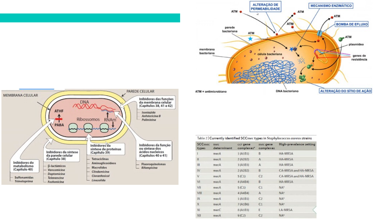 Conferência 4 M2 09/10/2020 mrsa · Metisilina resistentes e a outros fármacos. · Methicillin-resistat Staphylococcus aureus, também chamada de SARO, ORSA. · 1961 – com o advento da meticilina. · CA-MRSA (mrsa adquirido na comunidade) e HA-MRSA (mrsa adquirido no hospital) · Resistência ligada ao cassete cromossômico estafilocócico mec (SCCmec) – elemento genético móvel que confere resistência a vários B-lactâmicos. Staphylococcus produz as seguintes infecções: síndrome da pele escaldada, bacteremia, sepse.... MRSA possui vários PAMPs que quando reconhecidos ativam o recrutamento de neutrófilos. Staphylococcus tb produz toxinas. Fármacos: Bacteriostáticos (inibe o crescimento) ou bactericidas (causa a morte) – espectro estreito, estendido e amplo: Os antimicrobianos agem por exemplo inibindo a síntese da parede celular. Mecanismos de resistência bacteriana ao antimicrobiano: · A bactéria pode alterar a sua parede ou membrana de forma a não ser mais permeável ao antimicrobiano. · Podem produzir enzimas que degradam o fármaco. · Existem bombas de efluxo – proteínas transportadoras que expulsam o antiMO. · Alteração do sitio de ação – impede que o antimicrobiano se ligue. Transmissão de clones resistentes ou disseminação do cassete de resistência – causa de ter tanto mrsa no mundo: brasil tem mais de 50 Cassetes já identificados: O gene determinante é o mecA, mas há vários cassetes. Genes mecA e mecC: codificam uma PBP com muito pouca afinidade com os B-lactâmicos. (resistência através da mudança do sitio de ligação) Resistência aos B-lactâmicos penicilinas, cefalosporinas (1-4ª gerações) e carbopenêmicos. Infecções por MRSA: · Infecções na pele · Infecções nos tecidos moles · Osteomielite · Infecções sistêmicas · Geralmente precedidas por colonização – transitória ou persistente; fossas nasais, garganta, períneo e outros; fatores do hospedeiro e do MO. MRSA: · LA-MRSA (relacionado a criação de animais) · HA-MRSA · CA-MRSA HA-MRSA: · Bacteremia, pneumonia e infecções na pele e tecidos moles (menos comuns) · Relacionadas a dispositivos invasivos – formação de biofilmes · Colonização também aumenta o risco · Fatores de risco: dispositivos invasivos, antibioticoterapia, internação em UTI, cirurgia, hemodiálise e tempo de hospitalização. CA-MRSA: · Infecções na pele e tecidos moles principalmente · Mais frequente em times (esportes), militares e prisões – locais de contato muito próximo · Relacionadas ao compartilhamento de objetivos, lesões na pele (barbear, uso de drogas e medicamentos injetáveis) · Contato com portadores · Relação com HA-MRSA – profissionais de saúde. LA-MRSA: · Infecções na pele e tecidos moles, otites e até infecções disseminadas · Contato com criações (bovinos, suínos e aves) · Transmissão por alimentos? · Contaminação ambiental Diagnostico: · Cultura · Testes moleculares · Identificação por provas fenotípicas Prevenção: · Uso racional de ATM · Identificação de portadores · Prevenção de infecções · Higiene das mãos · Vigilância · Isolamento? – estudos não comprovaram a eficácia · Rastreamento dos portadores – universal ou de acordo com fatores de risco? Depende da disponibilidade Manejo: · Descolonização dos portadores – agentes tópicos – mupirocina e clorexidina – resistência. · Tratamento das infecções sintomáticas VISA e VRSA – resistentes a vancomicina ou intermediários. Alguns ativos contra MRSA: No brasil: · Medidas para prevenção de IRAS · Rastreamento por laboratórios de referencia · Uso racional de ATM · Investigação e descontaminação de paciente de alto risco (no pré-operatório). Seleção do fármaco: · Identificação da bactéria · Antibiograma · Tratamento empírico. Diretriz nacional para elaboração de programa de gerenciamento do uso de antimicrobianos em serviços de saúde: Como lidar: - plano de ação contra a resistência aos antimicrobianos · Educação · Vigilância · Otimização do uso · Prevenção das infecções · pesquisa