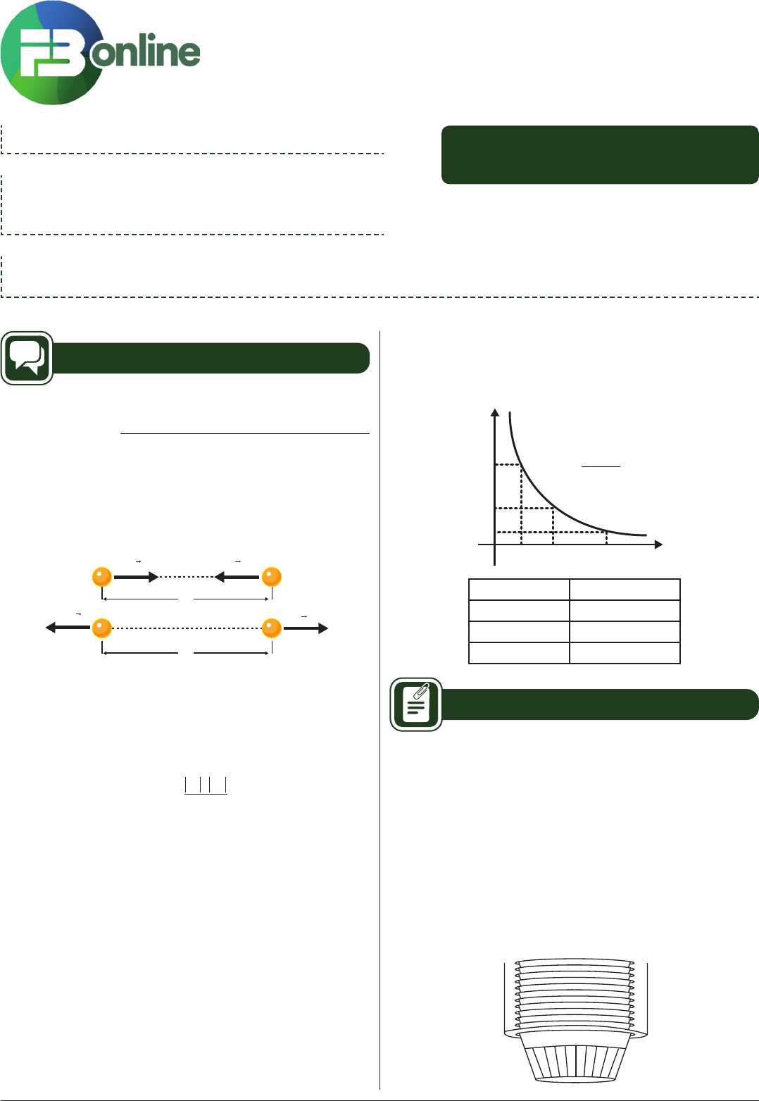 CIÊNCIAS DA NATUREZA E SUAS TECNOLOGIAS F B O N L I N E . C O M . B R ////////////////// Professor(a): Andrew Aquino assunto: Lei de CouLomb frente: FísiCA ii OSG.: 118287/17 AULA 03 EAD – MEDICINA Resumo Teórico Lei de Coulomb Introdução Lei de Coulomb é a lei de interação eletrostática entre duas cargas pontuais, descrita por Charles de Coulomb. Este fenômeno tanto pode ser de atração ou de repulsão entre dois ou mais corpos eletricamente carregados. + + – – +F –F +F–F d d q1 q1 q2 q2 A lei de Coulomb afirma que a intensidade da força F entre duas cargas pontuais q1 e q2 é diretamente proporcional ao produto dos módulos dessas cargas, e inversamente proporcional ao inverso do quadrado da distância d que as separa, ou seja: F K Q Q de = ⋅ ⋅ 0 1 2 2 Fe – força elétrica entre 2 cargas. K 0 – constante de Coulomb (constante eletrostática no vácuo) K 0 = 9 · 109 N · m2/C2 d – distância entre as cargas. Essa lei foi obtida experimentalmente pelo físico francês Charles Augustin de Coulomb (1736-1806) e por isso é denominada Lei de Coulomb. Representação gráfica da lei de Coulomb Representação gráfica da intensidade da força elétrica em função da distância entre duas cargas puntiformes. F F F — 4 d — 2 d 2 d Distância d 0 4 F |Q1| – |Q2|F 1 = K d2 d/2 d 2 d Força elétrica 4 F F F/4 Distância Força elétrica d/2 4 F d F 2d F/4 Exercícios 01. (Vunesp-SP) Ao retirar o copinho de um porta-copos, um jovem deixa-o escapar de suas mãos quando ele já se encontrava a 3 cm da borda do porta-copos. Misteriosamente, o copo permanece por alguns instantes pairando no ar. Analisando o fato, concluiu que o atrito entre o copo extraído e o que ficara exposto havia gerado uma força de atração de origem eletrostática. Suponha que: – a massa de um copo seja de 1 g; – a interação eletrostática ocorra apenas entre o copo extraído e o que ficou exposto, sendo que os demais copos não participam da interação; – os copos, o extraído e o que ficou exposto, possam ser associados a cargas pontuais, de mesma intensidade. 2F B O N L I N E . C O M . B R ////////////////// Módulo de estudo OSG.: 118287/17 Nessas condições, dados g = 10 m/s² e K = 9 · 109 N · m²/C², o módulo da carga elétrica excedente no copinho, momentos após sua retirada do porta-copos, foi, em coulombs, aproximadamente: A) 6 · 10–5. B) 5 · 10–6. C) 4 · 10–7. D) 3 · 10–8. E) 2 · 10–9. 02. (AFA) As cargas Q 1 = 9 μC e Q 3 = 25 μC estão fixas nos pontos A e B. Sabe-se que a carga Q 2 = 4 μC está em equilíbrio sob a ação de forças elétricas somente na posição indicada. x 8 cm Q1 Q2 Q3 Nessas condições: A) x = 2 cm B) x = 3 cm C) x = 4 cm D) x = 5 cm E) x = 6 cm 03. (Mackenzie-SP) Nos pontos A(2, 2), B(2, –1) e C(–2, –1) do plano cartesiano, são colocadas, respectivamente, as cargas elétricas puntiformes Q A = 1,2 μC, Q B = –1,0 μC e Q C = 1,6 μC. Considerando que a experiência foi realizada no vácuo (k 0 = 9 · 109 N · m2/C2) e que as distâncias são medidas em metros, a intensidade da força elétrica resultante sobre a carga Q B , situada em B, é: A) 0,9 · 10–3 N B) 1,2 · 10–3 N C) 1,5 · 10–3 N D) 2,1 · 10–3 N E) 4,5 · 10–3 N 04 (UFRN) Uma das aplicações tecnológicas modernas da eletrostática foi a invenção da impressora a jato de tinta. Esse tipo de impressora utiliza pequenas gotas de tinta, que podem ser eletricamente neutras ou eletrizadas positiva ou negativamente. Essas gotas são jogadas entre as placas defletoras da impressora, região onde existe um campo elétrico uniforme E, atingindo, então, o papel para formar as letras. A figura a seguir mostra três gotas de tinta, que são lançadas para baixo, a partir do emissor. Após atravessar a região entre as placas, essas gotas vão impregnar o papel. (O campo elétrico uniforme está representado por apenas uma linha de força.) Emissor de gotas E Placa Placa Papel Pelos desvios sofridos, pode-se dizer que a gota 1, 2 e 3 estão, respectivamente: A) carregada negativamente, neutra e carregada positivamente. B) neutra, carregada positivamente e carregada negativamente. C) carregada positivamente, neutra e carregada negativamente. D) carregada positivamente, carregada negativamente e neutra. 05 (PUC-Camp-SP) Nos pontos de abscissa x = 2 e x = 5 são fixadas as cargas Q e 4Q, respectivamente, conforme mostra o esquema a seguir: Q 0 1 2 3 4 5 6 7 4 Q Uma terceira carga –Q ficará em equilíbrio, sob ação somente das forças elétricas exercidas por Q e 4Q, quando colocada no ponto de abscissa igual a: A) 0 B) 1 C) 3 D) 4 E) 6 06 (Fuvest-SP) Três objetos com cargas elétricas idênticas estão alinhados como mostra a figura. O objeto C exerce sobre B uma força igual a 3,0 · 10–6 N. A força elétrica resultante dos efeitos de A e C sobre B é: A B 1 cm 3 cm C A) 2,0 · 10–6 N B) 6,0 · 10–6 N C) 12 · 10–6 N D) 24 · 10–6 N E) 30 · 10–6 N 07. (Unirio) Duas esferas metálicas idênticas, de dimensões desprezíveis, eletrizadas com cargas elétricas de módulos Q e 3Q atraem-se com força de intensidade 3,0 · 10–1 N quando colocadas a uma distância d, em certa região do espaço. Se forem colocadas em contato e, após o equilíbrio eletrostático, levadas à mesma região do espaço e separadas pela mesma distância d, a nova força de interação elétrica entre elas será: A) repulsiva de intensidade 1,0 · 10–1 N B) repulsiva de intensidade 1,5 · 10–1 N C) repulsiva de intensidade 2,0 · 10–1 N D) atrativa de intensidade 1,0 · 10–1 N E) atrativa de intensidade 2,0 · 10–1 N 08. (Cefet-SP) A intensidade da força elétrica entre duas cargas puntiformes, Q 1 = 6 μC e Q 2 = 3 μC, colocadas no vácuo, sofre redução quando essas cargas são mergulhadas, a mesma distância, em água. Sendo a distância entre as cargas de 3 cm e a intensidade da força elétrica F = 2,2 N, o valor da constante eletrost