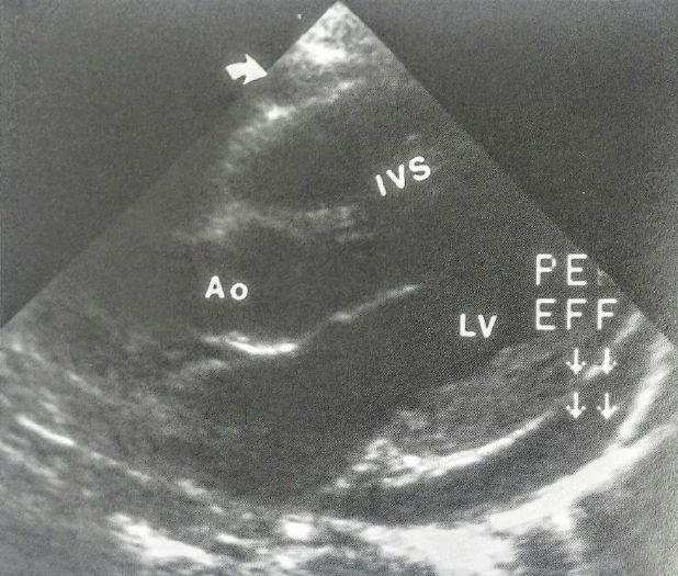 Características Imagenológicas de doenças do Pericárdio O derrame pericárdico é a anormalidade mais comum do pericárdio. A faixa pericárdica normalmente tem de 2 a 3mm em radiografias de tórax e TC e menos de 4mm na RM. A radiografias simples mostram o espessamento da faixa pericárdica ou um sinal de densidade diferencial em até 63% dos pacientes com derrames pericárdicos. A configuração em moringa é vista nos derrames crônicos. A fluoroscopia mostra diminuição das pulsações cardíacas. O pericárdio normalmente contém aproximadamente 20mL de liquido, enquanto são necessários aproximadamente 200mL para serem detectáveis em radiografias simples. A ecocardiografia detecta quantidades muito pequenas (<50mL) de líquido pericárdico, geralmente como uma coleção anecóica (estrutura que não apresenta eco acústico) posterior. Derrames pequenos (<100mL) aparecem como regiões anecóicas anteriores e posteriores. Derrames de tamanho moderado (100 a 500mL) evidenciam uma zona anecóica em torno de todo o ventrículo. Derrames muito grandes (>500mL) estendem-se além do campo de visão, podendo associar-se ao “coração balançando” dentro do pericárdio. A TC é útil para a detecção de derrames pericárdicos loculados. A RM caracteriza o líquido. Um líquido seroso simples aparece escuro às imagens ponderadas em T1 (provavelmente devido ao movimento do líquido) e claro nas imagens gradiente-eco. Derrames complicados ou hemorrágicos aparecem claros nas imagens ponderadas em T1 e escuros nas imagens gradiente-eco (provavelmente devido a artefatos de suscetibilidade). Derrame Pericárdico. Ecocardiograma longitudinal através do septo interventricular (IVS), da raiz aórtica (Ao) e do VE (LV) demonstrando derrame pericárdico (PE EFF). Também há um derrame anterior menor (seta); O tamponamento cardíaco designa a compressão das câmaras cardíacas por um derrame pericárdico sob tensão, o que compromete o enchimento diastólico. O pulso paradoxal descreve um exagero na redução habitual da pressão sistólica durante inspiração. Isso decorre do desvio e movimento paradoxal do septo durante o enchimento ventricular direito. O exame clínico mostra distensão venosa jugular acentuada, bulhas cardíacas distantes e ruído de atrito pericárdico. A radiografia de tórax mostra o aumento rápido da silhueta cardíaca, com a vascularização parecendo relativamente normal. O ecocardiograma mostra tipicamente o desvio septal, o movimento paradoxal do septo, o colapso diastólico do VD e o colapso cíclico dos átrios. A doença pericárdica constritiva advém de espessamento fibroso ou calcificado do pericárdio, que compromete cronicamente o enchimento ventricular por restrição do movimento cardíaco. A idade de início é habitualmente de 30 a 50 anos, e a incidência em homens supera aquela em mulheres à razão de 3:1. A causa mais comum é pós-pericardiotomia. Outras etiologias incluem vírus (Coxsackie B), tuberculose, insuficiência renal crônica, artrite reumatoide, envolvimento neoplásico e pericardite por radiação. As radiografias detectam calcificações em até 50% dos pacientes. Derrames pleurais e ascite são comuns. Os achados clínicos incluem edema maleolar, distensão de veias do pescoço, pulso paradoxal, ruído diastólico pericárdico e ascite. As radiografias de tórax mostram uma silhueta cardíaca normal a ligeiramente aumentada, com átrios pequenos, veia cava superior e inferior e veia ázigo dilatadas e borda cardíaca direita plana ou retificada. A ecocardiografia mostra um pericárdio mais espesso, movimento septal anormal e fração de ejeção ventricular esquerda aumentada, com volume diastólico final pequeno. Pequenos derrames podem ser vistos em associação à “pericardite constritiva com derrame”, que evidencia espessamento e derrame. Pericardite Constritiva. TC sem contraste mostra calcificações pericárdicas (seta fechada) e veia cava inferior dilatada (seta aberta). Observe a distorção dos ventrículos A TC é particularmente boa na demonstração do espessamento pericárdico (>3mm) e calcificações pericárdicas nos casos difíceis. Também podem ser vistos refluxo de contraste para o seio coronário e veia cava inferior, um septo interventricular arqueado, achatamento do VD, AD aumentado, ascite e derrames pleurais. A RM mostra espessamento pericárdico (>4mm), dilatação do AD, da veia cava inferior e das veias hepáticas, desvio sigmoide do septo, e estreitamento do VD. A mecânica anormal do fluxo também pode ser vista na veia cava e nos átrios. O achado de um pericárdio anormalmente espesso é importante para diferenciar entre doença pericárdica constritiva e miocardiopatia restritiva. Os cistos pericárdicos são mais comuns nos ângulos cardiofrênicos, sendo os cistos no lado direito mais comuns que no lado esquerdo. Em geral são assintomáticos e mais frequentes em homens. Os cistos estão presos ao epitélio parietal, são revestidos por células epiteliais ou mesoteliais, contém um líquido claro e variam de tamanho de 3 a 8cm. Ás vezes, comunicam-se com o espaço pericárdico. Os números de atenuação da TC são tipicamente de 20 a 40 UH e não aumentam significativamente após a administração de contraste. A RM demonstra um característico sinal hipointenso nas imagens ponderadas em T1 e sinal hiperintenso nas imagens ponderadas em T2. O diagnóstico diferencial de uma massa do ângulo cardiofrênico inclui cisto pericárdico, coxim adiposo, lipoma, linfonodos aumentados, hérnia diafragmática e aneurisma ventricular. Cisto Pericárdico. A) Radiografia de tórax mostra uma massa de tecido mole no ângulo cardiofrênico direito (seta). B) A TC com contraste demonstra uma densidade quase igual à água na massa não captante de contraste no ângulo cardiofrênico, compatível com cisto pericárdico. RV (ventrículo direito); LV (ventrículo esquerdo). A ausência congênita do per