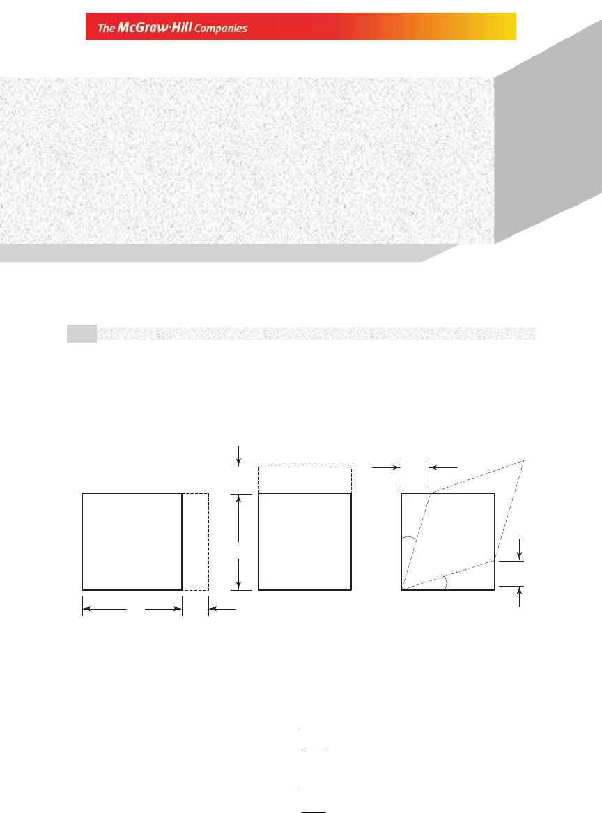2.1 INTRODUCTION In this chapter the state of strain at a point will be analysed. In elementary strength of materials two types of strains were introduced: (i) the extensional strain (in x or y direction) and (ii) the shear strain in the xy plane. Figure 2.1 illustrates these two simple cases of strain. In each case, the initial or undeformed position of the element is indicated by full lines and the changed position by dotted lines. These are two-dimensional strains. Dx Fig. 2.1 (a) Linear strain in x direction (b) linear strain in y direction (c) shear strain in xy plane In Fig. 2.1(a), the element undergoes an extension Dux in x direction. The exten- sional or linear strain is defined as the change in length per unit initial length. If ex denotes the linear strain in x direction, then ex = xu x ∆ ∆ (2.1) Similarly, the linear strain in y direction [Fig. 2.1(b)] is ey = yu y ∆ ∆ (2.2) Figure 2.1(c) shows the shear strain g xy in the xy plane. Shear strain g xy is defined as the change in the initial right angle between two line elements originally Dux Analysis of Strain 2 CHAPTER Dux Dy Duy q 2 Dx Dy Duy q 1 (b) (c)(a) 64 Advanced Mechanics of Solids parallel to the x and y axes. In the figure, the total change in the angle is q1 + q2. If q1 and q2 are very small, then one can put q1 (in radians) + q2 (in radians) = tan q1 + tan q2 From Fig. 2.1(c) tan q1 = yu x ∆ ∆ , tan q2 = xu y ∆ ∆ (2.3) Therefore, the shear strain g xy is g xy = q1 + q2 = yu x ∆ ∆ + x u y ∆ ∆ (2.4) Reduction in the initial right angle is considered to be a positive shear strain, since positive shear stress components txy and tyx cause a decrease in the right angle. In addition to these two types of strains, a third type of strain, called the volumetric strain, was also introduced in elementary strength of materials. This is change in volume per unit original volume. In this chapter, we will study strains in three dimensions and we will begin with the study of deformations. 2.2 DEFORMATIONS In order to study deformation or change in the shape of a body, we compare the positions of material points before and after deformation. Let a point P belonging y z P(x, y, z) u r r ¢¢¢¢¢ O Fig. 2.2 Displacement of point P to P¢ x P ¢(x ¢, y ¢, z ¢) to the body and having coordinates (x, y, z) be displaced after deformations to P¢ with coordinates (x¢, y¢, z¢) (Fig. 2.2). Since P is displaced to P¢, the vector segment PP¢ is called the displacement vector and is denoted by u. The displacement vector u has components ux, uy and uz along the x, y and z axes respectively, and one can write u = iux + juy + kuz (2.5) The displacement undergone by any point is a function of its initial co- ordinates. We assume that the displacement is defined throughout the volume of the body, i.e. the displacement vector u (both in magnitude and direction) of any point P belonging to the body is known once its coordinates are known. Then we can say that a displacement vector field has been defined throughout the volume of the body. If r is the position vector of point P, and r¢ that of point P¢, then r¢ = r + u (2.6) u = r¢ – r Analysis of Strain 65 Example 2.1 The displacement field for a body is given by u = (x2 + y)i + (3 + z) j + (x2 + 2y)k What is the deformed position of a point originally at (3, 1, –2)? Solution The displacement vector u at (3, 1, –2) is u = (32 + 1)i + (3 – 2) j + (32 + 2)k = 10i + j + 11k The initial position vector r of point P is r = 3i + j – 2k The final position vector r¢ of point P¢ is r¢ = r + u = 13i + 2 j + 9k Example 2. 2 Two points P and Q in the undeformed body have coordinates (0, 0, 1) and (2, 0, –1) respectively. Assuming that the displacement field given in Example 2.1 has been imposed on the body, what is the distance between points P and Q after deformation? Solution The displacement vector at point P is u(P) = (0 + 0)i + (3 + 1) j + (0 + 0)k = 4j The displacement components at P are ux = 0, uy = 4, uz = 0. Hence, the final coordinates of P after deformation are P¢ : x + ux = 0 + 0 = 0 y + uy = 0 + 4 = 4 z + uz = 1 + 0 = 1 or P¢: (0, 4, 1) Similarly, the displacement components at point Q are, ux = 4, uy = 2, uz = 4 and the coordinates of Q¢ are (6, 2, 3). The distance P¢Q¢ is therefore d¢ = (62 + 22 + 22)1/2 = 2 11 2.3 DEFORMATION IN THE NEIGHBOURHOOD OF A POINT Let P be a point in the body with coordinates (x, y, z). Consider a small region surrounding the point P. Let Q be a point in this region with coordinates (x + Dx, y + Dy, z + Dz). When the body undergoes deformation, the points P and Q move to P¢ and Q¢. Let the displacement vector u at P have components (ux, uy, uz) (Fig. 2.3). 66 Advanced Mechanics of Solids The coordinates of P, P¢ and Q are P: (x, y, z) P¢: (x + ux, y + uy, z + uz) Q: (x + Dx, y + Dy, z + Dz) The displacement components at Q dif- fer slightly from those at P since Q is away from P by Dx, Dy and Dz. Consequently, the displacements at Q are, ux + Dux, uy + Duy, uz + Duz. If Q is very close to P, then to first-order approximation x x x x u u uu x y zx y z ∂ ∂ ∂ ∂ ∂ ∂∆ = ∆ + ∆ + ∆ (2.7a) The first term on the right-hand side is the rate of increase of ux in x direction multiplied by the distance traversed, Dx. The second term is the rate of increase of ux in y direction multiplied by the distance traversed in y direction, i.e. Dy. Simi- larly, we can also interpret the third term. For Duy and Duz too, we have y y y y u u u u x y zx y z ∂ ∂ ∂ ∂ ∂ ∂∆ = ∆ + ∆ + ∆ (2.7b) z z z z u u uu x y zx y z ∂ ∂ ∂ ∂ ∂ ∂∆ = ∆ + ∆ + ∆ (2.7c) Therefore, the coordinates of Q¢ are, Q¢ = (x + D x + ux + Dux, y + Dy + uy + Duy, z + Dz + uz + Duz) (2.8) Before deformation, the segment PQ had components D x, Dy and D z along the three axes. After deformation, the segment P¢Q¢ has components D x + Dux, Dy + Duy, Dz + Duz along the three axes. Terms like, , ,x x xu u ux y z 