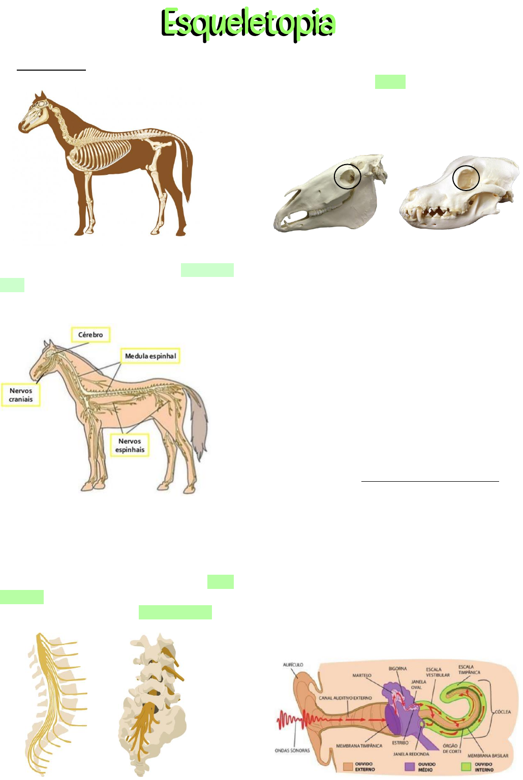 @lilyfazvet A esqueletopia consiste na relação do esqueleto com os órgãos do corpo; Os ossos possuem uma relação intima com o sistema nervoso, graças ao esqueleto axial, que é formado pelo crânio e pelas vertebras e é responsável por proteger elementos como os nervos e o encéfalo; No interior das vertebras existe um canal que serve como passagem para a medula espinal; A medula espinhal termina no início sacro, onde ela vai se afunilando até formar o cone medular e se dividindo em diversos ramos de nervos, que formam a cauda equina; Outra estrutura óssea extremamente importante é a órbita, que é uma cavidade localizada no crânio responsável por acomodar os órgãos do sistema visual (olhos e estruturas anexas); A orbita é formada pelo conjunto dos ossos frontal, lacrimal, esfenoide, zigomático, palatino e maxilar; Vale ressaltar que a órbita dos carnívoros não é completamente fechada, porém nos demais animais sim; Os músculos encontrados nessa região são: músculo reto dorsal, músculo reto ventral, músculo reto lateral, músculo reto medial, musculo obliquo dorsal e músculo obliquo ventral – eles auxiliam na movimentação dos olhos; Além disso os animais possuem um músculo a mais do que os seres humanos, chamado de músculo retrator do bulbo, que puxa o olho deles um pouco para trás, servindo como mecanismo de defesa; O nervo ótico fica protegido por toda essa musculatura; Os ossos também possuem uma relação intima com os órgãos auditivos, principalmente os ossículos da audição, que são o martelo, a bigorna e o estribo; Esses ossículos se encontram no ouvido médio; @lilyfazvet Com relação a mandíbula, nota-se uma grande importância para o processo de mastigação dos alimentos; Nela são encontrados os músculos digástrico e miloiódeo; É possível palpar a pulsação da artéria facial na parte ventral da mandíbula, principalmente nos equinos; Ainda na mandíbula é possível localizar os linfonodos mandibulares, que ajudam a identificar processos inflamatórios na região da cabeça/ pescoço; As costelas e o esterno servem como proteção para os órgãos presentes na cavidade torácica, como o esôfago, o coração e os pulmões; Tanto as costelas quanto o esterno tem uma relação intima com os pulmões e com o coração, sendo que os pulmões são mais íntimos às costelas e o coração ao esterno; O coração dos animais se localiza: - cão e gato: entre o 3º e o 6° E. I.; - bovino e suíno: entre o 2º e o 5º E. I.; - equino: entre o 2º e o 6º E. I. A auscultação deve ser feita entre os espaços intercostais (E.I.), não em cima das costelas; A auscultação do coração dos bovinos deve ser feita por trás da tuberosidade do olecrano; O arco costal é formado pela borda da penúltima e a última costela, que juntas formam uma delimitação do fim das costelas; arco costal @lilyfazvet A pelve é formada por três ossos: o ílio, ísquio e o púbis; Dentro da pelve se encontra a cavidade pélvica, que mantem contato constante com a cavidade abdominal, pois elas não possuem uma divisão exata entre si; A pelve é composta pelas estruturas: bexiga, partes terminais dos ureteres, órgãos genitais, pélvicos, reto, vasos sanguíneos e linfáticos, nervos, glândulas acessórias nos machos e o útero nas fêmeas; A parte posterior da pelve é fechada pelo diafragma pélvico, que é composto por um conjunto de músculos.