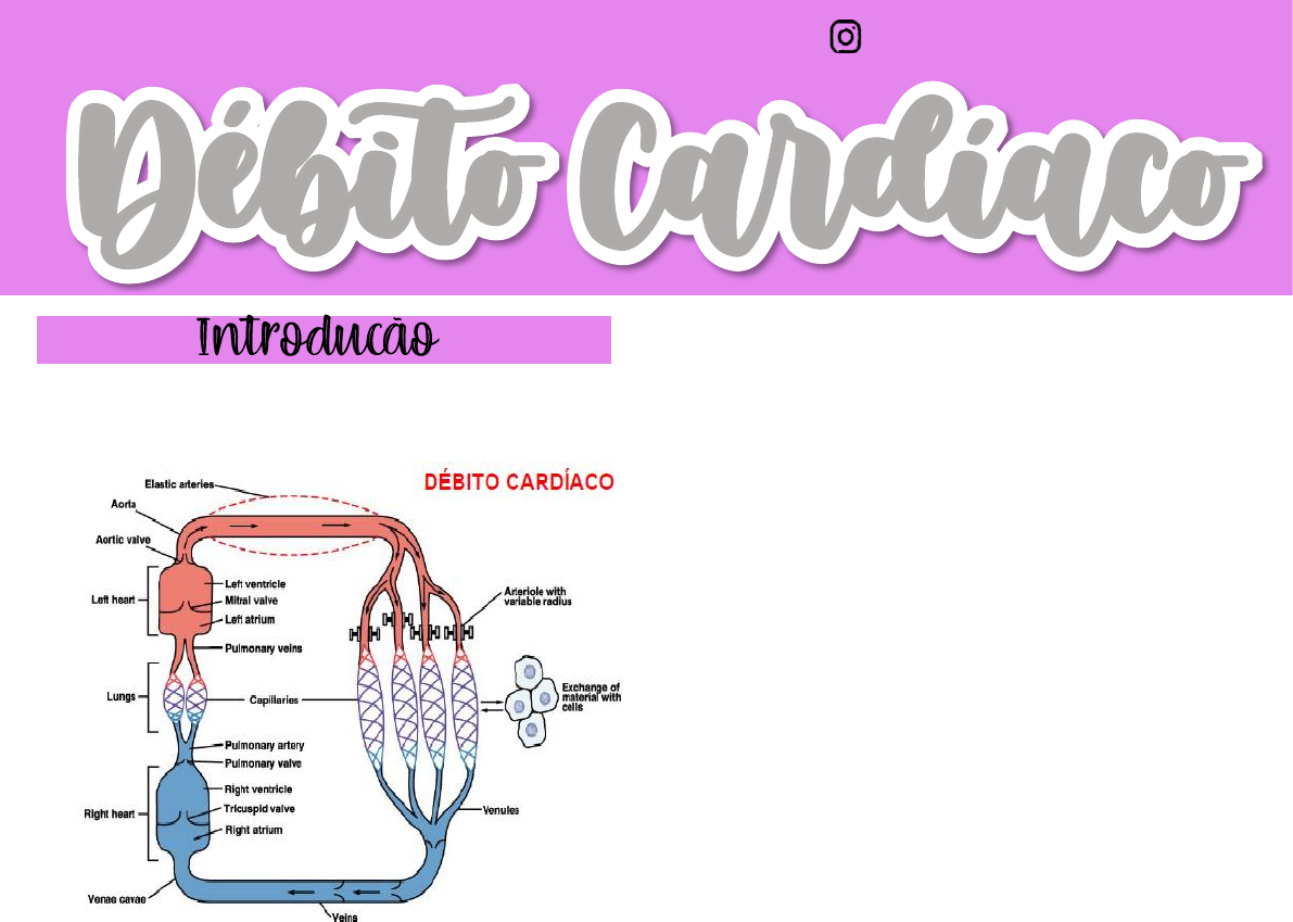 Mariana Rocha Cruz – UNIFESO- TURMA 102 @maridejaleco •O que é? É a quantidade de sangue ejetado pelo VE na aorta a cada minuto •Quantidade essa que é distribuída pelo sistema arterial, sangue arterial, rico em oxigênio com nutrientes a todos os tecidos, transportando elementos necessários para que eles realizem suas atividades metabólicas, oxigênio e nutrientes. •Os vasos sanguíneos envolvidos nessas difusões de oxigênio, de nutrientes aos tecidos, são os vasos capilares. •Esses mesmos tipos de vasos vão receber o CO2, produto metabólico, resíduos metabólicos dos tecidos. CO2, resíduos metabólicos que serão transportados pelo sistema venoso – sangue venoso – pobre em o2, átrio esquerdo de volta ao coração. Vários mecanismos podem controlar localmente o fluxo sanguíneo aos tecidos, interferindo com esses vasos de resistência. Ex: Metaarteriolas, arteríolas, esfíncteres pré capilares. Por que são chamados de vasos de resistência? •Devido a resistência da passagem de sangue, tem determinado tônus, grau de contração. Nisso, a contração ou relaxamento desses vasos podem levar alterações importantes da resistência, aumentando ou diminuindo, respectivamente, e com isso alterar o fluxo sanguíneo aos diversos tecidos; •Mesmo que o mecanismo nervoso, hormonal, sejam fatores importantes na regulação vasodilatação? vasoconstricção e consequentemente da regulação da resistência local, passagem de sangue, sendo considerado o mecanismo mais importante •Regulador local de fluxo, do tônus dos vasos de resistência, a própria atividade metabólica do tecido, ou seja, tecidos em maior atividade produzem certos metabólitos vasodilatadores, reduzem a resistência local, consequente, o fluxo sanguíneo para esses tecidos aumenta, pela vasodilatação local, aumentando o aporte de oxigênio e nutrientes para eles. Tecidos em menor atividade, menor produção desses vasodilatadores, o grau de vasoconstricção reduz o fluxo. •Então uma adaptação fisiológica extremamente importante diretamente correlacionada ao metabolismo local. Então esse mecanismo metabólico geralmente sobrepuja os mecanismos Débito Cardíaco Mariana Rocha Cruz – UNIFESO- TURMA 102 @maridejaleco Mariana Rocha Cruz – UNIFESO- TURMA 102 @maridejaleco de regulação, ou seja, se o tecido precisa receber mais ele cria condições aumentando o tônus desses vasos para que o fluxo sanguíneo a eles aumente. Se em um determinado momento, sua atividade metabólica se encontra reduzida, precisa de menos, condições são geradas as quais o fluxo sanguíneo é reduzido. •Essas redistribuições de sangue para as áreas de maior necessidade são muito importantes no circuito cardiovascular . Pressão arterial= DC x RVP DB (Débito cardíaco)= FC (frequência cardíaca) x VS(volume sistólico de ejeção) FC: normal- 70/80 bpm VS: normal- 70mL DB- normal; 4900 a 5600 ml/min – valor normal para indivíduo adulto jovem sadio. As mulheres apresentam estatisticamente um valor ligeiramente menor de 10 a 15%. •Percentual máximo de aumento do db durante a atividade física é chamada de reserva cardíaca, termo muito usado na medicina. Os atletas variam ainda mais, aumentar de 7 a 8x, 600 a 800%. Indivíduos com insuficiência cardíaca, déficit de contração, tem muito menor, impedindo o indivíduo de praticar atividade física. •O volume sistólico depende de dois fatores: 1. Volume diastólico final; 2. Volume de sangue presente no ventrículo ao final da diástole (120-130 ml), alguns chamam esse volume de pré-carga. • Outros chamam de pré-carga a pressão diastólica final, essa pressão distende o ventrículo relaxado e determina esse volume (volume diastólico final). •Além do volume diastólico final, esse sangue tem que ser ejetado, para isso o ventrículo tem que contrair. Força de contração, intensidade de contração ventricular, que gera pressão intraventricular que suplante a pressão aórtica. •Dessa forma, determina a abertura das válvulas semilunares: aórtica e pulmonar. •Normalmente se usa o termo pós-carga, é a carga contra qual o ventrículo exerce sua atividade contráctil, que engloba todos os fatores que criem resistência a ejeção de sangue a partir do ventrículo. Tendo como o principal fator a pressão arterial. •Então, ao final da diástole 120 ml, aí o ventrículo contrai ejeta um determinado valor 60%, que geralmente corresponde a 50 ml ao volume Mariana Rocha Cruz – UNIFESO- TURMA 102 @maridejaleco sistólico final, volume que tem no ventrículo no final da sístole (fração de ejeção). •PA = DC x RVP RVP – Somatório das resistências vasculares em um dado momento. Porque podemos ter em alguns leitos vasculares eles contraídos e outros dilatados, dependendo da necessidade do tecido naquele momento. Se o nº de vasos contraídos for maior do que os de dilatados, a RVP total aumenta. Já se os nº de vasos dilatados forem maiores que os contraídos, a RVP total diminui. É a resultante do somatório. Volume Sistólico depende: -Ionotropismo – força de contração que deve liberar uma pressão intraventricular que suplante a intra-arterial. - Volume diastólico final (pré-carga) - Pós-carga •É uma propriedade intrínseca, baseada na Lei De Frank-Starling, no qual aumenta a capacidade de bombeamento quando eu amento o aporte de sangue. Evitando que o sangue fique represado no coração. Fazendo o retorno venoso, um dos fatores mais relevantes, principal regulador do débito cardíaco; •E o que é maior? O retorno venoso ou o dpebito cardíaco? Resposta- São iguais, devido a homeostasia; Em período de tempo prolongado, são iguais. Mas as ações do dia a dia podem causar desequilíbrios nessa reação, mas reequilibram essa reação por mecanismos. •Corresponde ao número de contrações por minuto, no de batimentos/minuto. Coração que tem uma ritmicidade normal (cronotropismo) – ritmo e
