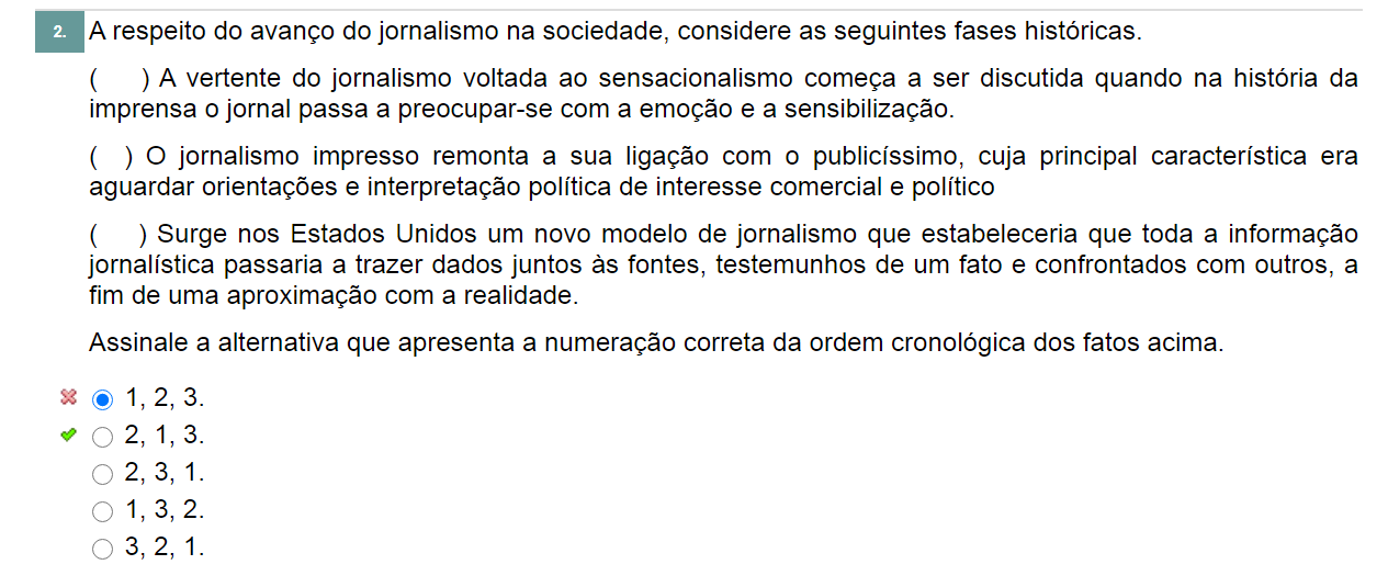 A respeito do avanço do jornalismo na sociedade, considere as seguintes fases históricas. Assinale a alternativa que apresenta a numeração correta da ordem cronológica dos fatos acima. ( ) A vertente do jornalismo voltada ao sensacionalismo começa a ser discutida quando na história da imprensa o jornal passa a preocupar-se com a emoção e a sensibilização. ( ) jornalismo impresso remonta a sua ligação com o publicíssimo, cuja principal característica era aguardar orientações e interpretação política de interesse comercial e político. ( ) Surge nos Estados Unidos um novo modelo de jornalismo que estabeleceria que toda a informação jornalística passaria a trazer dados juntos às fontes, testemunhos de um fato e confrontados com outros, a fim de uma aproximação com a realidade. 1, 2, 3. 2, 1, 3. 2, 3, 1. 2.