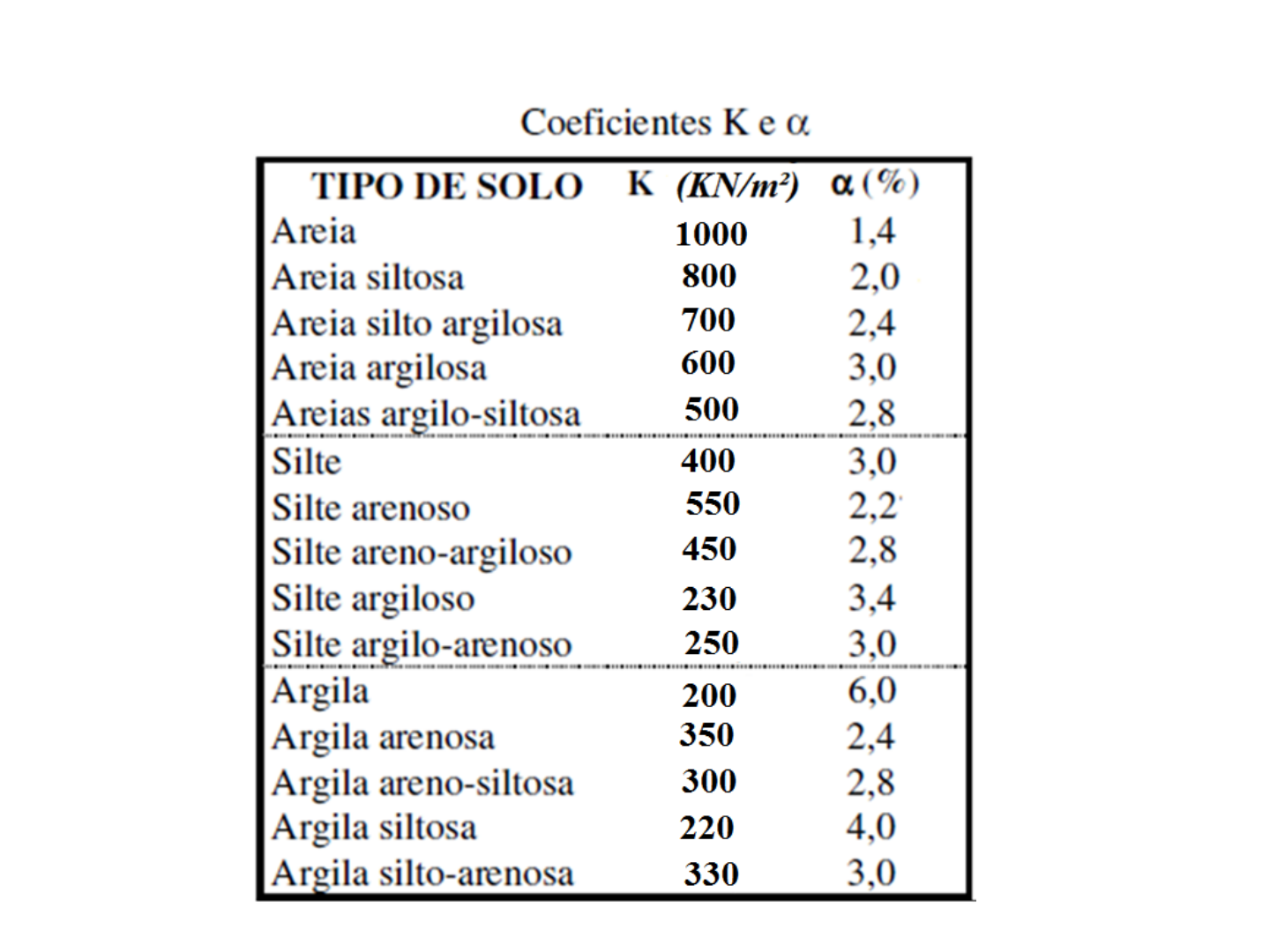 MÉTODO AOKI –VELLOSO (1975) Onde D é o diâmetro em cm mantendo a relação F2=2F1. MÉTODO DECOURT-QUARESMA (1978) MÉTODO DECOURT-QUARESMA (1978)