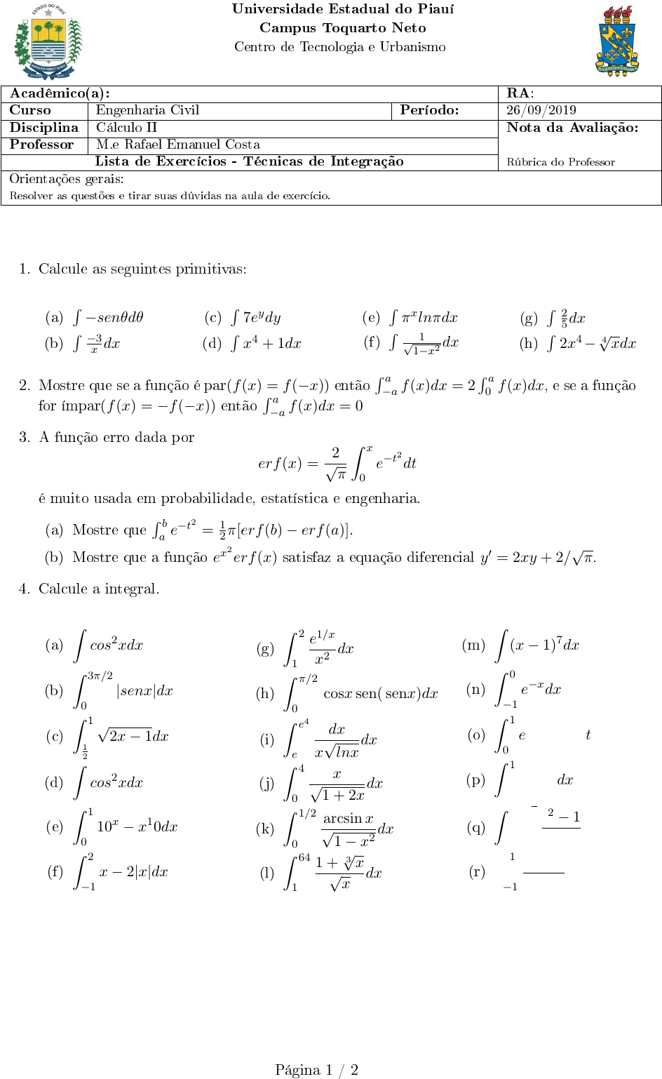 Universidade Estadual do Piauí Campus Toquarto Neto Centro de Tecnologia e Urbanismo Acadêmico(a): RA: Curso Engenharia Civil Período: 26/09/2019 Disciplina Cálculo II Nota da Avaliação: Professor M.e Rafael Emanuel Costa Lista de Exercícios - Técnicas de Integração Rúbrica do Professor Orientações gerais: Resolver as questões e tirar suas dúvidas na aula de exercício. 1. Calcule as seguintes primitivas: (a) ∫ −senθdθ (b) ∫ −3 x dx (c) ∫ 7eydy (d) ∫ x4 + 1dx (e) ∫ πxlnπdx (f) ∫ 1√ 1−x2dx (g) ∫ 2 5dx (h) ∫ 2x4− 4 √ xdx 2. Mostre que se a função é par(f(x) = f(−x)) então ∫ a −a f(x)dx = 2 ∫ a 0 f(x)dx, e se a função for ímpar(f(x) = −f(−x)) então ∫ a −a f(x)dx = 0 3. A função erro dada por erf(x) = 2√ π ∫ x 0 e−t 2 dt é muito usada em probabilidade, estatística e engenharia. (a) Mostre que ∫ b a e −t2 = 12π[erf(b)− erf(a)]. (b) Mostre que a função ex 2 erf(x) satisfaz a equação diferencial y′ = 2xy + 2/ √ π. 4. Calcule a integral. (a) ∫ cos2xdx (b) ∫ 3π/2 0 |senx|dx (c) ∫ 1 1 2 √ 2x− 1dx (d) ∫ cos2xdx (e) ∫ 1 0 10x − x10dx (f) ∫ 2 −1 x− 2|x|dx (g) ∫ 2 1 e1/x x2 dx (h) ∫ π/2 0 cosx sen( senx)dx (i) ∫ e4 e dx x √ lnx dx (j) ∫ 4 0 x√ 1 + 2x dx (k) ∫ 1/2 0 arcsinx√ 1− x2 dx (l) ∫ 64 1 1 + 3 √ x√ x dx (m) ∫ (x− 1)7dx (n) ∫ 0 −1 e−xdx (o) ∫ 1 0 e−tsenhtdt (p) ∫ 1 0 xe−x 2 dx (q) ∫ 1/√3 0 t2 − 1 t4 − 1 dx (r) ∫ 1 −1 1 1 + x2 dx Página 1 / 2 5. Veri�que, por derivação, que a fórmula está correta. (a) ∫ x√ x2 + 1 dx = √ x2 + 1 + C (b) ∫ cos3dx = senx− 1 3 sen3x+ C (c) ∫ x√ a+ bx dx = 2 3b2 (bx− 2a) √ a+ bx+ C 6. A função velocidade (em metros por segundo) é dada para uma partícula movendo-se ao longo de uma reta. Encontre (a) o deslocamento e (b) a distância percorrida pela partícula durante o intervalo de tempo dado. i) v(t) = 3t− 5 0 ≤ t ≤ 3 ii) v(t) = t2 − 2t− 8 1 ≤ t ≤ 6 7. A função aceleração (emm/s) e a velocidade inicial são dadas para uma partícula movendo- se ao longo de uma reta. Encontre (a) a velocidade no instante t e (b) a distância percorrida durante o intervalo de tempo dado. i) v(t) = t+4, v(0) = 5 0 ≤ t ≤ 10 ii) v(t) = 2t+3 v(0) = −4 0 ≤ t ≤ 3 8. Calcule as integrais. (a) ∫ x cos5xdx (b) ∫ ln 3 √ xdx (c) ∫ t2senβtdt (d) ∫ e−θ cos2θdθ (e) ∫ (lnx)2dx (f) ∫ xe2x (1 + 2x)2 dx (g) ∫ xtg2xdx (h) ∫ 1 0 x coshxdx (i) ∫ 2 1 x4(lnx)2dx (j) ∫ t 1 es sen(t− s)ds (k) ∫ r3 4 + r2 dr (l) ∫ 2π 0 t2 sen(2t)dt 9. Use integração por partes para demonstrar a fórmula de redução. (a) ∫ (lnx)ndx = x(lnx)n − n ∫ (lnx)n−1dx (b) ∫ xnexdx = xnex − n ∫ xn−1exdx (c) ∫ tgnxdx = tgn−1 n− 1 − ∫ tgn−2xdx (n 6= 1) 10. Use o exercício anterior para encontrar. (a) ∫ (lnx)3dx (b) ∫ x4exdx 11. Uma partícula que se move ao longo de uma reta tem velocidade igual a v(t) = t2e−t metros por segundo após t segundos. Qual a distância que essa partícula percorrerá durante os primeiros t segundos? Bons estudos!! Página 2 / 2