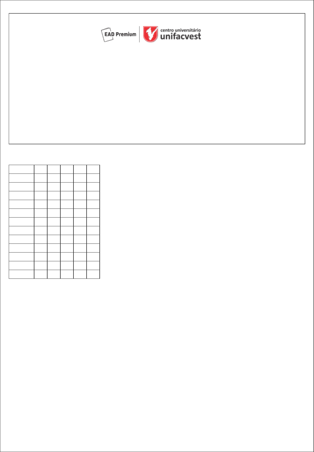 Requisição: 3022542 Matricula: 552133 Data: 07/01/2021 15:41 Página: 1/8 Prova presencial regular Curso: 24 MESES - TECNOLOGIA MARKETING - UNIFACVEST EAD Módulo: 3 Grupo: 179 Município: SÃO LOURENÇO - MG Disciplina(s): 100919 - COMUNICAÇÃO EMPRESARIAL Nome: 552133 - LUCAS DA SILVA Data: ___/___/_________ Assinatura do aluno: ________________________________________________________ Preencha o gabarito abaixo com X na coluna correta. Atente para a coluna de numeração e das alternativas. Questões A B C D E 1 2 3 4 5 6 7 8 9 10 11 12 1 ) Gestão do Conhecimento é, em síntese, a transformação de conhecimento tácito em explícito. Sobre cada um desses conhecimentos é correto afirmar: A ) O conhecimento explícito pode prescindir do conhecimento implícito, uma vez que depende do indivíduo compartilhar com a empresa o seu conhecimento desde o momento em que ingressa na organização. B ) O conhecimento explícito é aquele que todo indivíduo possui, embora não tenha consciência disso. C ) Ambos os conhecimentos são importantes, mas somente o conhecimento explícito interessa à empresa. Requisição: 3022542 Matricula: 552133 Data: 07/01/2021 15:41 Página: 2/8 D ) O conhecimento explícito apresenta-se como uma forma racionalizante, articulada e verbalizada. E ) A passagem de um "estado" para outro se dá naturalmente, exigindo, no entanto, um ambiente propício para que os saberes se evidenciem. 2 ) Robbins (2006, p. 328) apresenta um "processo de conflito" dividido em cinco estágios. Além dessa contribuição, de grande importância para se conhecer os vários momentos do conflito, sua morfologia, por assim dizer, o teórico desenvolveu técnicas para a resolução do problema. Dentre as técnicas, há uma que se caracteriza pela seguinte iniciativa: "a administração usa sua autoridade formal para resolver o conflito e depois comunica seu desejo às partes envolvidas". Indique a opção que corresponde a essa técnica. A ) Alteração de variáveis humanas. B ) Comando autoritário. C ) Metas superordenadas. D ) Alteração de variáveis estruturais. E ) Resolução de problemas 3 ) A criação de uma campanha publicitária é uma das tarefas mais difíceis e complexas de comunicação, e por isso mesmo se presta a um exercício de definição de estratégias de comunicação. Lembrando que, do ponto de vista da Comunicação Empresarial, essa campanha enquadra-se, em termos das quatro áreas relacionadas por Kunsch (2003), na mercadológica, representada pelo marketing, e no interior da qual há outras subáreas. Indique em quais situações, esquematicamente, opta-se em se desenvolver uma campanha publicitária. A ) Em duas situações-chave: a) lançamento de produto b) para se fazer reforço da marca. Requisição: 3022542 Matricula: 552133 Data: 07/01/2021 15:41 Página: 3/8 B ) Sempre, conforme disponibilidade de recursos. C ) Queda de vendas, lançamento de produtos, promoção. D ) A Comunicação Integrada de Marketing não considera situações especialmente relevantes para a veiculação de propaganda, devendo ações desse tipo ocorrer sempre que houver um motivo suficientemente forte no mercado como um todo, tal é o caso dos lançamentos da concorrência, entrada de novo concorrente no mercado, divulgação de promoções etc. E ) Em quatro situações-chave: a) para se fazer reforço da marca; b) para o lançamento de produtos ou serviços; c) para posicionamento ou reposicionamento de marcas, produtos ou serviços; d) para impulsionar ou recuperar vendas 4 ) Comunicação administrativa é "aquela que se processa dentro da organização, no âmbito das funções administrativas; é a que permite viabilizar todo sistema organizacional, por meio de uma confluência de fluxos e redes" (KUNSCH, 2003, p. 152). A noção de sistema referida acima somente se impõe se de fato ocorrer um permanente processo de comunicação, visando ao cumprimento de tais objetivos. Cabe à comunicação administrativa a convergência de ações de todos os processos, transformando os recursos em produtos, serviços ou resultados. De acordo com Charles Redfield, a comunicação administrativa se compõe de cinco elementos: "um comunicador (locutor, remetente, editor), que transmite (diz, expede, edita) mensagens (ordens, relatórios, sugestões) a um destinatário (público, respondente, audiência), a fim de influenciar o comportamento deste, conforme comprovará sua resposta (réplica, reação)" (1980, p. 6 apud KUNSCH, 2003, p. 153). De posse dessas informações, assinale a opção que indica o fluxo que ocorre em organizações com estruturas menos centralizadas e com maior flexibilidade. A ) Ascendente B ) Horizontal C ) Circular D ) Transversal E ) Descendente Requisição: 3022542 Matricula: 552133 Data: 07/01/2021 15:41 Página: 4/8 5 ) "O gerenciamento cuidadoso de informações detalhadas sobre cada cliente e de todos os 'pontos de contato' com ele, a fim de maximizar sua fidelidade" é o conceito de: A ) Datawarehouse B ) CVLT - Customer Value Life Time C ) Call Center D ) CRM - Customer Relationship Management E ) ERP - Enterprise Resource Planning 6 ) Na história da comunicação empresarial no Brasil, tendo como antecedente o desenvolvimento das relações públicas, qual das opções abaixo melhor estabelece a cronologia dos eventos: A ) Criação de sindicatos nos anos 20 e 30, para onde se dirigem jornalistas que depois se tornaram os primeiros relações-públicas no país; criação do curso de RP pela Escola Superior de Administração e Negócios, em 1955; criação da Associação Paulista de Relações Públicas, em 1959; fundação da Aberje, em 1987 B ) Início do Estado Novo, em 1937; ações no governo JK; ações no governo Jânio Quadros; criação do curso de RP na Escola de Comunicações e Artes/USP; fundação da Aberje, em 1987. C ) Eduardo Pinheiro Lobo, em 1914, começa a trabalhar na empresa de força e luz Light e lá adota procedime