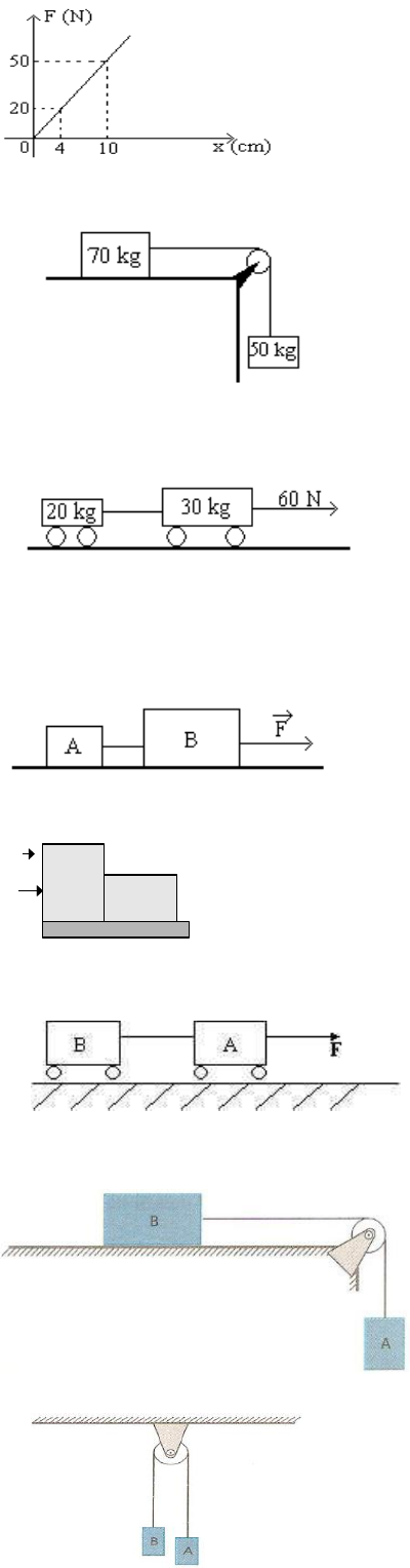 1) Uma mola é esticada desde sua posição inicial, não alongada, até uma posição em que o alongamento é 10 cm. O gráfico mostra a intensidade da força tensora em função do alongamento. Determine a constante elástica da mola. 2) A figura mostra um corpo de massa igual a 70 kg, sobre uma mesa horizontal, ligado por uma corda a um segundo corpo de massa igual a 50 kg. Despreze a massa da corda, bem como todas as forças de atrito. Adotando g = 10 m/s 2 , determine: a) A aceleração do conjunto. b) A força de tração na corda. 3) No sistema da figura despreze dissipação, inércia das rodas e efeito do ar ambiente. Os carros são interligados por um fio leve, flexível e inextensível. Determine: a) a aceleração do conjunto. b) a intensidade da força de tração no fio de ligação. 4) Consideremos dois corpos A e B apoiados sobre uma superficial horizontal e interligados por meio de um fio ideal. Sendo F = 20 N, mA = 4 kg e mB = 6 kg, despreze os atritos e determine: a) a aceleração do sistema; b) a força tensora no fio. 5) Uma força horizontal de 10N é aplicada ao bloco A, de 6 kg o qual por sua vez está apoiado em um segundo bloco B de 4 kg. Se os blocos deslizam sobre um plano horizontal sem atrito, qual a força em Newtons que um bloco exerce sobre o outro? 6) Os dois carrinhos da figura abaixo, estão ligados entre si por um fio leve e inextensível. "A" tem massa de 2 Kg e "B", 10 Kg. Uma força de 48 N puxa, horizontalmente para a direita o carrinho "B". A aceleração do sistema vale: a) 4,0 m/s 2 b) 4,8m/s 2 c) 10 m/s 2 d) 576m/s 2 7) No conjunto da figura abaixo, o bloco A tem massa 0,50 Kg. O bloco B, de massa 4,5 Kg, está sobre o plano sem atrito. Admitindo g = 10 m/s 2 e o fio inextensível (que não pode ser estendido; extensivo), determine: a) A aceleração do Conjunto; b) A Tração no Fio. 8) No dispositivo da figura abaixo, o fio e a polia, têm massa desprezível. Sendo mA = 0,5 kg e mB = 1,5 kg, determine: Admitindo g = 10 m/s 2 determine: a) A aceleração do Conjunto; b) A Tração no Fio. F A B
