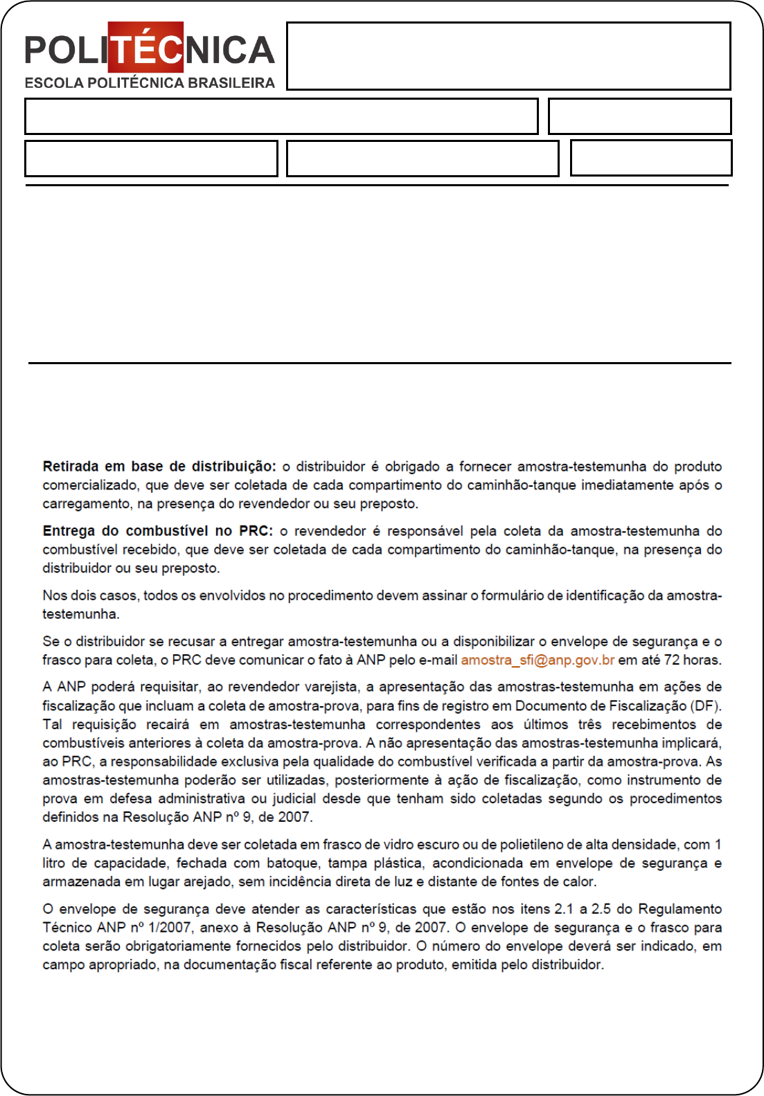 Avaliação de Pesquisa: Análise de Combustíveis 1. Com base no material de aula, detalhe sobre amostra-testemunha: direito do posto revendedor de combustíveis. Análise de Combustíveis Aluno (a): Jefferson Leonardo Cruz Data: 01/03/2021 Atividade de Pesquisa NOTA: ORIENTAÇÕES: Ler atentamente as instruções contidas no documento é de fundamental importância na realização da avaliação. Para esta atividade o aluno poderá utilizar-se das ferramentas de pesquisas como: internet, artigos científicos, manuais técnicos, livros e literaturas disponibilizadas em nossa biblioteca. Preencha todos os dados referente a sua identificação como: nome completo, data de entrega. As respostas poderão ser de escritas forma manual e/ou digitadas abaixo de cada pergunta. Ao terminar a avaliação o arquivo deverá ser salvo com o nome: "Avaliação de Pesquisa" (nome do aluno). Envie o arquivo pelo sistema em formato digital em pdf ou word. Bons Estudos! Avaliação de Pesquisa: Análise de Combustíveis 2. Detalhe o passo a passo (procedimento) da análise de campo na gasolina C: teor de etanol anidro combustível (EAC) na gasolina. Avaliação de Pesquisa: Análise de Combustíveis 3. Pesquise e descreva sobre as diretrizes e objetivo da Lei nº 9.847, de 26 de outubro de 1999 – fiscalização das atividades do abastecimento nacional de combustíveis. Avaliação de Pesquisa: Análise de Combustíveis 4. O cadastro do PRC deve estar sempre atualizado. As alterações de cadastro deverão ser realizadas também por meio do sistema SRD-PR, observados quais situações? 5. Quais são os procedimentos observados pela ANP ou por órgãos públicos conveniados para realizar a desinterdição do Posto Revendedor? A desinterdição somente poderá ser realizada pela ANP, por órgãos públicos conveniados ou por representante indicado pela ANP, observado os seguintes procedimentos: Avaliação de Pesquisa: Análise de Combustíveis 6. Para instalar um PRC, é necessário licenciamento ambiental. A Resolução nº 273, de 29 de novembro de 2000, do Conselho Nacional do Meio Ambiente (Conama), trata do licenciamento prévio do órgão ambiental competente para localização, construção, instalação, modificação, ampliação e operação de postos revendedores. Quais são as outras medidas ambientalmente obrigatórias?