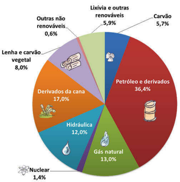 Matriz energética brasileira Matriz energética brasileira é o conjunto de fontes de energia utilizadas no Brasil. No nosso país, a maior parte da energia consumida tem origem no petróleo e nos seus derivados, uma fonte não renovável. A proporção de energia renovável utilizada no Brasil, no entanto, é bastante considerável. No conjunto das fontes energéticas, a sua proporção é maior do que a energia a partir do petróleo e derivados. Consumo das fontes de energia no Brasil De acordo com dados de 2017 do EPE - Empresa de Pesquisa Energética, a utilização das energias não renováveis resultou em aproximadamente 37%, enquanto a das energias não renováveis em 43%, distribuído da seguinte forma: etanol, correspondeu a 17,0%, seguido da energia hidráulica, com uma média de 12,0%. Na sequência, 8% da energia consumida teve origem em lenha e carvão vegetal e, finalmente, em lixívia e outras energias renováveis, o que correspondeu a 5,9%. Fonte: epe.gov.br O que é matriz energética? Matriz energética é o parque de fontes de energia utilizados para atender a demanda de energia da sociedade. As fontes de energia podem ser renováveis e não renováveis. As energias renováveis provém de recursos naturais, tal como água, vento e sol, e podem ser reabastecidos, ou renovados, de forma mais ou menos contínua e rápida. Além disso, são pouco poluentes. As energias não renováveis têm origem na queima de combustíveis fósseis, que demoram milhões de anos para serem formados. São sinônimo de energia suja, pois são altamente poluentes. Fontes de energia da matriz energética do Brasil Energias renováveis Biomasssa: tem origem na matéria orgânica, tal como o etanol, que é feito a partir do processamento da cana-de-açúcar. Exemplo: Usina São Martinho, em São Paulo. Eólica: tem origem na energia do vento. Exemplo: Usina Eólica de Prainha, localizada no Ceará. Hidráulica: tem origem na energia das correntes de água. Exemplo: Usina Hidrelétrica de Itaipu, localizada entre o Brasil e o Paraguai. Solar: tem origem na luz solar, mediante a utilização de placas solares. Exemplo: Usina Megawatt Solar, em Florianópolis. Energias não renováveis Carvão mineral: tem origem no carvão, que é um combustível fóssil. Exemplo: Jazida de carvão mineral no vale do rio Jacuí, no Rio Grande do Sul. Gás natural: tem origem na mistura de derivados de combustíveis fósseis. Exemplo: Gasoduto Bolívia - Brasil, que interliga ambos países. Petróleo: tem origem na decomposição de matéria orgânica. Exemplo: Bacia de Campos, que se estende do Espírito Santo ao Rio de Janeiro. Nuclear: tem origem na liberação de núcleos atômicos. Exemplo: Angra 1, a primeira usina nuclear brasileira. Matriz energética mundial Enquanto no Brasil, a maior parte da energia utilizada, 43%, ou seja, quase metade, é renovável, no mundo esse número é muito diferente. As matrizes energéticas dos países têm as energias não renováveis como principal fonte, em que se destacam o petróleo, o carvão e o gás natural. Apenas uma pequena porcentagem da energia utilizada é renovável, o que corresponde a uma média de 14%. Fonte: epe.gov.br Energias renováveis e não renováveis: vantagens e desvantagens A matriz energética não renovável tem como vantagem um esforço financeiro inferior ao das energias renováveis. A sua grande desvantagem é a alta emissão de poluentes e a degradação das espécies causada em decorrência de acidentes como derramamento de petróleo. Por sua vez, a maior vantagem de uma matriz energética renovável é a redução na poluição. O aumento da biomassa tem como resultado a emissão de menos gases poluentes; milhões de toneladas de gás carbônico deixam de ser lançados para a atmosfera. Em contrapartida, essa fonte energética exige um alto investimento financeiro, que é consequentemente a sua maior desvantagem. A construção de usinas, além de dispendiosas, envolvem questões ambientais, uma vez que implicam na alteração do curso de rios e, com isso, surgem danos para a fauna e para a flora. Matriz elétrica brasileira A matriz elétrica brasileira tem como principal fonte a energia hidráulica. Isso acontece graças à disponibilidade de água no país, que o coloca numa situação bastante confortável no que respeita à produção de eletricidade. No Brasil, a produção da energia elétrica com fonte renovável representa 80,4%, dos quais 65,2% tem origem hidráulica. Em termos comparativos, importa referir que apenas 24% da energia elétrica no mundo é renovável.