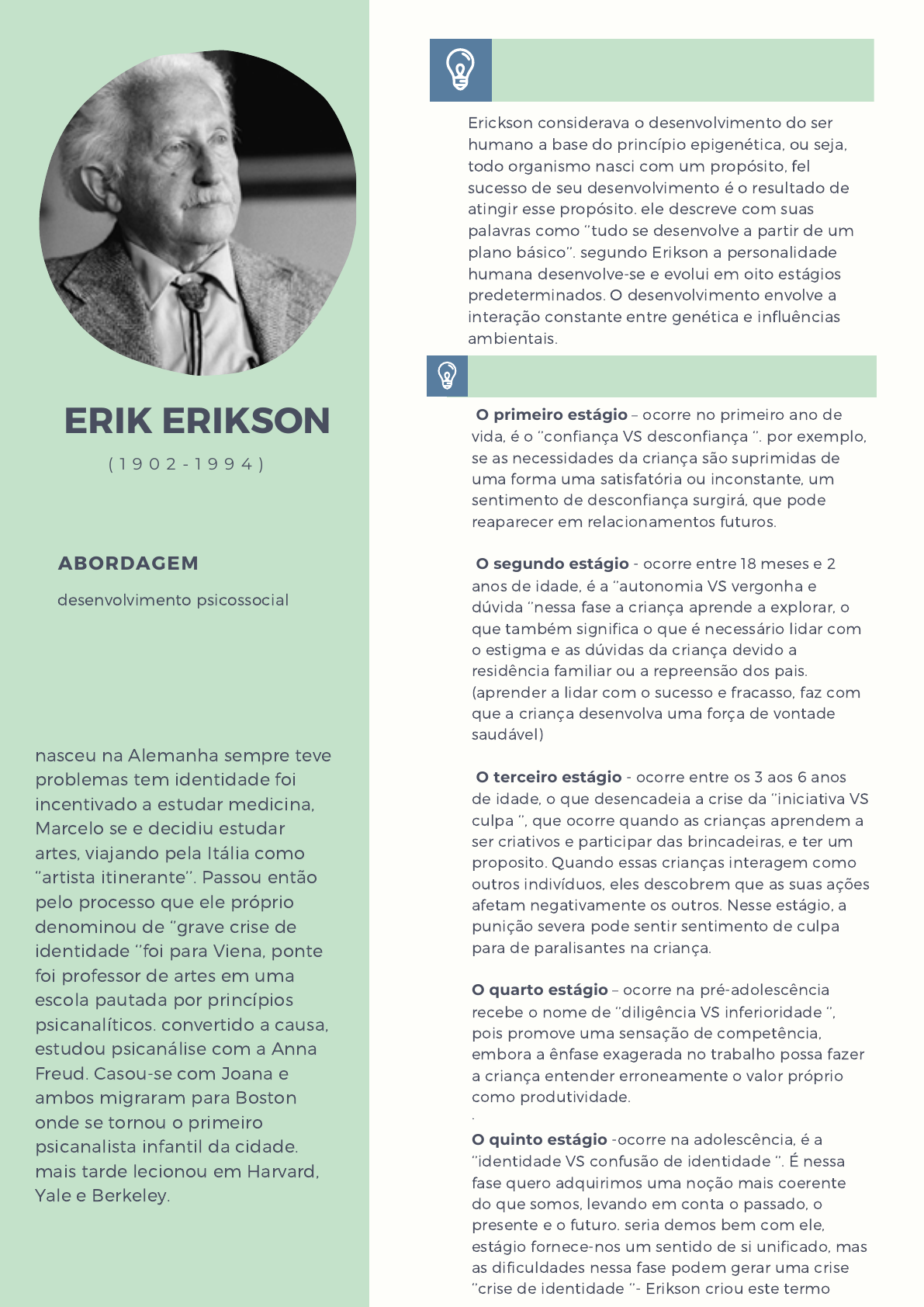 DESENVOLVIMENTO DA PERSONALIDADE OS OITOS ESTAGIOS Erickson considerava o desenvolvimento do ser humano a base do princípio epigenética, ou seja, todo organismo nasci com um propósito, fel sucesso de seu desenvolvimento é o resultado de atingir esse propósito. ele descreve com suas palavras como ‘’tudo se desenvolve a partir de um plano básico’’. segundo Erikson a personalidade humana desenvolve-se e evolui em oito estágios predeterminados. O desenvolvimento envolve a interação constante entre genética e influências ambientais. ERIK ERIKSON ( 1 9 0 2 - 1 9 9 4 ) ABORDAGEM desenvolvimento psicossocial nasceu na Alemanha sempre teve problemas tem identidade foi incentivado a estudar medicina, Marcelo se e decidiu estudar artes, viajando pela Itália como ‘’artista itinerante’’. Passou então pelo processo que ele próprio denominou de ‘’grave crise de identidade ‘’foi para Viena, ponte foi professor de artes em uma escola pautada por princípios psicanalíticos. convertido a causa, estudou psicanálise com a Anna Freud. Casou-se com Joana e ambos migraram para Boston onde se tornou o primeiro psicanalista infantil da cidade. mais tarde lecionou em Harvard, Yale e Berkeley. O primeiro estágio – ocorre no primeiro ano de vida, é o ‘’confiança VS desconfiança ‘’. por exemplo, se as necessidades da criança são suprimidas de uma forma uma satisfatória ou inconstante, um sentimento de desconfiança surgirá, que pode reaparecer em relacionamentos futuros. O segundo estágio - ocorre entre 18 meses e 2 anos de idade, é a ‘’autonomia VS vergonha e dúvida ‘’nessa fase a criança aprende a explorar, o que também significa o que é necessário lidar com o estigma e as dúvidas da criança devido a residência familiar ou a repreensão dos pais. (aprender a lidar com o sucesso e fracasso, faz com que a criança desenvolva uma força de vontade saudável) O terceiro estágio - ocorre entre os 3 aos 6 anos de idade, o que desencadeia a crise da ‘’iniciativa VS culpa ‘’, que ocorre quando as crianças aprendem a ser criativos e participar das brincadeiras, e ter um proposito. Quando essas crianças interagem como outros indivíduos, eles descobrem que as suas ações afetam negativamente os outros. Nesse estágio, a punição severa pode sentir sentimento de culpa para de paralisantes na criança. O quarto estágio – ocorre na pré-adolescência recebe o nome de ‘’diligência VS inferioridade ‘’, pois promove uma sensação de competência, embora a ênfase exagerada no trabalho possa fazer a criança entender erroneamente o valor próprio como produtividade. · O quinto estágio -ocorre na adolescência, é a ‘’identidade VS confusão de identidade ‘’. É nessa fase quero adquirimos uma noção mais coerente do que somos, levando em conta o passado, o presente e o futuro. seria demos bem com ele, estágio fornece-nos um sentido de si unificado, mas as dificuldades nessa fase podem gerar uma crise ‘’crise de identidade ‘’- Erikson criou este termo PRINCIPAIS TRABALHOS 1950 infância e sociedade 1964 Insight and responsibility 1968 identidade: Juventude e crise O sexto estágio - ocorre entre 18 e 30 anos de idade, é a ‘’intimidade versus isolamento’’, nela construímos vínculos Fortes e amamos O sétimo estágio - ocorre aos 35 até os 60 anos é a ‘’produtividade VS estagnação’’ e é marcada pelo empenho em prol das gerações futuras, ou por contribuições a sociedade por meio de atividades culturais ou ativismo social. O oitavo estágio - ocorre por volta dos 60 anos é a ‘’integridade versus desespero’’. As pessoas refletem sobre a própria vida e sentem-se você é desfeita ou se desesperam com a debilidade física e a morte. te dar bem com essa fase leva a conquista da sabedoria. ERICSSON DISSE QUE, NA TERCEIRA IDADE ATINGIMOS UMA SENSAÇÃO DE COMPLETUDE E ‘’INTEIREZA PESSOAL ‘’ QUEM É DIRETAMENTE PROPORCIONAL AO GRAU DE SUCESSO O QUE TIVEMOS AO LIDAR COM OS ESTÁGIOS ANTERIORES. May Karuta
