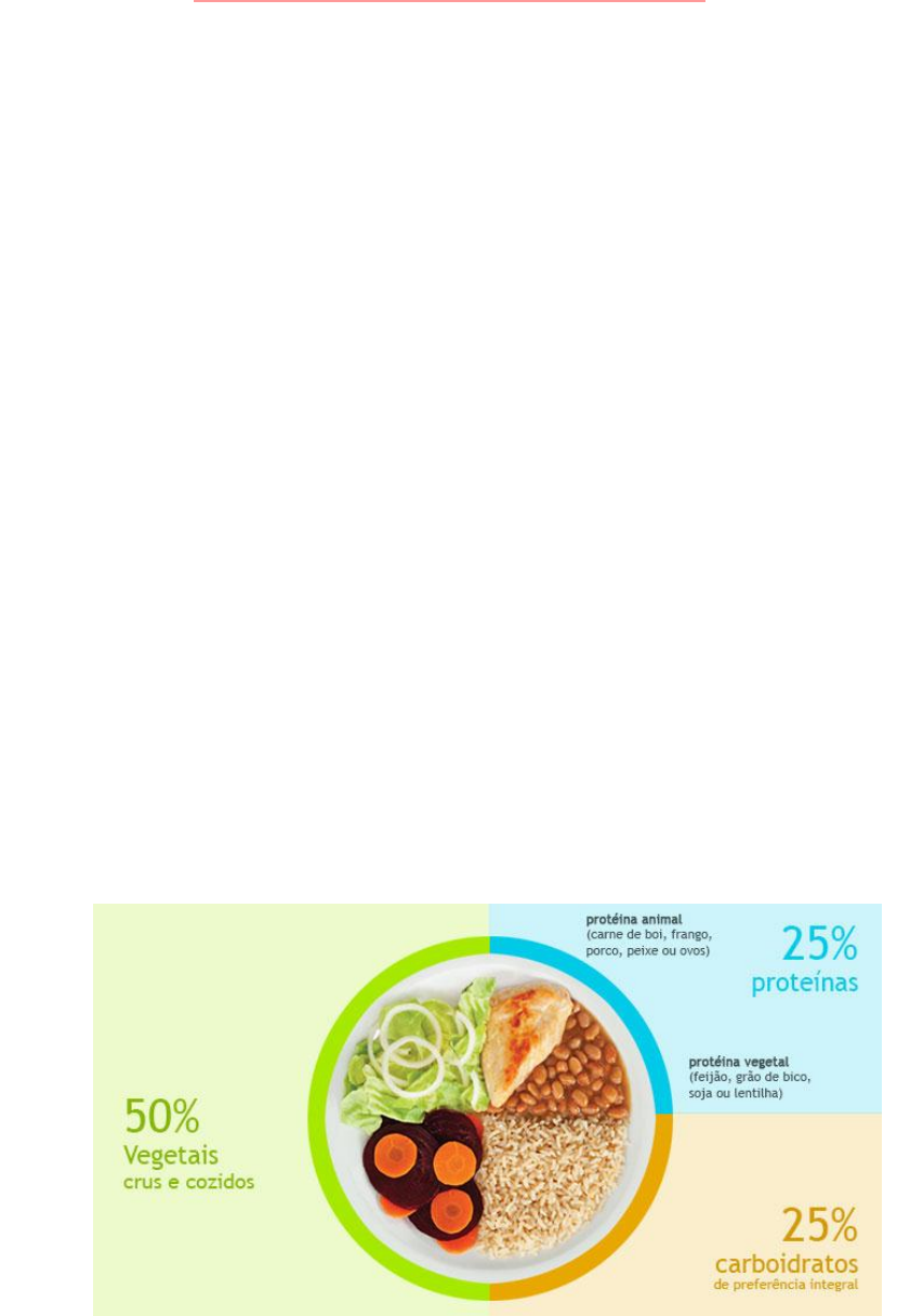 Como montar um prato saudável Para montar um prato saudável de acordo com o Guia Alimentar da População Brasileira, devemos dividir em: 25% de Carboidratos: como por exemplo macarrão, arroz branco, massas, batata ou batata-doce. São responsáveis pela energia no organismo. Dê preferência para os integrais (como arroz integral, batata-doce). 25% de Proteínas: como leguminosas (feijões, lentilha, grão de bico), carnes vermelhas, frango, peixe e ovos. Tem um papel importante na formação de músculos, ossos, unhas e cabelos. Evite frituras, prefira assados e grelhados. 50% de Hortaliças: como por exemplo alface, tomate, couve, chuchu, cenoura, beterraba, quiabo, brócolis, entre outros. Podendo ser crus, cozidos ou refogados. Consuma três variedades de folhas e legumes. A sobremesa é opcional, mas dê preferências a frutas. (Por exemplo: laranja, acerola, abacaxi, limão) . OBS: Tente deixar sempre o seu prato colorido! O Guia Alimentar para a População Brasileira apresenta diretrizes alimentares para a população, ele aborda os princípios e recomendações para uma alimentação adequada e saudável. Está disponível para todas as pessoas e se encontra no google pra quem quiser dar uma olhada! @nutri.carolinafurlan
