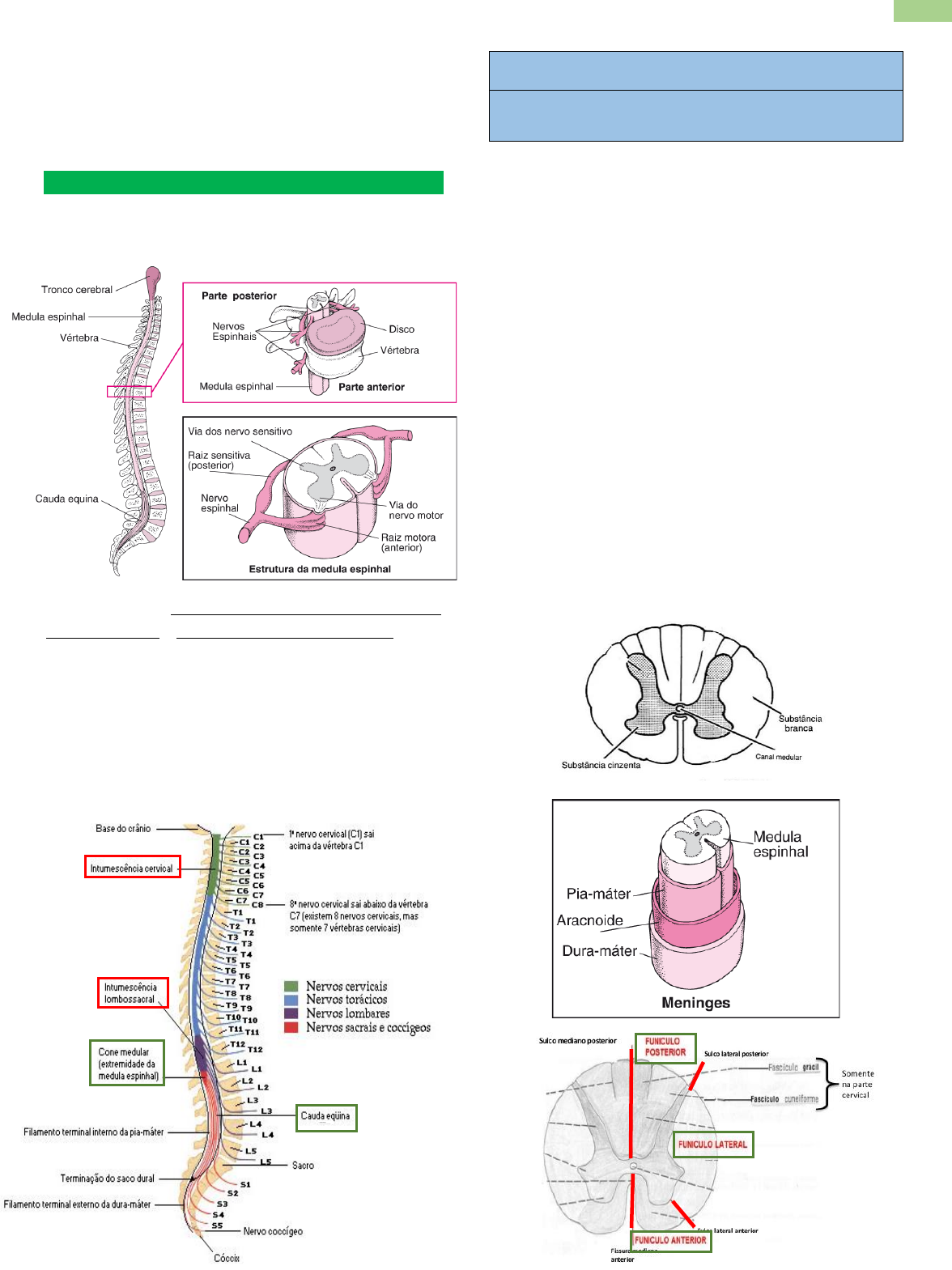 1 Tutoria Neurologia I Vitória Trindade - 2020 TUTORIA 2 MEDULA ESPINHAL ANATOMIA DA MEDULA - A medula espinhal é uma massa cilíndrica de 45cm que fica dentro do canal vertebral. - Cranialmente limita-se com o bulbo ao nível do forame magno e caudalmente termina em L2, onde forma o cone medular, que continua com um filamento meníngeo. (a coluna vertebral é maior que a medula em comprimento). - Após o cone medular, há apenas nervos espinhais que formam a cauda equina. (marcado em verde) – cone medular → cauda equina INTUMESCÊNCIA NA COLUNA VERTEBRAL ✓ Cervical: plexo braquial – inerva os MMSS. ✓ Lombar: plexo lombo-sacro – inerva os MMII. - Substancia cinzenta: corpo celular dos neurônios • Gânglios: aglomerado de corpos celulares no SNP. - Substancia branca: axônios com mielina. • A substancia branca é dividida em funículos: ▪ Funículo posterior ▪ Funículo lateral ▪ Funículo anterior • Dentro dos funículos vamos ter: ▪ Tratos: feixe de fibras com a mesma origem, função e destino. ▪ Fascículos: trato mais compacto. ▪ Lemniscos: feixes de fibras sensitivas que levam impulsos ao tálamo. 2 Tutoria Neurologia I Vitória Trindade - 2020 - Com relação às meninges que envolvem a medula, existem três cavidades ou espaços: • Epidural: fica entre o canal vertebral e a dura-máter. • Subdural: fica entre a dura-máter e a aracnoide. • Subaracnóideo: fica entre a aracnoide e a pia-máter. É o maior espaço, onde se localiza grande quantidade de líquor. A exploração do espaço subaracnóideo pode servir para: ✓ Retirada de líquor para fins terapêuticos ou diagnósticos. ✓ Medida da pressão do líquor. ✓ Introdução de anestésicos nas anestesias raquidianas. ✓ Administração de medicamentos. Anestesia Raquidiana: ✓ É o nome dado para a anestesia decorrente da aplicação de um anestésico local no interior do espaço subaracnóideo (líquor) – entre a pia-mater e a aracnoide. ✓ Resultando em perda da atividade autônoma, sensitiva e motora. Anestesia Peridural: • A anestesia peridural é um tipo de anestesia aplicada no espaço peridural, sem perfurar a duramáter e, portanto, sem atingir o líquor. Ela mantém a pessoa acordada, mas torna insensível a parte inferior do corpo, normalmente até o umbigo. (MUITO USADO EM GRÁVIDAS) Porção posterior: chega os estímulos sensitivos. Porção anterior: sai os estímulos motores. 3 Tutoria Neurologia I Vitória Trindade - 2020 VIAS ASCENDENTES E DESCENDENTES VIA AFERENTE = VIA ASCENDENTE = VIA SENSITIVA (Sistema nervoso periférico → Sistema Nervoso Central) - Funículo Posterior: • Fascículo grácil e Fascículo cuneiforme: ▪ Propriocepção consciente: posição das articulações no espaço, a pessoa sabe qual articulação/ movimento está usando. ▪ Tato epicrítico: tato fino, reconhecimento de 2 pontos de até 2mm de distância. ▪ Sensibilidade vibratória ▪ Estereognosia: reconhecimento de objetos mesmo sem olhar. - Funículo Lateral: • Trato Espino-cerebelar posterior: ▪ Propriocepção inconsciente (tônus e postura do tronco e membros inferiores). • Trato Espino-cerebelar anterior: ▪ Propriocepção inconsciente (tônus e postura dos membros superiores e inferiores). • Trato Espino-talâmico lateral: ▪ Conduzem sensações de temperatura (calor e frio) e dor. - Funículo Anterior: • Trato Espino-talâmico anterior: ▪ Torna consciente os atos de pressão e tato. - O estimulo sensitivo chega à medula pela parte posterior, realiza sinapse na substância cinzenta e cruza para o lado contrário, fazendo contato com os tratos da substância branca (exceto os tratos do funículo posterior) que são encarregados de levar ao encéfalo. VIA EFERENTE = VIA DESCENDENTE = VIA MOTORA = PIRAMIDAIS (Sistema nervoso central → Sistema Nervoso periférico) - As vias eferentes podem se originar no córtex cerebral ou no tronco encefálico. - Funículo Anterior: • Trato cortico-espinhal anterior ▪ Motricidade axial e proximal dos MMSS. ▪ Origem no córtex • Trato teto-espinhal ▪ Participa da orientação sensorial motora da cabeça, estando mais limitado a reflexos em que a movimentação decorre de estímulos auditivos, visuais e táteis. - Funículo Lateral: • Trato cortico-espinhal lateral ▪ Motricidade voluntária da musculatura distal dos membros. 4 Tutoria Neurologia I Vitória Trindade - 2020 ▪ Origem no córtex. • Trato rubro-espinhal ▪ motricidade voluntária da musculatura distal dos membros. • Trato reticulo-espinhal pontinho e bulbar ▪ Ajustes corporais ativando (pontino) e relaxando (bulbar) a musculatura extensora do MI, além de atuarem na motricidade da musculatura axial e proximal. • Trato vestíbulo-espinhal medial e lateral ▪ Ajustes posturais do corpo, cabeça e tronco, para manutenção do equilíbrio - Vias Piramidais: • Os feixes oriundos do córtex cerebral quando atingem o bulbo cruzam para o lado oposto. • Feixe do lado direito cruza para o lado esquerdo e vice versa (esse processo ocorre na pirâmide do tronco encefálico) – Decussação das pirâmides (cruzamento dos feixes). → Trato cortico-espinhal lateral. • Entretanto, algumas fibras seguem reto sem cruzar (10 a 25%) → trato cortico- espinhal anterior - Via Extra-piramidal: • São aquelas que tem origem no tronco encefálico, porém não passam pelas pirâmides bulbares. • Trato vestibulo-espinhal • Trato tecto-espinhal • Tracto rubro-espinhal • Trato retículo-espinhal SINDROMES MEDULARES ➢ GENERALIDADES: - Tipos de paralisia/ plegia: • Hemiplegia: paralisia de um dos lados do corpo. • Paraplegia: paralisia dos membros inferiores. • Quadriplegia: paralisia de todos os quatro membros. 5 Tutoria Neurologia I Vitória Trindade - 2020 • Monoplegia: paralisia de apenas um membro. • Diplegia: paralisia de dois membros correspondentes. - Alterações de Sensibilidade: • Hipoestesia: diminuição da sensibil
