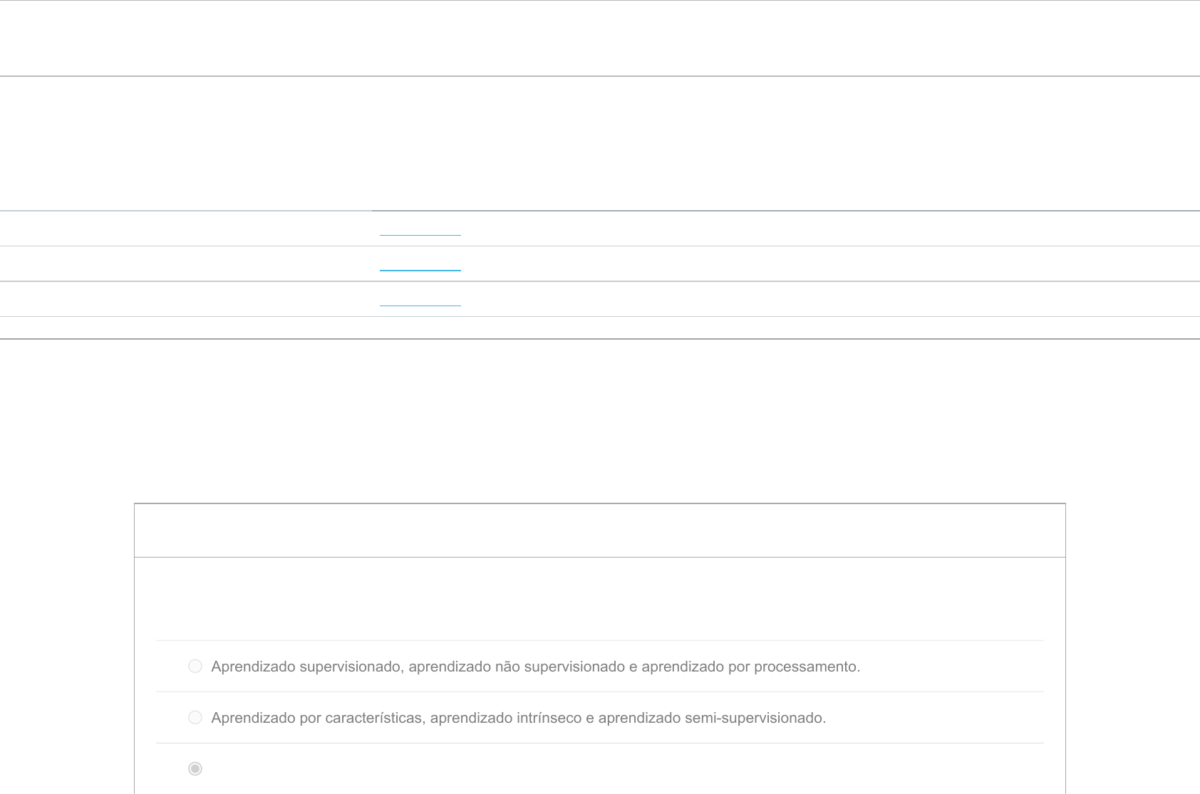 Exercícios de �xação do capítulo 1 Entrega 10 mar em 19:30 Pontos 4 Perguntas 13 Disponível até 10 mar em 19:30 Limite de tempo Nenhum Tentativas permitidas 2 Histórico de tentativas Tentativa Tempo Pontuação MANTIDO Tentativa 2 15 minutos 3,38 de 4 MAIS RECENTE Tentativa 2 15 minutos 3,38 de 4 Tentativa 1 18 minutos 3,38 de 4 As respostas corretas estarão disponíveis em 10 mar em 19:30. Pontuação desta tentativa: 3,38 de 4 Enviado 10 mar em 8:07 Esta tentativa levou 15 minutos. 0,31 / 0,31 ptsPergunta 1 Existem três tipos de aprendizado em Machine Learning. São eles: Aprendizado supervisionado, aprendizado não supervisionado e aprendizado por processamento. Aprendizado por características, aprendizado intrínseco e aprendizado semi-supervisionado. Aprendizado supervisionado, aprendizado não supervisionado e aprendizado por reforço. https://online.igti.com.br/courses/3239/quizzes/30667/history?version=2 https://online.igti.com.br/courses/3239/quizzes/30667/history?version=2 https://online.igti.com.br/courses/3239/quizzes/30667/history?version=1 Aprendizado intrínseco, aprendizado não supervisionado e aprendizado por reforço. 0,31 / 0,31 ptsPergunta 2 Deep Learning é um dos assuntos mais importantes e poderosos em Machine Learning. Podemos definir Deep Learning como: Uma subcategoria do aprendizado de máquina que se baseia em Redes Neurais Artificiais (RNA) para realizar o treinamento. É uma subcategoria das redes neurais que foi desenvolvida para resolver problemas específicos em que redes neurais não puderam ser aplicadas. Aprendizado profundo na qual o algoritmo procura representar o mundo como ele é, independente do problema apresentado. Aprendizagem profunda de redes neurais em que testes em base de dados nunca vistos são feitos e o resultado gerado é encontrado por meio de probabilidades. 0 / 0,31 ptsPergunta 3IncorretaIncorreta Inicialmente, o termo Big Data foi associado a 3 Vs: Velocidade, Variedade e Volume. O termo Velocidade refere-se, principalmente, à: Importância da facilidade de manipular cubos de visualização de dados rapidamente. Rapidez com que os dados se tornam inválidos com o tempo. Existência de um alto fluxo de dados na entrada. Necessidade das aplicações de gerar respostas rapidamente, a partir de grandes massas de dados. A velocidade retrata a rapidez com que os dados são gerados ou atualizados. 0,31 / 0,31 ptsPergunta 4 Machine Learning é um campo importante da inteligência artificial e é amplamente utilizado em diversas disciplinas. Como podemos definir Machine Learning? Machine Learning é um campo de estudo que dá aos computadores a habilidade de aprender sem terem sido programados para tal. Machine Learning é o campo principal de estudo sobre como os humanos podem aprender com os computadores e serem mais eficientes. Machine Learning é uma ciência cuja subárea principal é a inteligência artificial. Machine Learning é um campo de estudo para o qual os computadores são programados explicitamente para aprenderem tarefas. 0,31 / 0,31 ptsPergunta 5 Um termo essencial ao se analisar modelos de aprendizado de máquina é Underfitting. Como podemos definir Underfitting? Taxa de erro alta no conjunto de treinamento e baixa no conjunto de teste. Taxa de erro baixa no conjunto de treinamento e baixa no conjunto de teste. Taxa de erro baixa no conjunto de treinamento e alta no conjunto de teste. Taxa de erro alta no conjunto de treinamento e alta no conjunto de teste. 0 / 0,31 ptsPergunta 6IncorretaIncorreta Um termo essencial ao se analisar modelos de aprendizado de máquina é Overfitting. Como podemos definir Overfitting? Taxa de erro alta no conjunto de treinamento e alta no conjunto de teste. Taxa de erro alta no conjunto de treinamento e baixa no conjunto de teste. Taxa de erro baixa no conjunto de treinamento e baixa no conjunto de teste. Taxa de erro baixa no conjunto de treinamento e alta no conjunto de teste. Um modelo que sofre de overfitting memoriza os dados de treinamento e não abstrai os dados de teste. Dito isso, o modelo apenas fez um fitting dos dados de treinamento e não aprendeu o problema. 0,31 / 0,31 ptsPergunta 7 Árvores de decisão são amplamente utilizadas em Machine Learning. Dada a sua importância, podemos afirmar que as árvores de decisão: Representam o mapeamento de possíveis resultados de uma série de escolhas relacionadas. São formas de representação dos dados em Machine Learning. Com essa representação em forma de árvore dos dados, podemos realizar regressão, classificação e agrupamento de forma estruturada. São uma estrutura que podemos representar vários modelos de inúmeros algoritmos e escolher o que melhor se adequa. Representam o mapeamento de todos os resultados, possíveis e impossíveis de várias escolhas relacionadas. 0,31 / 0,31 ptsPergunta 8 Inicialmente, o termo Big Data foi associado a 3 Vs e posteriormente a 5. Podemos citar como os três principais Vs: Volume, Variedade e Velocidade. Velocidade, Volubilidade e Valor. Veracidade, Volume e Variedade. Volume, Veracidade e Vigência. 0,31 / 0,31 ptsPergunta 9 Quais são as principais áreas que juntas definem Data Science? Ciência da Computação, Estatística e Machine Learning. Ciência da Computação, Matemática e Estatística e Conhecimento do Domínio. Matemática, Estatística e Mineração de Dados. Big Data, Matemática e Inteligência de Negócio. 0,31 / 0,31 ptsPergunta 10 Em Data Analytics temos os conceitos de dados, informação, conhecimento e sabedoria. Considerando que um gestor de uma área visualizou o consumo de um determinado equipamento com o valor de 35 kWh, qual seria o nível desse valor na escala de conhecimento? Conhecimento. Dado. Sabedoria. Informação. 0,31 / 0,31 ptsPergunta 11 Sobre a aprendizagem supervisionada, é INCORRETO dizer que: O sistema é capaz de avaliar se o resultado encontrado está próximo ao resultado correto. Existe previamente um conjunto de dados. 