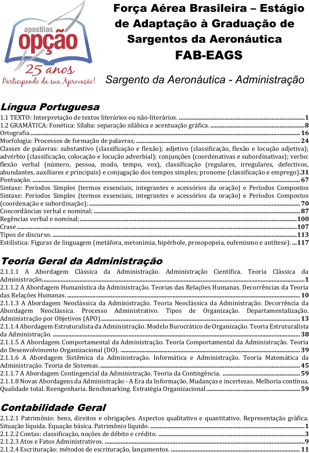 Força Aérea Brasileira – Estágio de Adaptação à Graduação de Sargentos da Aeronáutica FAB-EAGS Sargento da Aeronáutica - Administração Língua Portuguesa 1.1 TEXTO: Interpretação de textos literários ou não-literários. ................................................................................ 1 1.2 GRAMÁTICA: Fonética: Sílaba: separação silábica e acentuação gráfica. ............................................................ 8 Ortografia. ........................................................................................................................................................................... 16 Morfologia: Processos de formação de palavras; ........................................................................................................ 24 Classes de palavras: substantivo (classificação e flexão); adjetivo (classificação, flexão e locução adjetiva); advérbio (classificação, colocação e locução adverbial); conjunções (coordenativas e subordinativas); verbo: flexão verbal (número, pessoa, modo, tempo, voz), classificação (regulares, irregulares, defectivos, abundantes, auxiliares e principais) e conjugação dos tempos simples; pronome (classificação e emprego). 31 Pontuação. .......................................................................................................................................................................... 67 Sintaxe: Períodos Simples (termos essenciais, integrantes e acessórios da oração) e Períodos Compostos Sintaxe: Períodos Simples (termos essenciais, integrantes e acessórios da oração) e Períodos Compostos (coordenação e subordinação); ...................................................................................................................................... 70 Concordâncias verbal e nominal; ................................................................................................................................... 87 Regências verbal e nominal; .......................................................................................................................................... 100 Crase .................................................................................................................................................................................. 107 Tipos de discurso. ........................................................................................................................................................... 113 Estilística: Figuras de linguagem (metáfora, metonímia, hipérbole, prosopopeia, eufemismo e antítese). ... 117 Teoria Geral da Administração 2.1.1.1 A Abordagem Clássica da Administração. Administração Científica. Teoria Clássica da Administração. ...................................................................................................................................................................... 1 2.1.1.2 A Abordagem Humanística da Administração. Teorias das Relações Humanas. Decorrências da Teoria das Relações Humanas. .................................................................................................................................................... 10 2.1.1.3 A Abordagem Neoclássica da Administração. Teoria Neoclássica da Administração. Decorrência da Abordagem Neoclássica. Processo Administrativo. Tipos de Organização. Departamentalização. Administração por Objetivos (APO). .............................................................................................................................. 13 2.1.1.4 Abordagem Estruturalista da Administração. Modelo Burocrático de Organização. Teoria Estruturalista da Administração. ............................................................................................................................................................. 38 2.1.1.5 A Abordagem Comportamental da Administração. Teoria Comportamental da Administração. Teoria do Desenvolvimento Organizacional (DO). .................................................................................................................. 39 2.1.1.6 A Abordagem Sistêmica da Administração. Informática e Administração. Teoria Matemática da Administração. Teoria de Sistemas. ............................................................................................................................... 45 2.1.1.7 A Abordagem Contingencial da Administração. Teoria da Contingência. ................................................. 59 2.1.1.8 Novas Abordagens da Administração - A Era da Informação. Mudanças e incertezas. Melhoria contínua. Qualidade total. Reengenharia. Benchmarking. Estratégia Organizacional............................................................ 59 Contabilidade Geral 2.1.2.1 Patrimônio: bens, direitos e obrigações. Aspectos qualitativo e quantitativo. Representação gráfica. Situação líquida. Equação básica. Patrimônio líquido. .................................................................................................. 1 2.1.2.2 Contas: classificação, noções de débito e crédito. ............................................................................................. 3 2.1.2.3 Atos e Fatos Administrativos. ............................................................................................................................... 9 2.1.2.4 Escrituração: métodos de escrituração, lançamentos. .................................................................................. 11 Apostila Digital Licenciada para Cristina Torres - cristinaaraujo_18@hotmail.com (Proibida a Revenda) - www.apostilasopcao.com.br 2.1.2.5 Razonete e Balancete. .......................................................................................................................................... 17 2.1.2.6 Plano de Contas. ..............................................