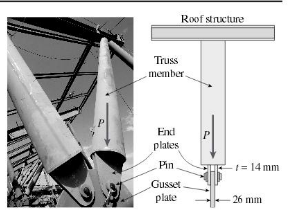 Professor Alberto Dresch Webler Resistencia dos materiais - Lista 7 1) Membros da treliça que sustentam um teto estão conectado a uma placa de suporte de espessura de 26mm através de um pino de 22mm de diâmetro, como mostrado na figura e na foto. As duas placas de extremidade nos membros da treliça têm 14mm de espessura cada. Tradução da figura. Truss Member= Membros da treliça End Plates= Placas da extremidade Pin=Pino Gusset Plate = Placa de suporte a) Se a carga P=80kN, qual é a maior tensão de esmagamento agindo nos pinos? (139,86MPa) b) Se a tensão de cisalhamento máxima para os pinos é de 190Mpa, qual força Pult é necessária para causar falha dos pinos sob cisalhamento? (114kN) 2) O piso superior de um estádio de futebol é sustentado por suportes, cada qual transferindo uma carga de P=700kN à base de uma coluna (veja a parte (a) da figura). Uma “placa de tampa” na parte inferior do suporte distribui as cargas P para 4 “ placa de flange” (tf=25mm) através de um pino (dp=50mm) para duas placas de suporte (tg=38mm) (veja as partes (b) e (c) da figura). Determine as seguintes quantidades. (a) A tensão de cisalhamento média τmédia no pino. (R=89,13MPa) (b) As tensões cortantes médias entre as “placas de flange” e o pino (σbf) e também entre as placas de suporte e o pino (σbg). Desconsidere o atrito entre as placas. 3) Um parafuso com olhal para finalidade especiais, de diâmetro d=12mm, passa através de um furo em uma placa de aço com espessura tp=19mm (veja a figura_ e é segurado por uma porca com espessura t=6mm. A porca hexagonal está pressionada contra a placa de aço. O raio do círculo circunscrito pelo hexágono é r=10mm (o que significa que cada lado do hexágono tem comprimento de 10mm). As forças de tração nos três cabos ligados ao parafuso com olhal são T1=3560N, T2=2448N e T3=5524N. a) Encontre a força resultante que atual no parafuso com olhal.(R=4882N) b) Encontre as tensões de esmagamento médias σb entre a porca hexagonal no parafuso com olha e a placa.(R=33,28MPa) Placa de tampa Placa de flange t f = 25mm) Pino d p = 50mm) Placa de suporte t g = 38mm) b) Detalhe a parte inferior do suporte Placa de tampa Pino d p = 50mm) Placa de flange t f = 25mm) Placa de suporte t g = 38mm) c) Seção através da parte inferior do suporte 700kN c) Determine as tensões médias de cisalhamento τmédia na porca (R=21,58MPa) 4) Uma barra de seção transversal circular rígida é carregada em tração por forças P (veja a figura). A barra tem comprimento L=380mm e diâmetro d=6mm. O material é uma liga de magnésio com módulo de elasticidade E=42,7 GPa. A tensão admissível em tração é σadm=89,6MPa, e o alongamento da barra não deve exceder 0,8mm. Qual é o valor admissível das forças P? (R=2534N esse é menor encontrado. Rpara o alongamento é 2541N) 5) Uma amarra no deque de um veleiro consiste em uma barra dobrada parafusada em ambas as extremidades, como mostra a figura. O diâmetro db da barra é de 6mm, o diâmetro dw das arruelas é de 22mm e a espessura t do deque de fibra de vidro é de 10mm. Se a tensão de cisalhamento na fibra de vidro é 2,1MPa, e a pressão de esmagamento admissível entre a arruela e a fibra de vidro é 3,8MPa, qual é a carga admissível Padm na amarra? (2,674kN para esmagamento e 2,902kN para cisalhamento, logo a carga deverá ser 2,674kN) 6) Um barco salva vidas é sustentado por duas serviolas de navio, como mostra a figura. Um pino de diâmetro d=20mm passa através de cada serviola e sustenta duas roldanas, uma em cada lado da serviola. Cabos presos ao barco salva vidas passam sobre as roldanas e são enroladas a guinchos que suspendem e abaixam o barco. As partes inferiores do cabo são verticais e as superiores fazem a um ângulo alfa=15° com a horizontal. A força de tração admissível em cada cabo é 8 kN e a tensão de cisalhamento admissível nos pinos é 27,5MPa. Se o barco salva vida tem um peso de 6,7kN, qual o peso máximo que deve ser carregado no salva vidas? (R=21kN) Davit= Servioa Pulley=Roldana Pin=Pino Cable=Cabo