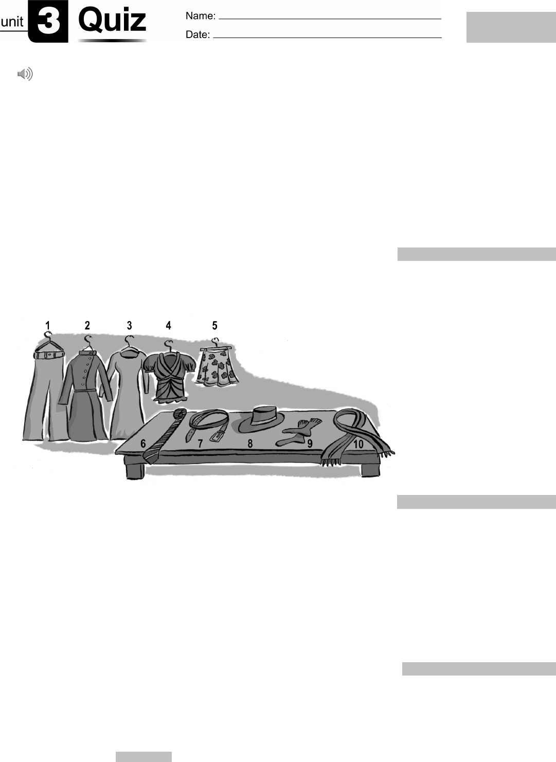 © Cambridge University Press photocopiable Four Corners 1 Unit 3 Quiz 1 A [Track 04] Listen to three conversations. Check () the items you hear in each conversation. 1. a. bag c. laptop e. pens b. book d. notebook f. watch 2. a. book c. laptop e. pens b. cell phone d. notebook f. sunglasses 3. a. bag c. keys e. sunglasses b. cell phone d. notebook f. watch A _______ / 6 points (2 points each) B Look at the clothes in the picture. Write the name of each item on the correct line. B _______ / 10 points (1 point each) C Circle the correct word to complete each answer. 1. A: Is this your wife’s scarf? 4. A: Are these your cameras? B: Yes, it’s her / his / hers. B: No, they aren’t theirs / my / ours. 2. A: Is this Kevin’s cell phone? 5. A: Is this your laptop? B: No, it isn’t theirs / his / hers. B: Yes, it’s my / our / mine. 3. A: Are these Ed and Ann’s books? 6. A: Are these our bags? B: Yes, they’re their / theirs / ours. B: Yes, they’re mine / his / yours. C _______ / 6 points (1 point each) 1. ______________ 2. ______________ 3. ______________ 4. ______________ 5. ______________ 6. ______________ 7. ______________ 8. ______________ 9. ______________ 10. ______________ Total Score _______ / 50 points © Cambridge University Press photocopiable Four Corners 1 Unit 3 Quiz 2 D Look at the pictures and the example. Complete the conversations. Use this, that, these, those, and the correct present forms of be. 1. 2. 3. 4. 1. A: What are those ? 3. A: What ? B: They’re watches . B: . 2. A: What ? 4. A: What ? B: . B: . D _______ / 12 points (2 points each) E Number the lines of the conversation in the correct order. ____ It’s a comb. ____ C-O-M-B. ____ How do you spell that? ____ What’s this called in English? E _______ / 4 points (1 point each) F Read the magazine page. Match the two parts of each sentence. F _______ / 12 points (2 points each) 1. Fernando’s sweater is from ____ a. Ahmed’s. 2. Min’s boots are ____ b. white and brown. 3. The dishdasha is from ____ c. Brazil. 4. The sweater is ____ d. gray and purple. 5. The boots are from ____ e. Saudi Arabia. 6. The dishdasha is ____ f. Peru. 1 2 3 4 5 6