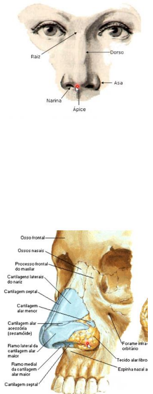Anatomia do Nariz Sistema respiratorio • Ventilação • Fonação Porção condutora + porção respiratória • Porção condutora o Nariz o Seios paranasais o faringe o Laringe o Traqueia o Brônquios • Porção respiratória o Pulmões • Nariz Acima do palato duro Contem órgãos do olfato Parte externa do nariz + cavidade nasal A cavidade do nariz é dividida em- direita e esquerda pelo septo nasal (da base do nariz até as coanas) Conchas nasais- revestidas por mucosa aumento da superfície de contato • Funções -Olfato-órgãos olfatórios que atravessam a lâmina cribiforme do etmoide -Respiração -Filtração de poeira -Umidificação do ar -Recepção e eliminação de secreções • Nariz externo Raiz (entre as orbitas) Dorso- as partes laterais quando se juntam Ápice Base-Narinas + Asas (cartilaginosas, com muitas glândulas sebáceas, revestidas por mucosa) Vestibular-com vibrissas • Esqueleto Osso + Cartilagem Parte óssea- Ossos nasais, processos frontais da maxila, parte nasal do frontal e parte óssea do septo nasal Parte cartilagínea- 5 Cartilagens -Laterais (2) -Alares (2) -Septal (1) (se articula dos 2 lados com as laterais) • Septo nasal Divide a câmara o nariz em duas cavidades nasais Uma parte óssea e um cartilaginosa (garante flexibilidade) Lâmina perpendicular do etmoide + vômer suturas do tipo esquindilese (tipo macho e fêmea) - Vômer etmoidal, esfeno-vomeriana • Cavidade nasal Entrada anterior-narinas Abre-se na parte posterior, na nasofaringe-Coanos Revestida por túnica mucosa, menos o vestíbulo nasal que é revestido por pele Túnica mucosa fortemente aderida ao periósteo e ao pericôndrio (no caso da cartilagem) Túnica mucosa contínua com: Nasofaringe, Seios paranasais, Saco lacrimal Límen do nariz superior a cartilagem septal, acima do vestíbulo • Divisão da cavidade nasal -Vestíbulo nasal-com vibrissas -Porção olfatória -Porcão respiratória-maior parte • Limites cavidades nasal -Superior-ossos frontais + etmoide + esfenoide -Inferior-osso maxilar e osso palatino, além de parte do palato mole -Posterior-coanos -Anterior- Cartilagens, laterais, alares maiores -Laterais- processos nasais da maxila, osso lacrimal, conchas nasais superiora e media, osso concha lâmina perpendicular o palatino O conjunto de células etmoidais formam o labirinto etmoidal • Meatos entre as conchas nasais Superior-entre a concha superior e media Médio-entre a concha nasal media e inferior-com abertura para o seio maxilar(óstio) Inferior-abaixo da concha nasal inferior Comum- entre o septo nasal e as conchas nasais, se estende de anterior para posterior, o maior meato nasal • Conchas nasais Concha nasal superior-maior Concha nasal meia Concha nasal inferior-maior (osso concha) • Seios paranasais -Seio esfenoidal-posterior as células etmoidais o Drenagem-acima a concha nasal superior-recesso esfenoidal -Seios etmoidal-células etmoidais, labirinto etmoidal, até 18 o Drenagem no meato nasal médio -Seios frontais o Drenagem no meato nasal médio -Seios maxilares-maiores o Drenagem no meato nasal médio • Irrigação cavidade nasal 5-Procedencias o Artéria etmoidal anterior e posteriores (ramo da oftálmica- vindas da ACI) o Arteira etmoidal posterior (ramo da ateria oftálmica, vinda da ACI) o Artéria esfenopalatina (ramo da artéria maxila) o Artéria palatina menor (da artéria maxilar) o Ramo septal da artéria labial superior (ramo da artéria facial) Cavidade nasal Inervação o Maxilar-inerva posteriormente ❖ Nervo nasopalatino-septo nasal ❖ Nervo palatino maior- parede lateral o Oftálmico-inerva a região anterossuperior ❖ Nervos etmoidais-septo nasal, anterior e posterior, parede lateral
