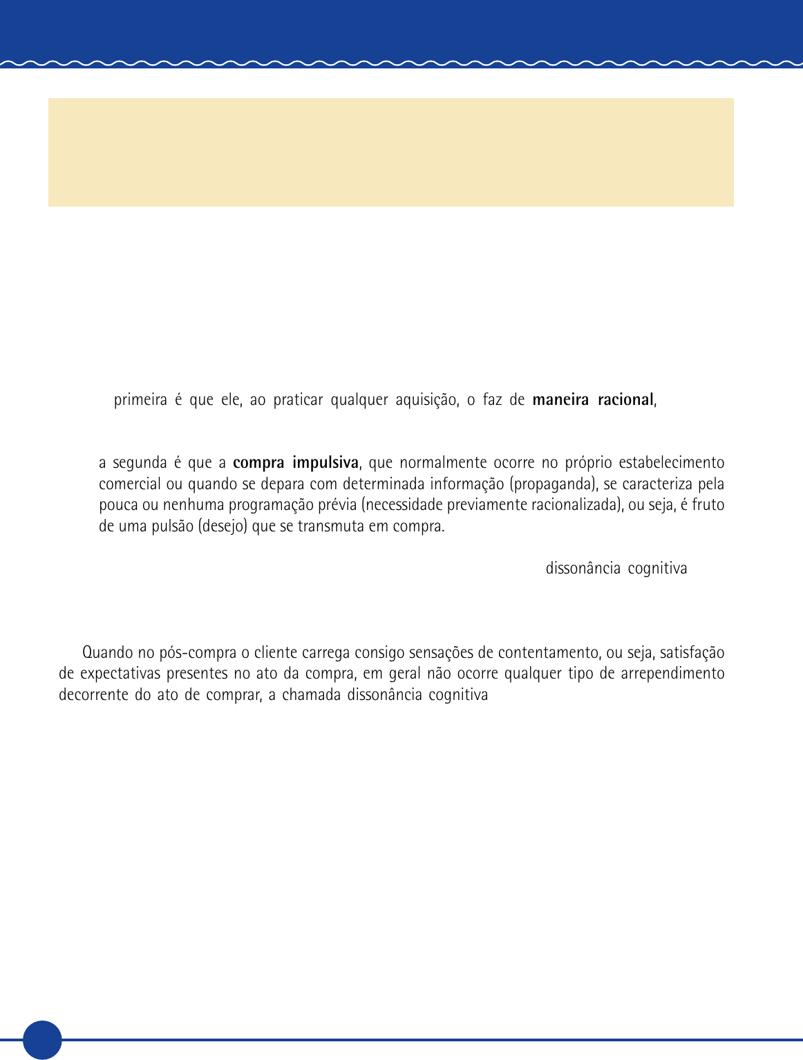 92 Unidade III Unidade III 7 PROCESSO DE COMPRA RACIONAL E IMPULSIVA E O ARREPENDIMENTO PÓS-COMPRA As relações entre clientes e organizações são palco para muitas discussões, entre elas estão os motivos que levam os indivíduos a praticarem uma compra e as formas como o fazem. Pelo menos duas condições são fundamentais para se compreender o processo de compra de um cliente: • a primeira é que ele, ao praticar qualquer aquisição, o faz de maneira racional, portanto, programada e geralmente baseada em necessidades claramente definidas; • a segunda é que a compra impulsiva, que normalmente ocorre no próprio estabelecimento comercial ou quando se depara com determinada informação (propaganda), se caracteriza pela pouca ou nenhuma programação prévia (necessidade previamente racionalizada), ou seja, é fruto de uma pulsão (desejo) que se transmuta em compra. Outro importante momento decorrente da compra por impulso é a dissonância cognitiva, cuja importância para os gestores e profissionais de marketing está ligada ao conhecimento das sensações e relações de mundo que o cliente tem ou desenvolve após o ato de compra. Quando no pós-compra o cliente carrega consigo sensações de contentamento, ou seja, satisfação de expectativas presentes no ato da compra, em geral não ocorre qualquer tipo de arrependimento decorrente do ato de comprar, a chamada dissonância cognitiva. Porém, se, ao contrário, depois de fechar um negócio o cliente tem pensamentos negativos sobre a aquisição que fez, levando-o a uma sensação de arrependimento, está em processo de dissonância cognitiva. Essa é uma ocasião em que nenhum profissional de vendas gostaria de estar perto de um cliente, pois certamente ouviria muitas observações negativas e possíveis reclamações. Então, já se sabe que a compra racional é realizada com base na razão (geralmente governada pela necessidade) e que a compra por impulso é uma compra orientada pela emoção (geralmente governada por um impulso momentâneo). O que é, então, a dissonância cognitiva e por que é importante que sua ocorrência seja minimizada? Falaremos melhor sobre isso a partir de agora. 7.1 Dissonância cognitiva A expressão dissonância cognitiva é proveniente dos estudos de Festinger (1957), com a obra A theory of cognitive dissonance e, desde então, muitas discussões sobre o assunto tomaram corpo. No campo da administração, a pauta ficou enquadrada em marketing por seu empenho em relacionar as atividades jefersoncarvalhoalvarenga Realce jefersoncarvalhoalvarenga Realce jefersoncarvalhoalvarenga Realce jefersoncarvalhoalvarenga Realce 93 ADMINISTRAÇÃO D0 RELACIONAMENTO COM O CLIENTE organizacionais às atividades individuais dos clientes e consumidores, bem como pela aproximação do marketing com os discursos sociológico, psicológico e antropológico, além do filosófico, tudo num conjunto de variáveis que contemplam vantagens para as duas partes (clientes e organizações) e que, para serem atingidas, demandam interação e conhecimento entre as partes. Segundo Festinger (1957), a dissonância cognitiva refere-se exatamente ao processo final cognitivo e emocional de verificação da diferença entre o que se esperada e o que ocorreu. Porém, para Giglio (2002), Festinger apresentou o conceito de maneira ampla, incluindo toda e qualquer discordância entre as ações (o corpo em ação), a ideia (o mundo de ideias) e a ética do sujeito (código de ética de relações). A existência da dissonância cognitiva após o consumo cria um ambiente psíquico (predisposição) para o surgimento de julgamentos negativos em relação ao produto ou serviço, o que interfere na etapa imediatamente anterior à compra (GIGLIO, 2002), interferência que pode ser entendida como risco porque pode evitar que o cliente repita a compra do produto consumido, ou ainda, o que é pior, fazer com que ele não compre mais o produto em determinado estabelecimento – escolhendo um concorrente. De acordo com Zambon e Benevides (2003), a dissonância ocorre quando o consumidor faz uma comparação dos resultados da compra com o pós-compra, e as expectativas que a originaram, e vê o seu julgamento primário, reduto de uma expectativa de como o produto deveria ser, transformar-se em uma negação daquele que fora adquirido, baseado em uma depreciação clara e consciente do que se adquiriu versus o que se esperava. Observação A dissonância cognitiva pode ainda acontecer por meio de um sentimento de arrependimento comparativo, quando o consumidor percebe que, se não tivesse comprado alguma coisa, por mais útil que ela seja, poderia adquirir uma outra que talvez fosse mais importante ou interessante, ou então teria, por exemplo, dinheiro para aplicar em poupança ou num investimento imobiliário, fazer uma viagem internacional etc. 7.2 Abordagens da compra por impulso Segundo Zambon e Benevides (2003) e Silva e Zambon (2015), a compra por impulso expressa os elementos manifestos ou latentes de desejo dos consumidores sobre os quais os profissionais de marketing empenham seus esforços para desenvolver ações mercadológicas que maximizem o desejo de consumir e, portanto, o ato de comprar. Por sua vez, a dissonância cognitiva é o oposto daquilo que os profissionais de marketing desejam. Assim, todos os esforços possíveis são empenhados para que a dissonância não aconteça, pois ela é um elemento/manifestação psicológico que prejudica a recompra do produto ao gerar na mente do consumidor a nefasta sensação de que fez um mau negócio. É um sentimento de negação sobre a compra realizada. jefersoncarvalhoalvarenga Realce jefersoncarvalhoalvarenga Realce jefersoncarvalhoalvarenga Realce jefersoncarvalhoalvarenga Realce 94 Unidade III Para Almeida e Jolibert (1993), na busca por maiores esclarecimentos conceituais sobre a compra por impulso no tocante aos riscos de se ouvirem os clientes, foram identificadas três