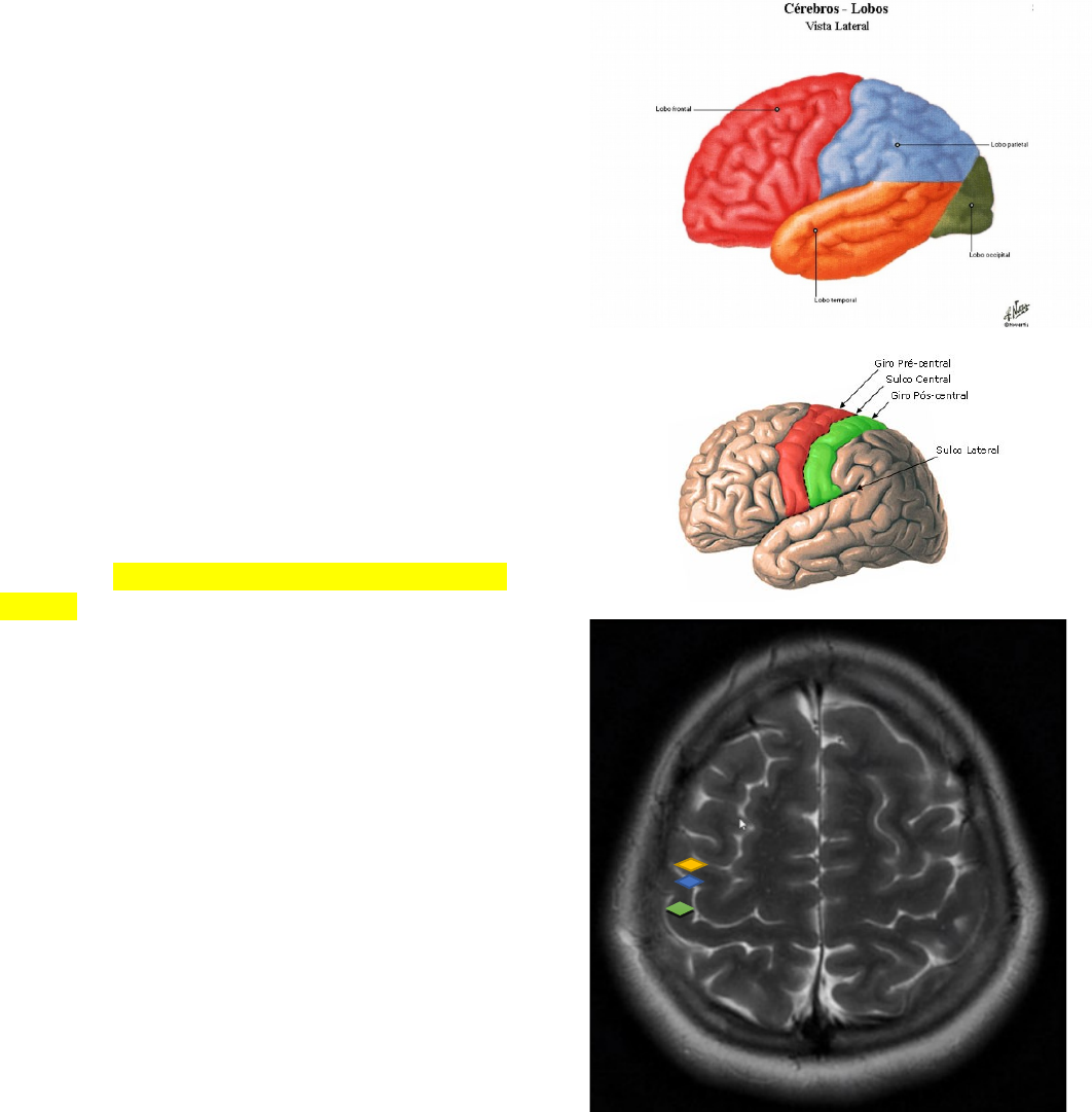anatomia macroscópica do sistema nervoso central Sistema nervoso central O SNC é composto pelo encéfalo e pela medula espinal. A medula espinal se conecta com o encéfalo pelo forame magno do occipital e está envolvida pelos ossos da coluna vertebral. Encéfalo O encéfalo é formado pelo telencéfalo, cerebelo e tronco encefálico. O telencéfalo inclui os hemisférios, separados pela fissura longitudinal, e os núcleos da base. Cada hemisfério é dividido em 4 lobos; cada lobo está relacionado com o osso subjacente de mesmo nome. O sulco central separa os lobos frontais dos lobos parietais. O sulco lateral separa o lobo temporal dos lobos frontais e parietais. O sulco parieto-occipital separa o lobo occipital do temporal e parietal. Lobo frontal Possui 3 sulcos principais: · Sulco pré-central · Sulco frontal superior · Sulco frontal inferior Entre o sulco central e o sulco pré-central temos o giro pré-central, onde se localiza a principal área motora do cérebro. Acima do sulco frontal superior, tem-se o giro frontal superior, abaixo giro frontal médio e mais abaixo o giro frontal inferior divide-se em 3 partes: orbicularis, operculares e triangularis, os dois últimos formam a área de broca, cuja função é a articulação de palavras. Uma lesão na área de broca leva a disartria ou outras repercussões. Lobo temporal Possui dois sulcos principais: · Sulco temporal superior · Sulco temporal inferior Entre esses sucos temos 3 giros: giro temporal superior, médio e inferior. Lobo parietal e occipital O lobo parietal apresenta dois sulcos principais: · Sulco pós central · Sulco intraparietal Entre o sulco pós central e o central tem-se o giro pós central, área de função sensitiva (área somestésica). O giro intraparietal e o giro angular estão no lóbulo temporal inferior. O lobo occipital ocupa uma parte pequena dorsolateral, onde apresenta pequenos sulcos e giros. Ínsula Afastando-se os lábios do sulco lateral, verifica-se a insula. A insula tem forma cônica e possui alguns sulcos e giros, como: sulco circular da insula, sulco central da insula, giros curtos e giro longo da insula. Giro pré central função motora Sulco central sinal do ômega (área motora da mão) Giro pós central função sensitiva – já faz parte do lobo parietal Na parte occipital do encéfalo tem-se o sulco calcarino: Uma lesão a nível de sulco calcarino gera repercussão visual. A área de wernicke está posterior ao giro temporal superior, uma lesão nessa área leva a um desentendimento da linguagem (a pessoa fala, mas não entende). As amígdalas são duas estruturas do sistema límbico que estão relacionadas com as reações emocionais e aprendizagem de conteúdos emocionais. O hipocampo é uma parte do sistema límbico que tem papel vital na aprendizagem e consolidação da memória. Uma lesão a nível de hipocampo impossibilita o individuo de criar novas memórias. Sistema ventricular do encéfalo e LCS O líquido cerebrospinal (LCS) é secretado pelas células dos plexos corióideos nos ventrículos. Os ventrículos laterais, primeiro e segundo, são os maiores e ocupam grandes áreas dos hemisférios cerebrais. Cada ventrículo lateral abre-se, através de um forame interventricular, para o terceiro ventrículo, que é contínuo com o aqueduto de sylvius, que une o terceiro ao quarto ventrículo. Esquema do percurso do LCS pelos ventrículos Plexo coroide LCS ventrículos laterais forames interventriculares terceiro ventrículo aqueduto de sylvius quarto ventrículo espaço subaracnoide E cisternas interpeduncular e colicular. Função do LCS Juntamente com as meninges e calvária (ossos), o LCS protege o encéfalo, amortecendo traumas encefálicos. No espaço subaracnoide, permite que o encéfalo flutue, o que impede que seu peso comprima os nervos cranianos e vasos sanguíneos. Doutrina de Monro-Kellie Essa regra diz que qualquer modificação do volume do conteúdo intracraniano (tumores, sangue, etc.) alterará a pressão intracraniana. O volume do crânio é comparado com uma caixa fechada, na qual o conteúdo interno só será alterado se houver deslocamento ou substituição do LCS