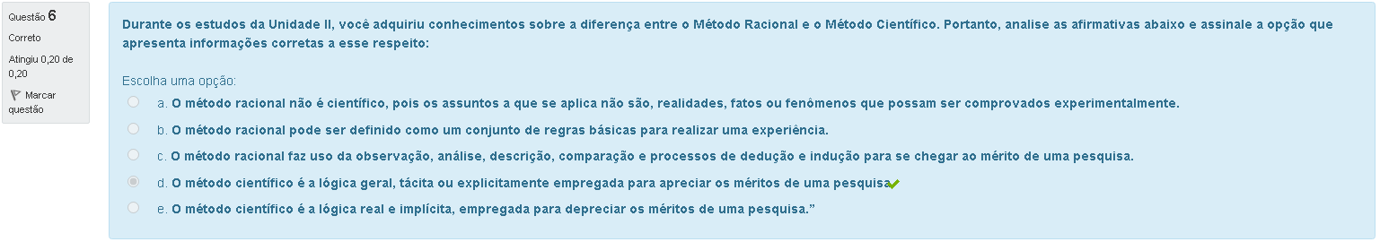 Durante os estudos da Unidade II, você adquiriu conhecimentos sobre a diferença entre o Método Racional e o Método Científico