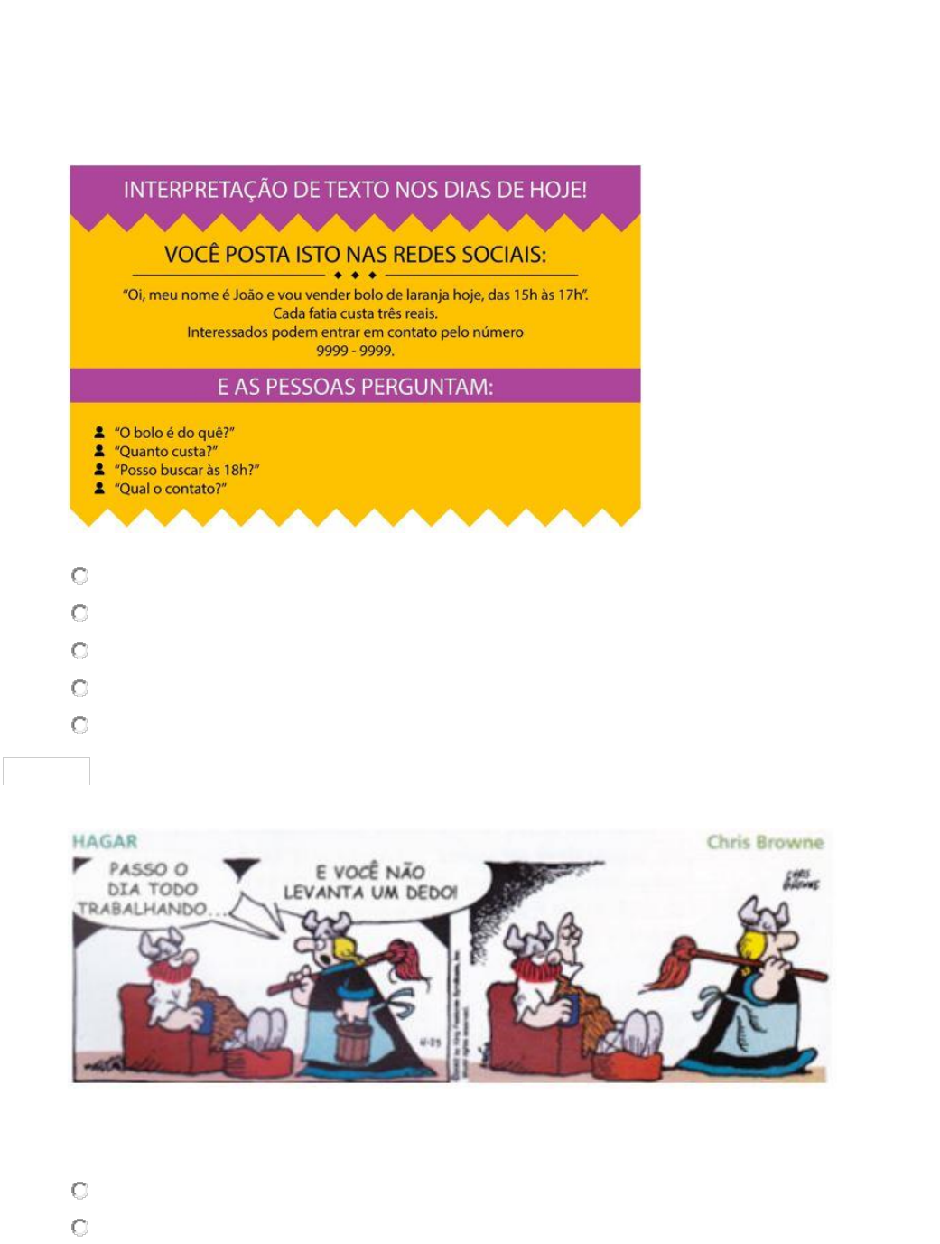 TELEAULA 1 PERGUNTA 1 1. Para o significado de suas comunicações, as pessoas recorrem a estratégias textuais que organizam as informações para que o receptor entenda, mas para isso é necessário conhecer o código em que a mensagem está sendo veiculada. Desse modo, considerando a figura, identifique uma ordem das etapas de leitura para entender a mensagem a seguir: Fonte: Grupo Unip – Objetivo. a. Decodificação e codificação. b. Compreensão e interpretação. c. Interpretação e compreensão. d. Construção e desconstrução. e. Desconstrução e construção. 0 pontos PERGUNTA 2 1. Fonte: SARMENTO, L. L. Oficina de redação. 3. ed. São Paulo: Moderna, 2006, p. 112. Na tirinha, quando Helga fala “E você não levanta um dedo”, é correto afirmar que a resposta do Hagar é tomada em seu sentido: a. Conotativo. b. Denotativo. c. Investigativo. d. Conjuntivo. e. Nominativo. 0 pontos PERGUNTA 3 1. Fonte: BECK, A. Armandinho. São Paulo: Matrix, 2017, p. 27. Considerando-se a situação de comunicação comum do gênero contos de fadas e o contexto específico da contação de histórias infantis, o termo “agrotóxico” tem função predominantemente no contexto de: a. Obra de arte. b. Agricultura. c. Indústria. d. Medicina. e. Esportes. 0 pontos PERGUNTA 4 1. Fonte: SARMENTO, L. L. Oficina de redação. 3. ed. São Paulo: Moderna, 2006, p. 416. A noção de gêneros textuais é apoiada em práticas sociais e em saberes socioculturais, porém podem sofrer variações, na medida em que um texto representativo de um gênero pode incorporar outras características. Desse modo, considerando o anúncio, indique a exemplificação: a. Sustentabilidade. b. Informatividade. c. Intertextualidade. d. Solidariedade. e. Aplicabilidade.