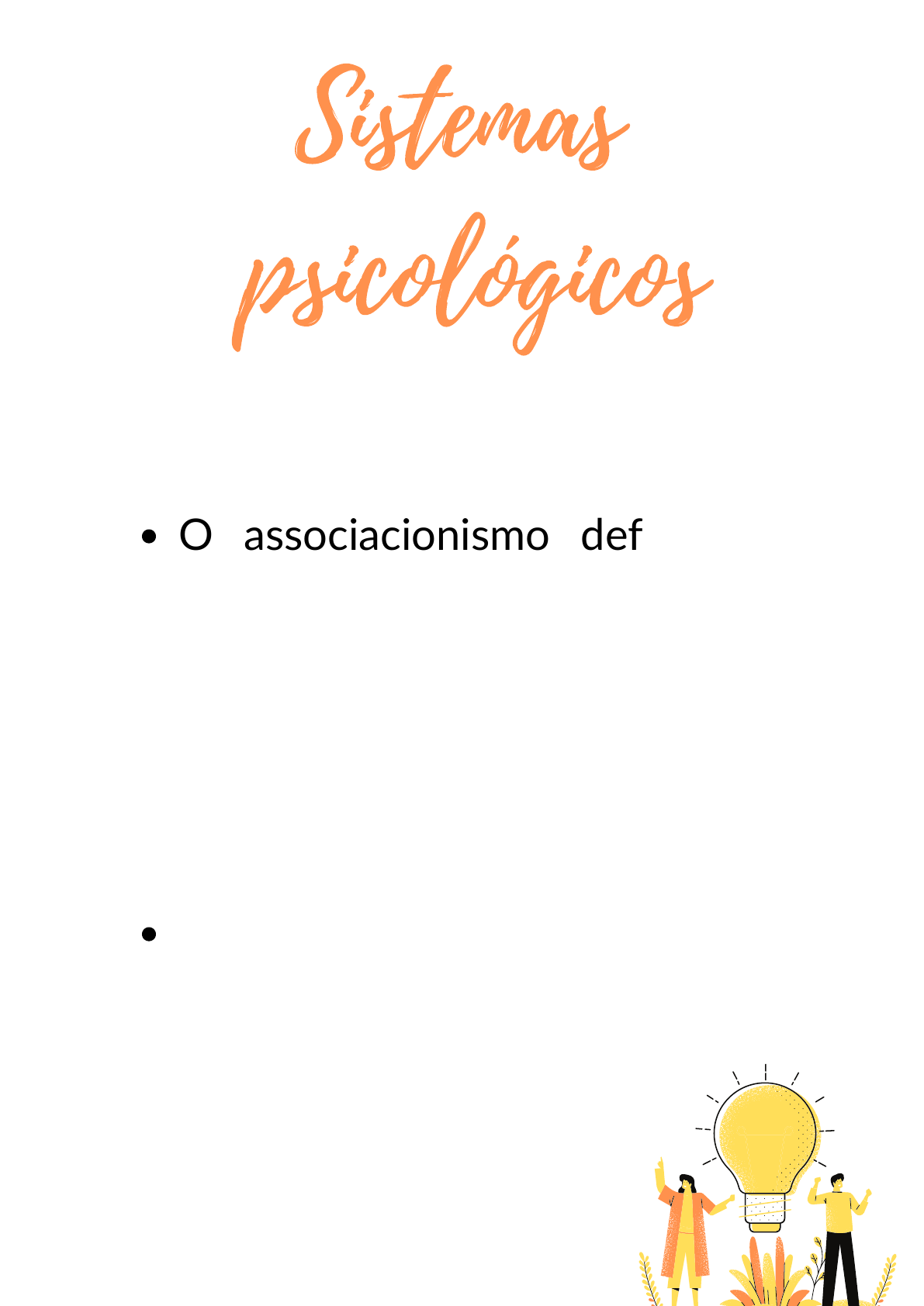 Sistemas psicológicos O associacionismo defende a ideia de que a aprendizagem se dá a partir de um processo de associações de ideias, que vão das mais simples para as mais complexas Edward Thorndike foi o principal representante do associacionismo Associacionismo (1880) Sistemas psicológicos Estruturalismo (1880) O estruturalismo é o estudo da consciência, dos conteúdos mentais e da forma que as ideias são administradas No estruturalismo o método introspectivo (observação) era utilizado para o desenvolvimento de sua teoria Wilhelm Wundt e Edward Titchener foram os principais representantes do estrturalismo Sistemas psicológicos Funcionalismo (1880) A teoria do funcionalismo estuda o funcionamento da mente humana e o uso que o organismo faz da mente para se adaptar ao ambiente William James foi o principal percursos do funcionalismo