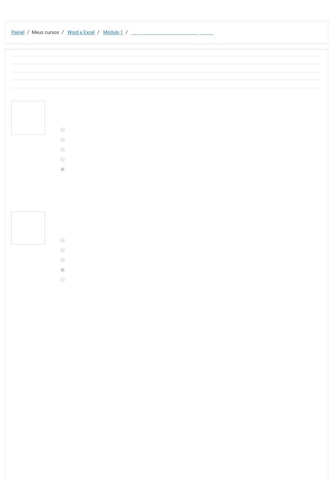 Painel / Meus cursos / Word e Excel / Módulo 1 / 1.4 Questionário Avaliativo - 25 pontos Questão 1 Completo Atingiu 2,50 de 2,50 Questão 2 Completo Atingiu 2,50 de 2,50 Iniciado em domingo, 7 mar 2021, 18:56 Estado Finalizada Concluída em domingo, 7 mar 2021, 19:12 Tempo empregado 16 minutos 42 segundos Avaliar 25,00 de um máximo de 25,00(100%) Qual a função da Tecla Backspace no Word? Escolha uma: a. Alterar o texto para maiúsculo b. Justificar c. Abrir um arquivo d. Salvar um arquivo e. Apagar um carácter à esquerda do cursor. Sua resposta está correta. Qual a função do atalho do teclado CTRL+J no Word? Escolha uma: a. Deixar o texto em negrito b. Copiar o texto selecionado c. Alinha a esquerda ou direita d. Justificar o texto selecionado e. Apagar um carácter à esquerda do cursor Sua resposta está correta. http://ava.qualificar.es.gov.br/my/ http://ava.qualificar.es.gov.br/course/view.php?id=642 http://ava.qualificar.es.gov.br/course/view.php?id=642#section-1 http://ava.qualificar.es.gov.br/mod/quiz/view.php?id=28294 Questão 3 Completo Atingiu 2,50 de 2,50 Questão 4 Completo Atingiu 2,50 de 2,50 Questão 5 Completo Atingiu 2,50 de 2,50 Sobre qual dos principais componentes da tela principal do Word o trecho abaixo está se referindo? “Esta barra permite acesso rápido para alguns comandos que são executados com frequência: como iniciar um novo arquivo, salvar um documento, desfazer e refazer uma ação, entre outros” Escolha uma: a. Barra de referências b. Barra de título c. Barra de ferramentas de acesso rápido d. Barra de texto e. Faixa de opções Sua resposta está correta. Qual a função da Tecla Tab no Word? Escolha uma: a. Salvar um arquivo b. Justificar c. Abrir um arquivo d. Apagar um carácter à direita do cursor e. Definir tabulação Sua resposta está correta. Quais as opções de alinhamento de texto no Word? Escolha uma: a. Espaçamento b. Tamanho 12 e Fonte Arial c. Alinhar à esquerda, centralizar, alinhar à direita e justificar. d. Calibri e Arial e. Tamanho 11 e Fonte Calibri Sua resposta está correta. Questão 6 Completo Atingiu 2,50 de 2,50 Questão 7 Completo Atingiu 2,50 de 2,50 Questão 8 Completo Atingiu 2,50 de 2,50 Questão 9 Completo Atingiu 2,50 de 2,50 O Word é um editor de: Escolha uma: a. Texto b. Apresentação c. Vídeo d. Planilha e. Imagem Sua resposta está correta. Quais são as guias da faixa de opções? Escolha uma: a. Página de texto, Inserir, Revisão, Pincel de Formatação e Negrito b. Página de imagem, Correspondências, Exibição e Sublinhado c. Página inicial, Inserir, Design, Layout de Página, Referências, Correspondências, Revisão e Exibição d. Barra de ferramentas de acesso rápido e. Cor de página, Idioma, Referência e Exibição Sua resposta está correta. Qual a função do atalho do teclado CTRL+C no Word? Escolha uma: a. Justificar b. Deixar o texto em Itálico c. Copiar o texto selecionado d. Deixar o texto em negrito e. Apagar um carácter à esquerda do cursor. Sua resposta está correta. Qual o nome da ferramenta que possibilita alterar o tamanho da tela inicial do Word? Escolha uma: a. Gráfico b. Imagem c. Zoom d. Tabela e. Cabeçalho e Rodapé Sua resposta está correta. Questão 10 Completo Atingiu 2,50 de 2,50 Qual a função da Tecla Delete/del no Word? Escolha uma: a. Abrir um arquivo b. Justificar c. Salvar um arquivo d. Alinhar a esquerda e. Apagar um carácter à direita do cursor. Sua resposta está correta. ← 1.3 Saiba+ Seguir para... 2.1 Videoaulas → http://ava.qualificar.es.gov.br/mod/page/view.php?id=28293&forceview=1 http://ava.qualificar.es.gov.br/mod/book/view.php?id=28296&forceview=1